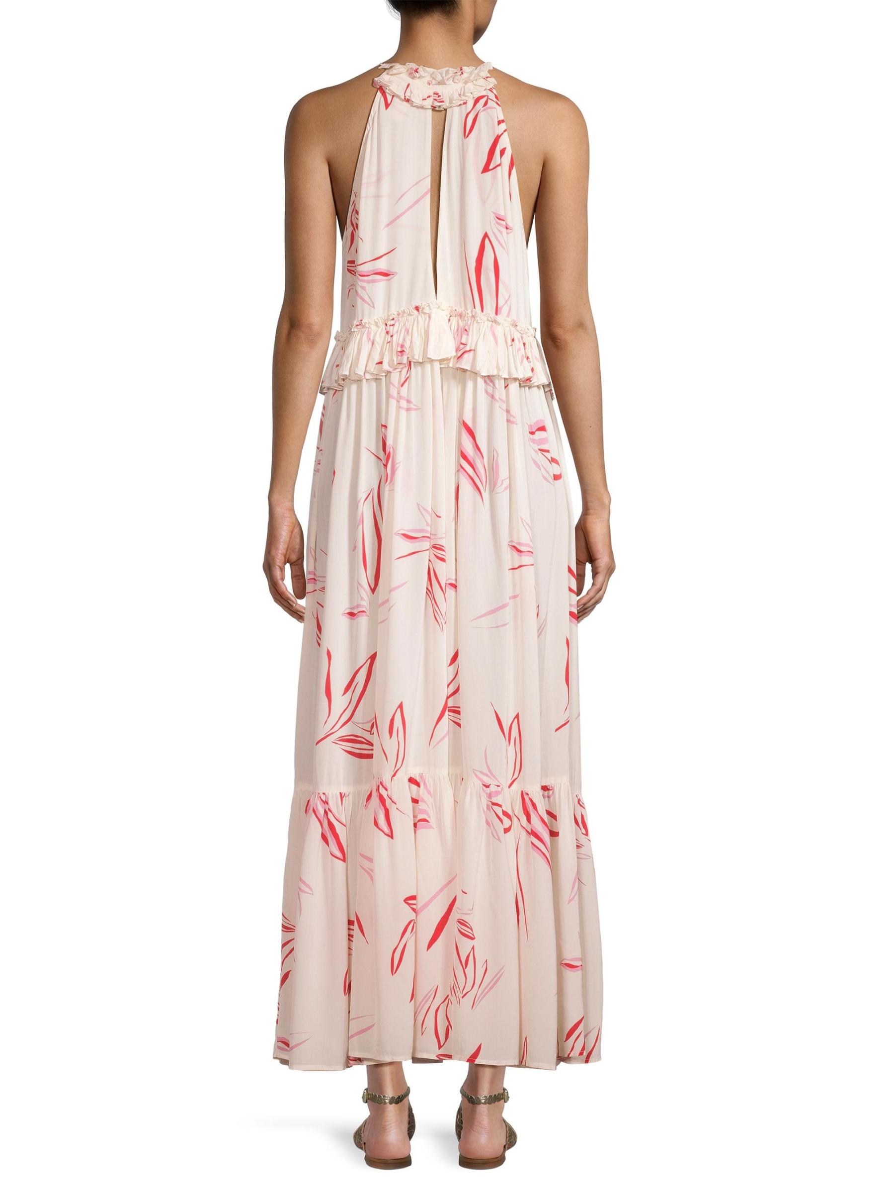 من مجموعة Summer Reverie. فستان أليجرا ماكسي بفتحة المفتاح من Evarae مصنوع من الكريب دي تشاين. يتميز هذا الطراز برقبة رسن وأكتاف مقصوصة وتقليم مكشكش.