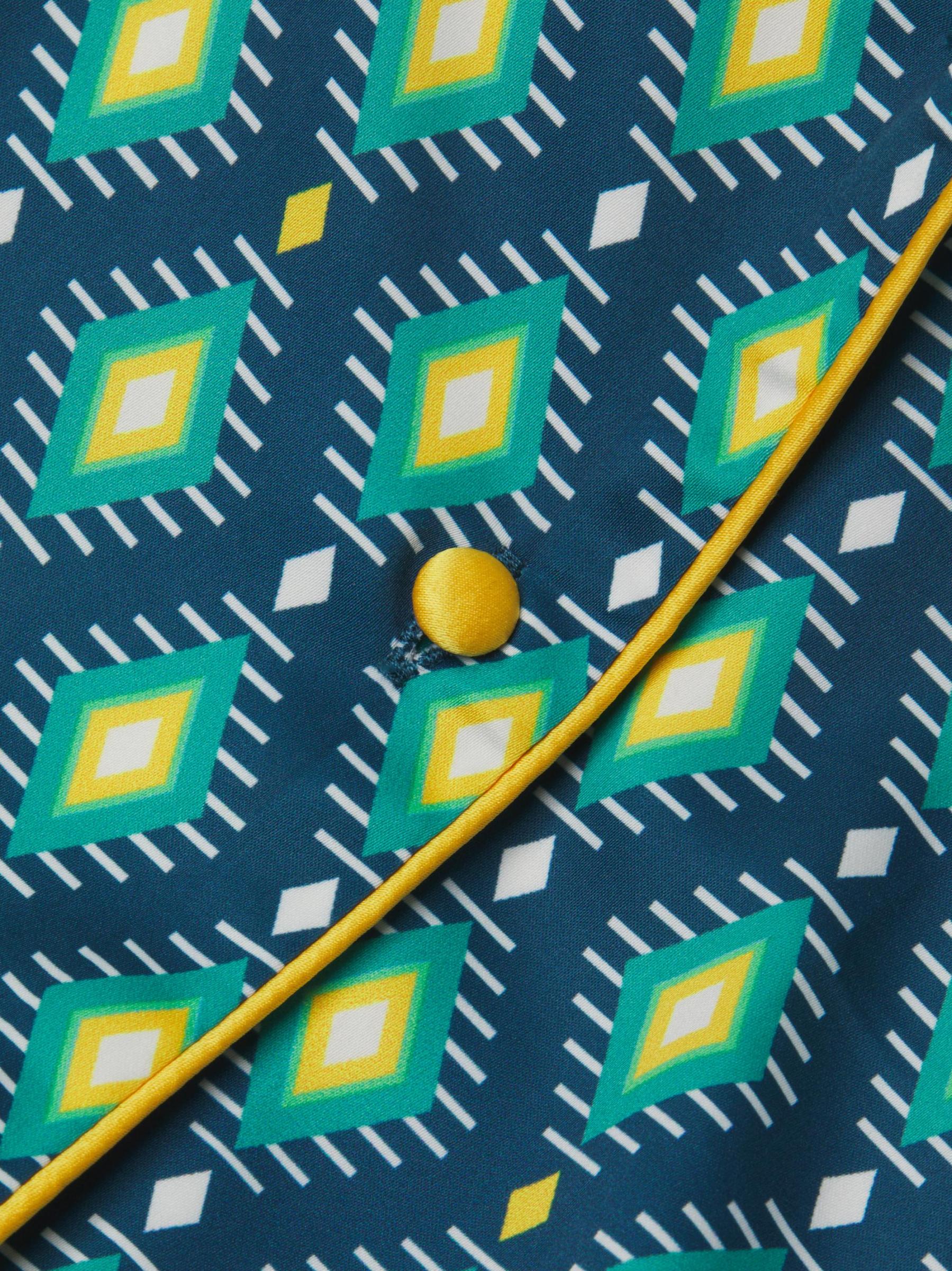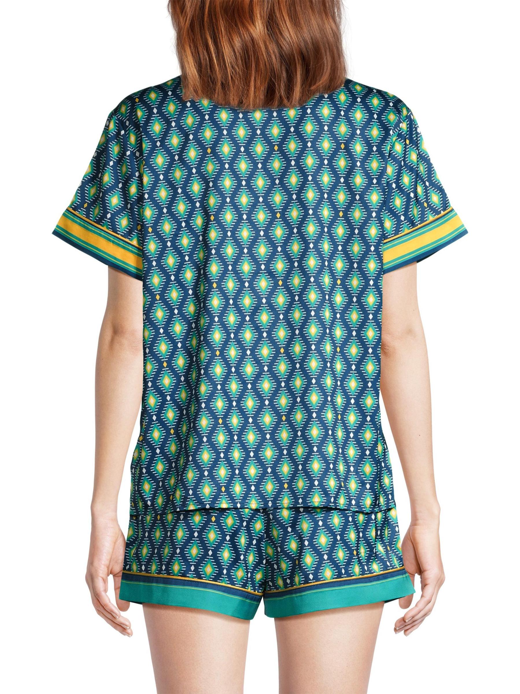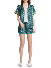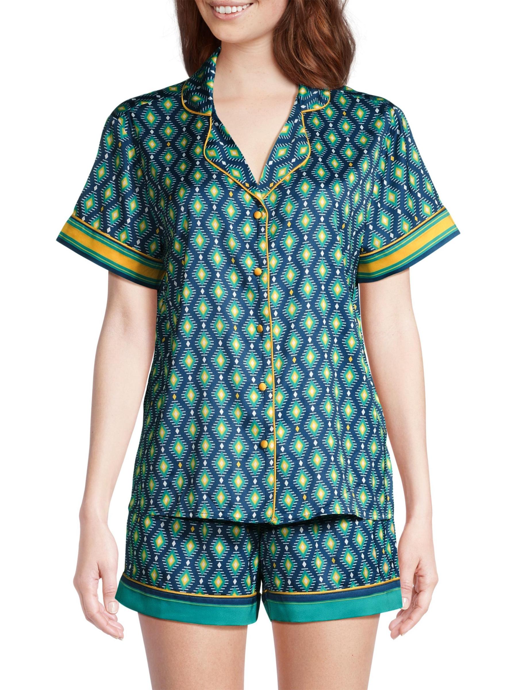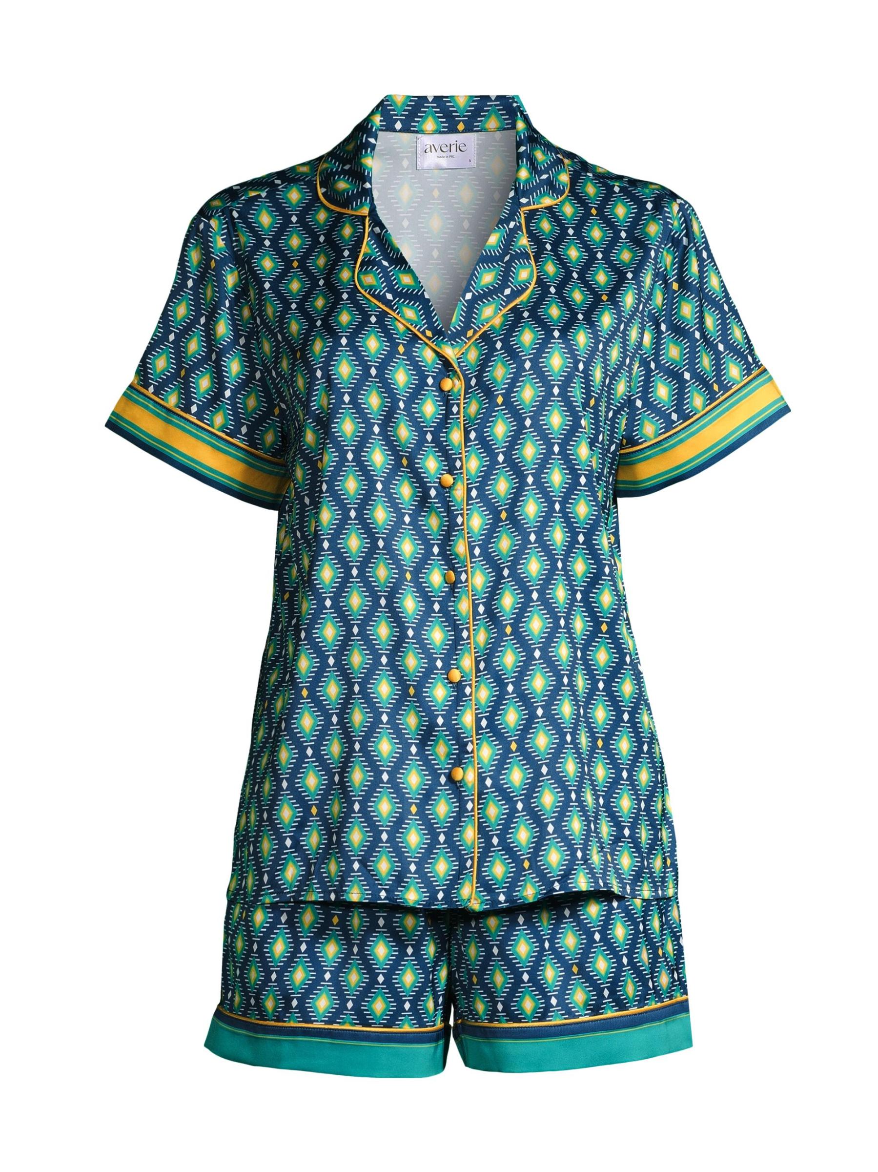 من مجموعة صن سيت أوشن ديب. توفر هذه البيجامات من Averie Sleep بلوزة وشورتًا مريحًا، مما يجعلها مجموعة مريحة وأنيقة مع أزرار أمامية وتفاصيل ياقة وأطراف أكمام وحزام خصر قابل للتعديل برباط وطبعة ساحرة مرسومة يدويًا على القماش الناعم والناعم. 100% بوليستر. غسيل يدوي. مستوردة.