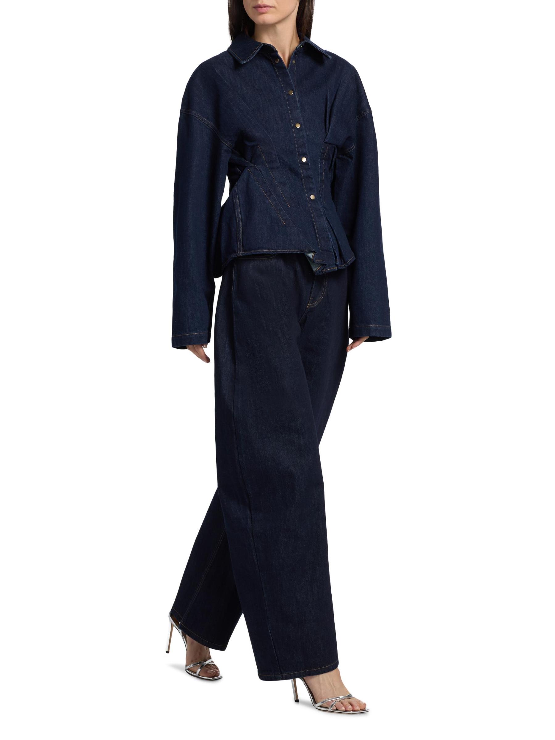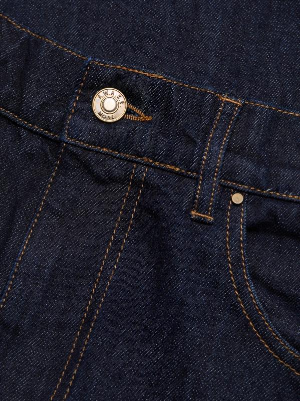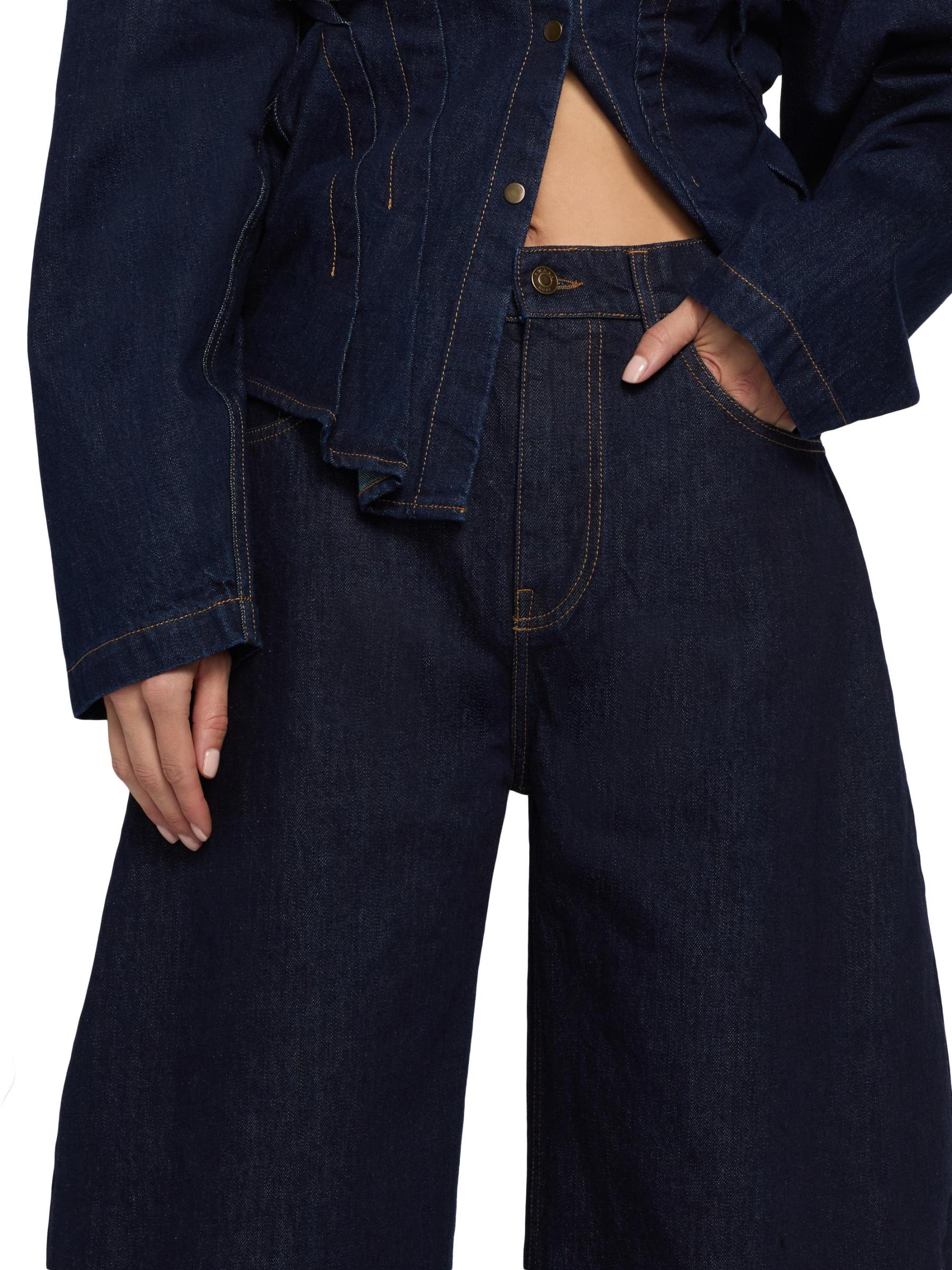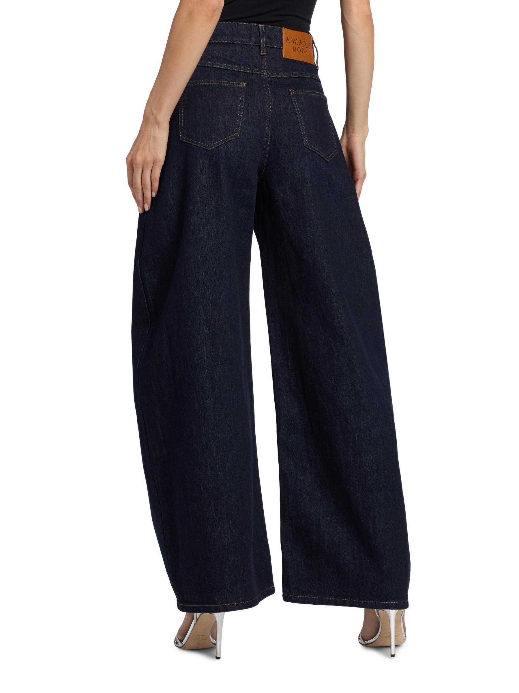 تم تصميم هذا الجينز القطني الصلب ذو الخمسة جيوب من A.W.A.K.E. Mode مع صورة ظلية مثيرة كبيرة الحجم واسعة الساق وخياطة متباينة.