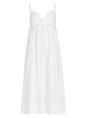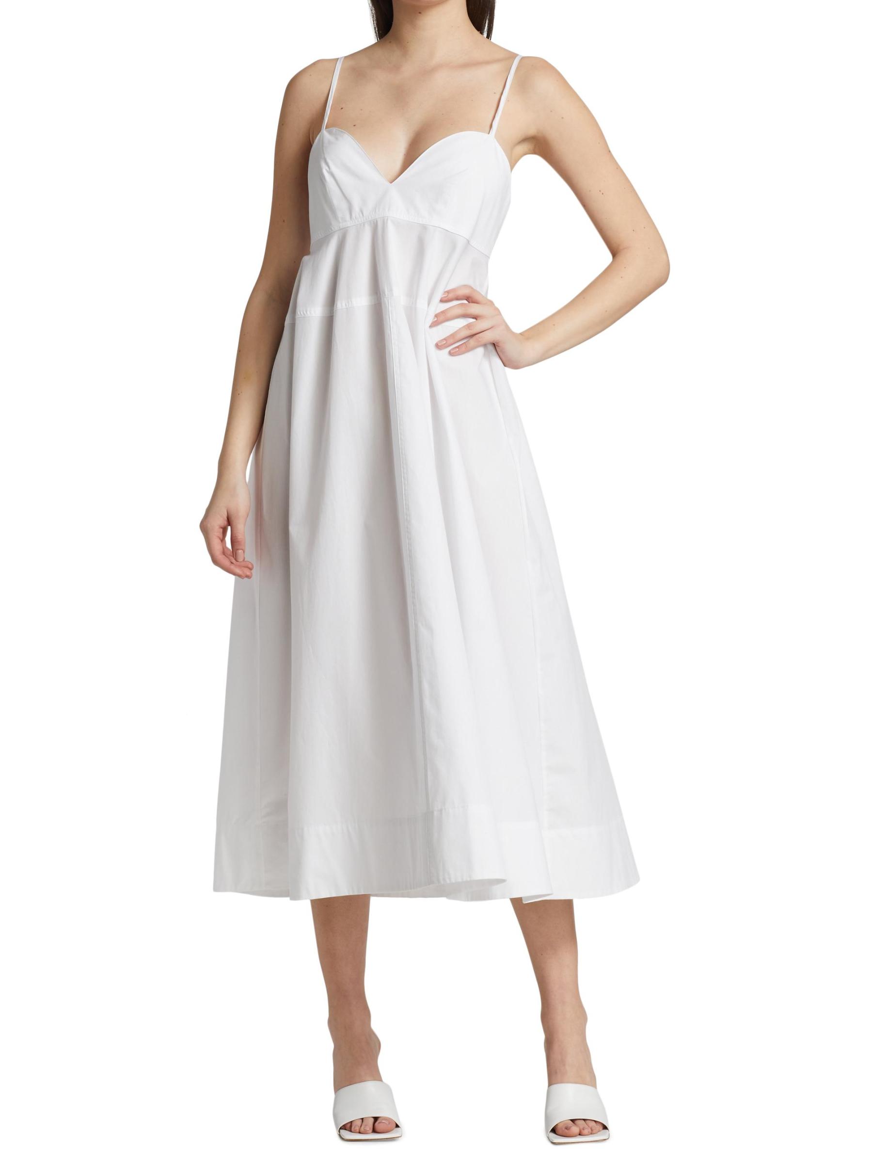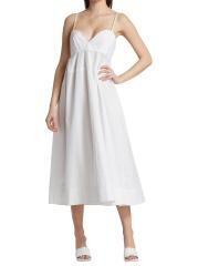 يتميز هذا الفستان المتوسط بخصر إمبراطوري من Matthew Bruch، المصنوع من البوبلين القطني، بتقويرة رومنسية وتنورة مجمعة. تم الانتهاء من هذا النمط الهوائي بأحزمة سباغيتي قابلة للتعديل.