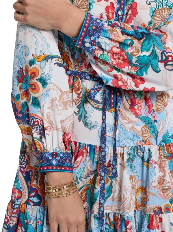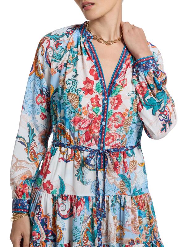 من مجموعة سيدني. صُنع هذا الفستان القصير من سيدني على شكل حرف A من روبرت غراهام من مزيج الحرير اللامع، ويتميز بياقة منقسمة وأكمام طويلة وخصر برباط.رقبة منقسمة أساور بأزرار بأكمام طويلة حزام ربط ذاتي جيوب جانبية على درزات إغلاق بأزرار أمامية 70% فيسكوز/ 30% حرير يُغسل في الغسالة مستوردة