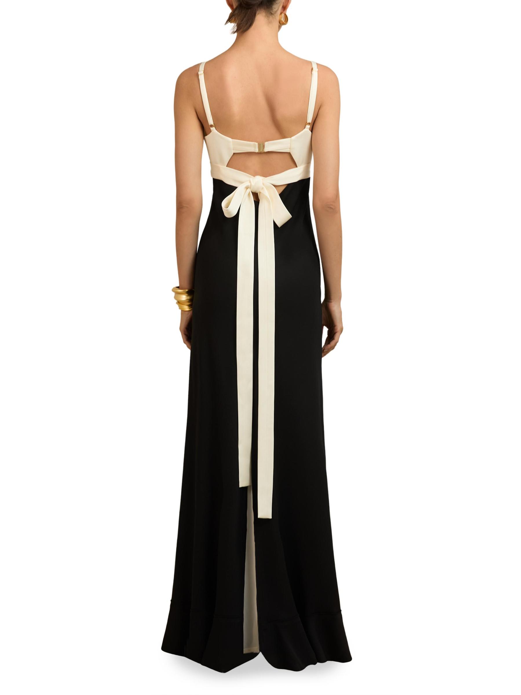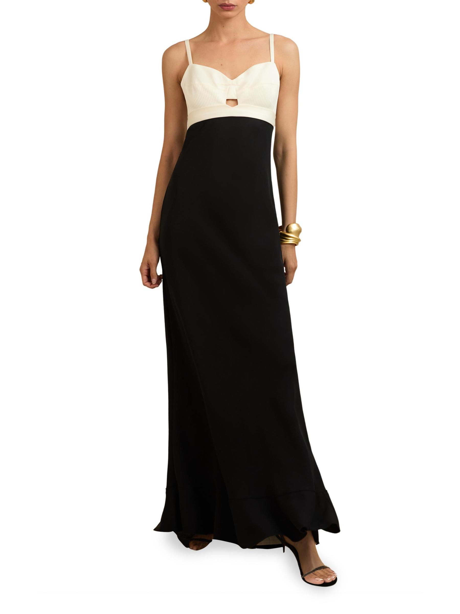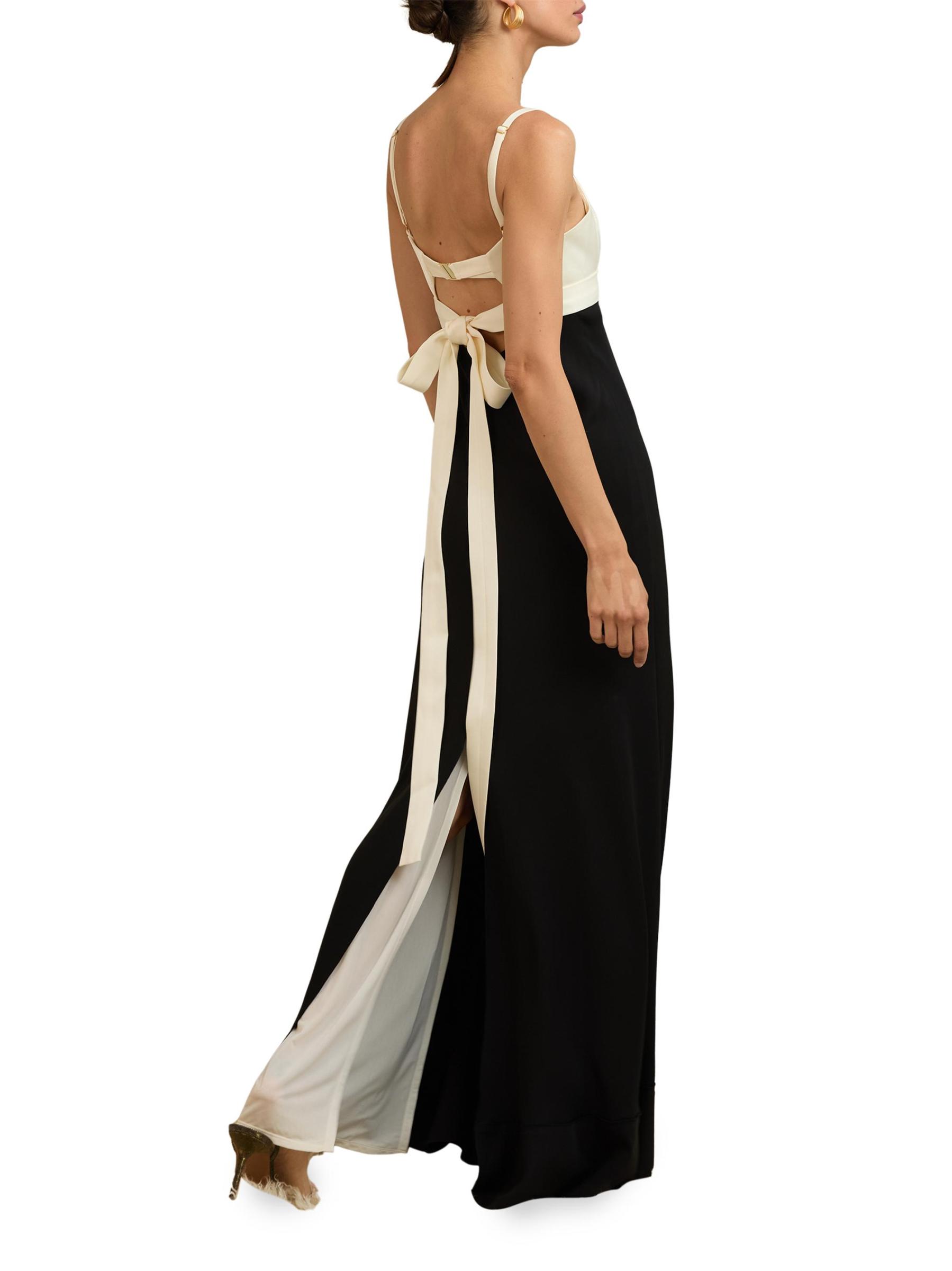 يتميّز فستان سيلفي الطويل المحفور بالألوان من Reiss Atelier بتصميم أنيق على شكل حرف A، ويتميز بصدّار بفتحة مفتاح وإغلاق خلفي برباط ذاتي. تحتوي هذه القطعة على أحزمة سباغيتي قابلة للتعديل ومشبك خلفي لملاءمة آمنة.