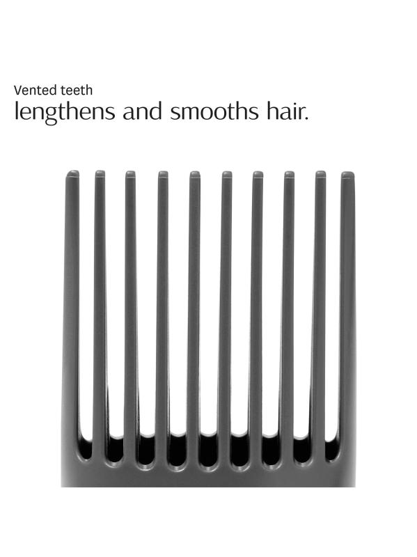 تعمل أسنان T3 Smoothing Comb Attachment ذات الفتحات على توزيع الحرارة على الشعر الجاف بسرعة أثناء تمدد الشعر وفك تشابكه. يعمل التوزيع المركّز والمتساوي للحرارة على إطالة الخيوط وتنعيمها، مما يؤدي إلى نتائج ناعمة ولامعة.