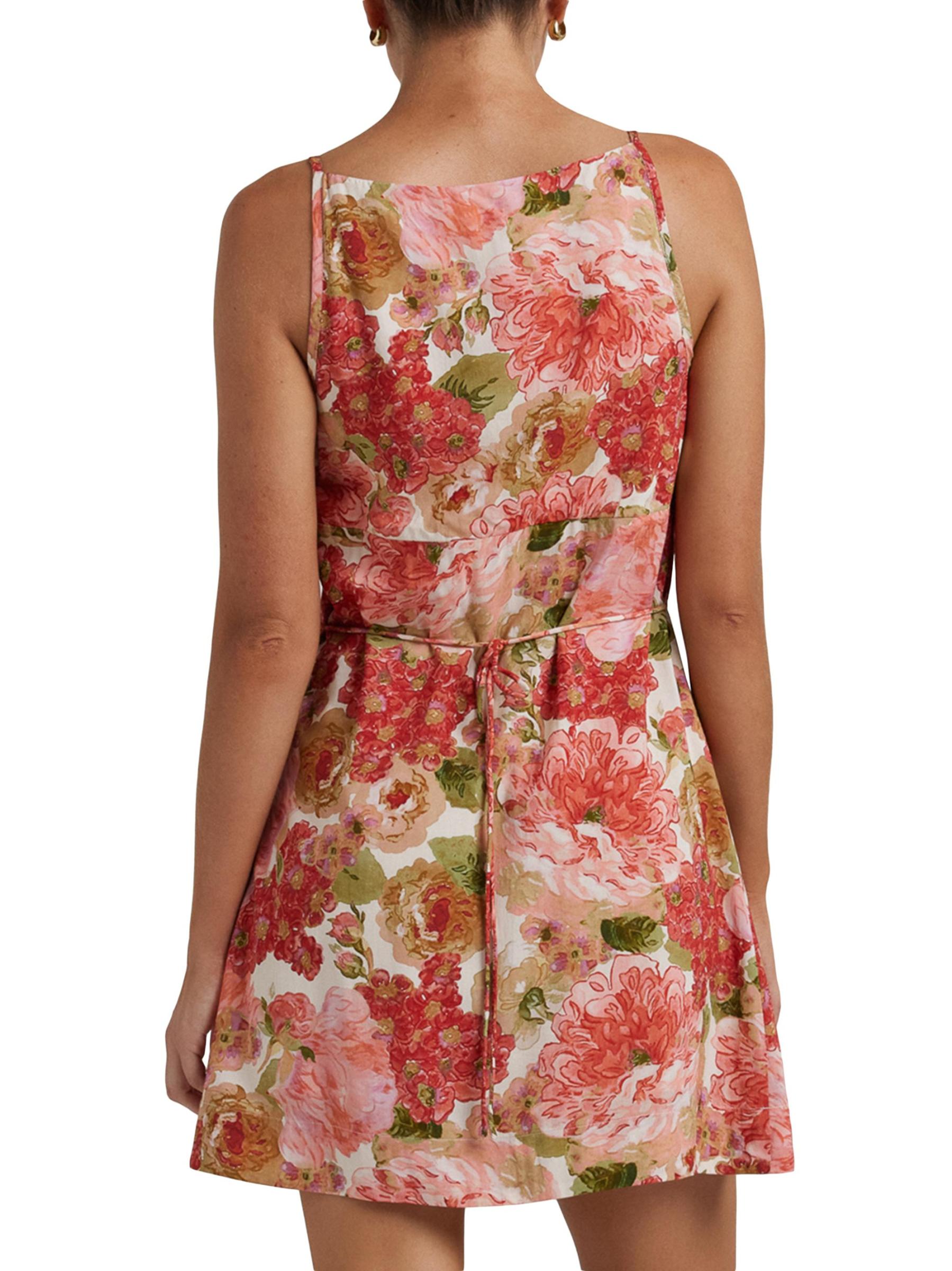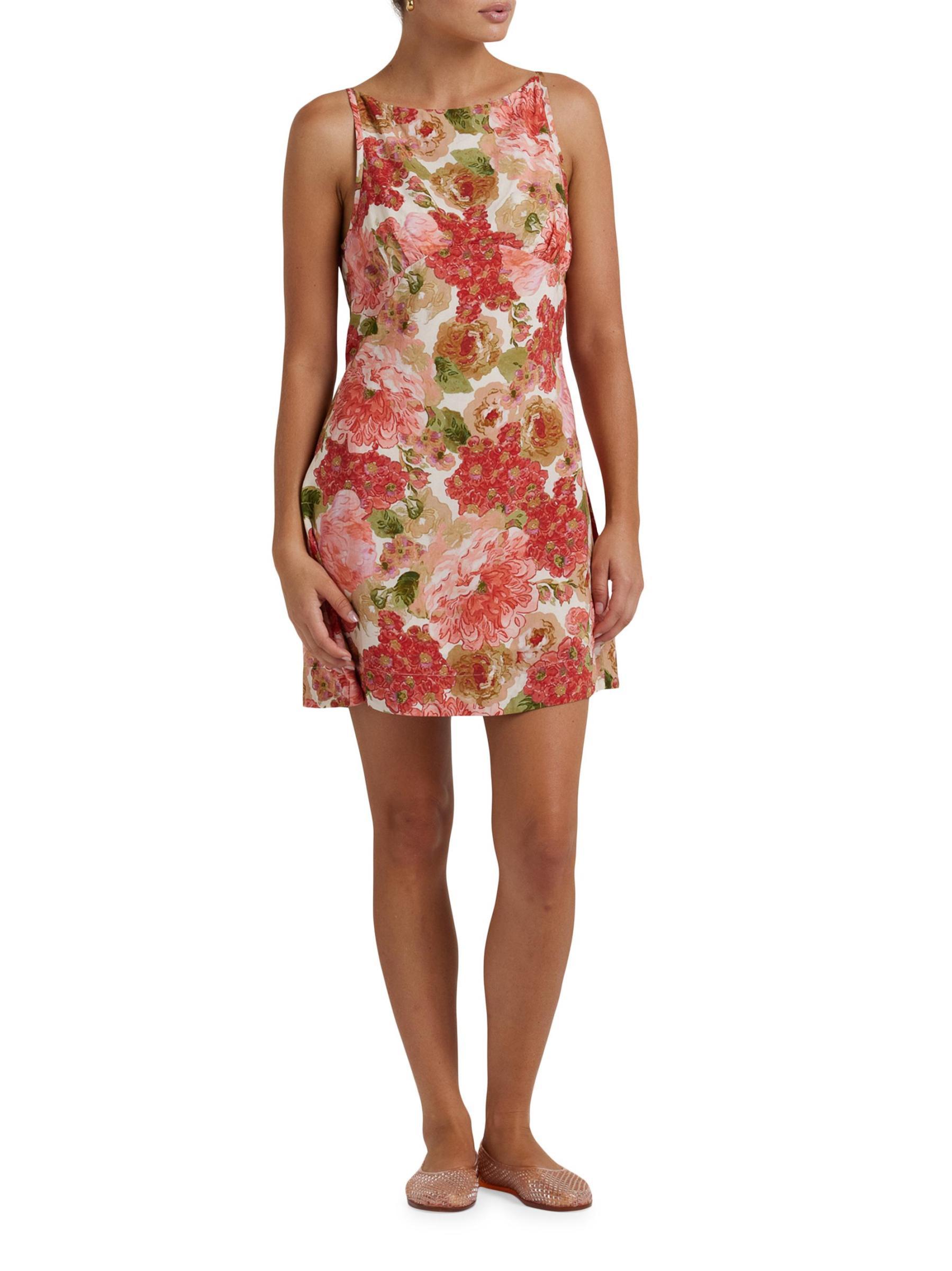 من مجموعة Tapestry. يتميز فستان كارولين الصغير من Peony بنقشة الأزهار الزاهية ورقبة القارب والقصّة بلا أكمام.