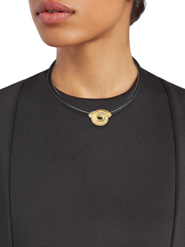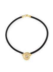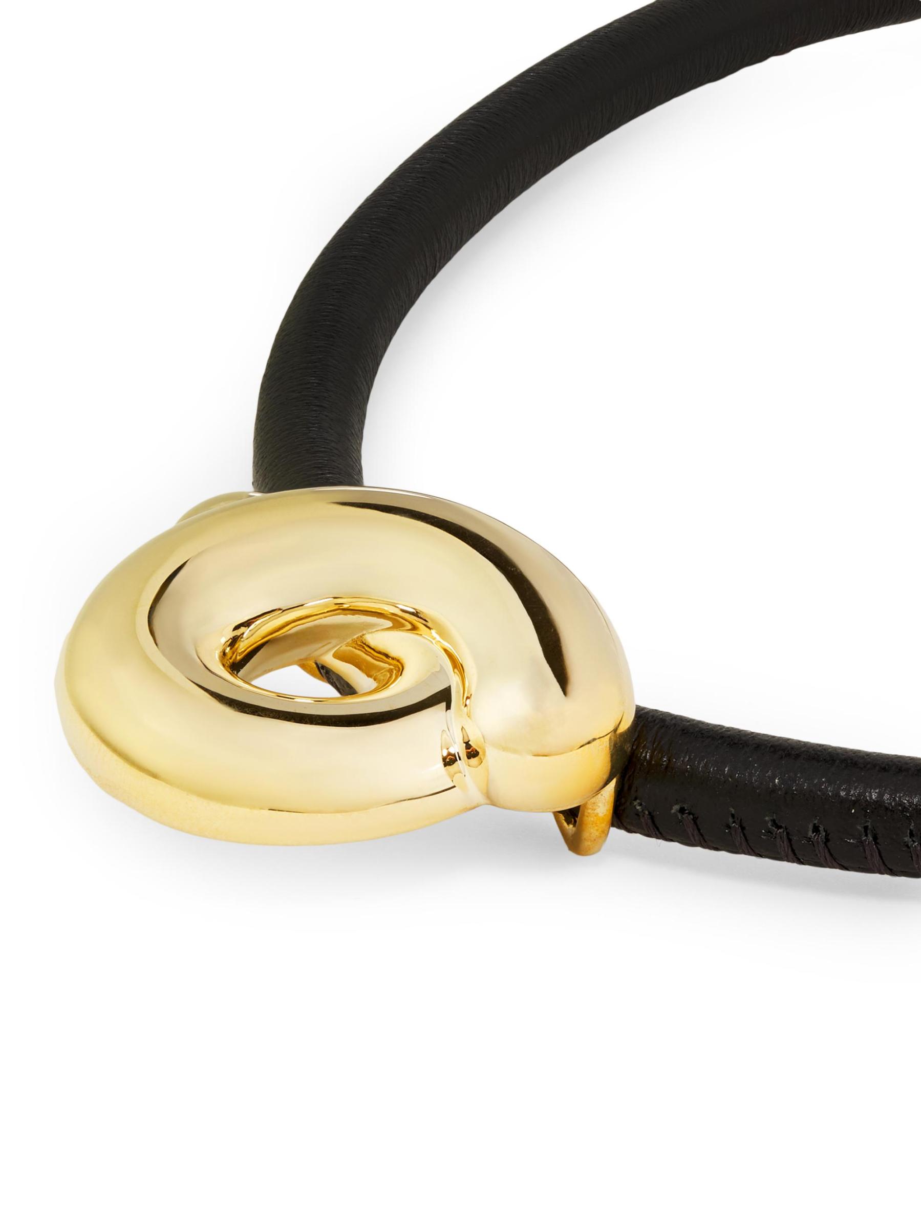من مجموعة تارالو. تتميز هذه القلادة من Bea Bongiasca بحبل جلدي أسود مع سحر من الذهب الأصفر عيار 9 قيراط في المنتصف، وهي مصممة بشكل ملتوي مستوحى من البسكويت الإيطالي المسمى taralli.
