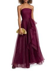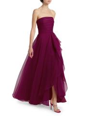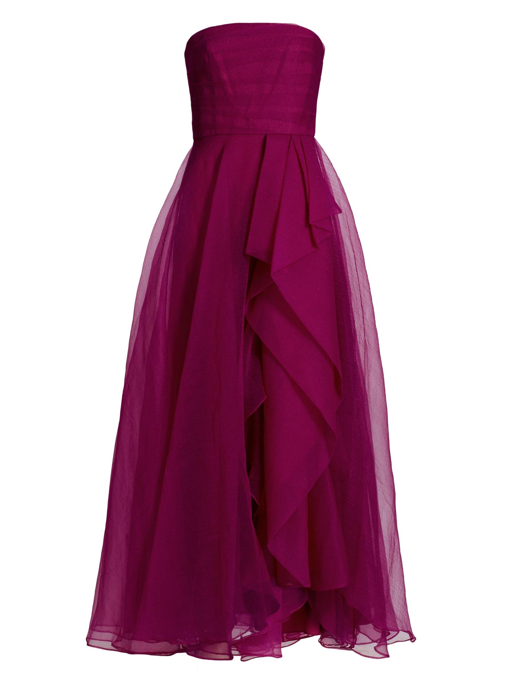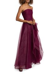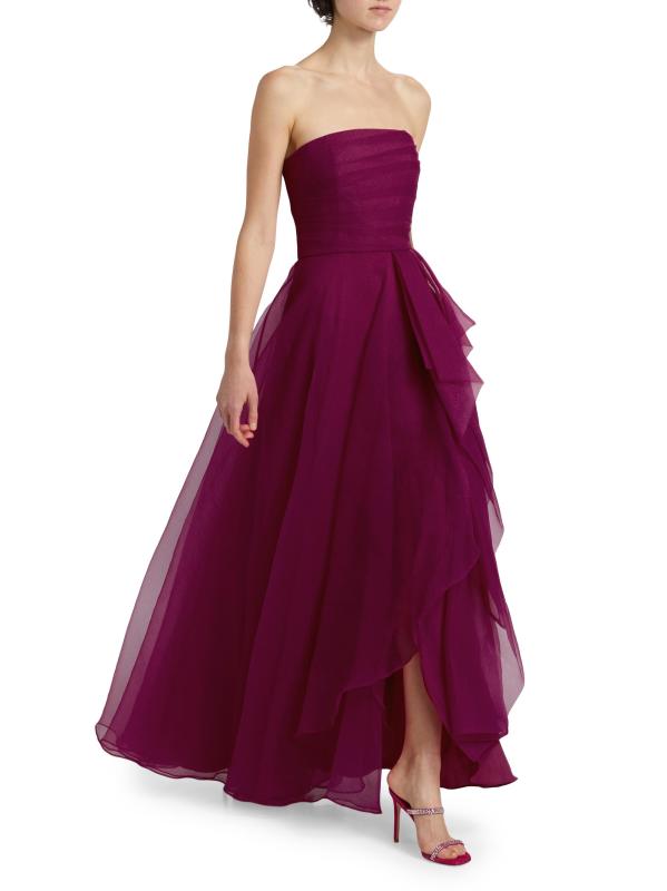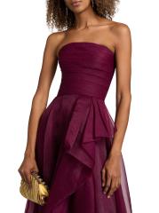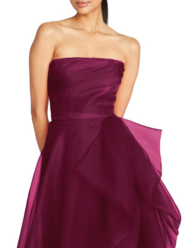 يتميز هذا الفستان بدون حمالات، المصنوع من طبقات من التول النابض بالحياة، بواجهة أمامية أنيقة مكشكشة.