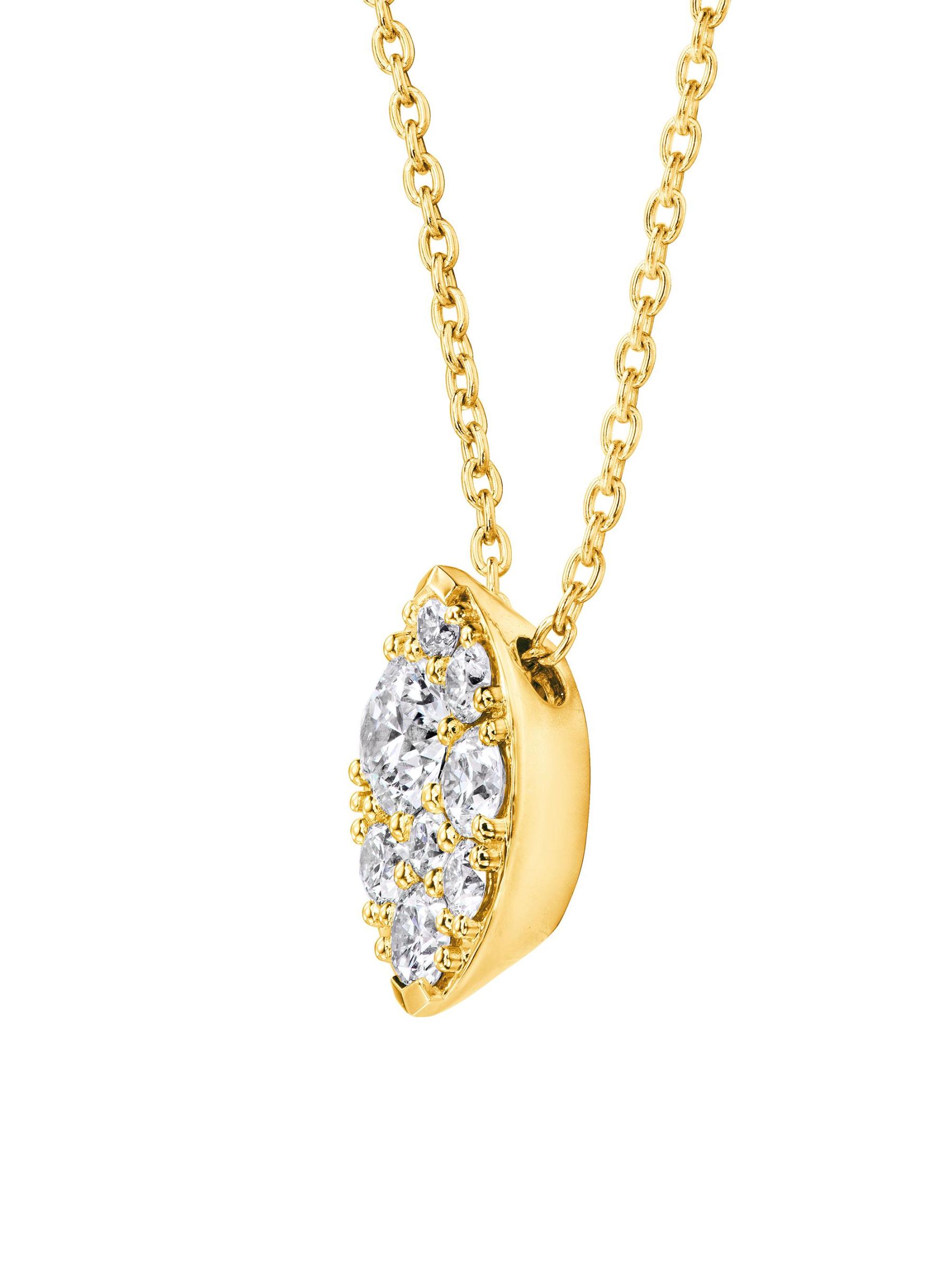 من مجموعة تيسا. تتميّز قلادة Hearts On Fire الأنيقة المصنوعة من الذهب الأصفر عيار 18 قيراطًا بقلادة على شكل ماركيز تتلألأ بأحجار الماس النارية المختلطة.