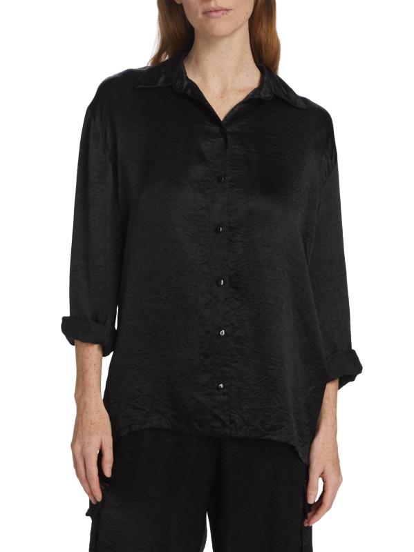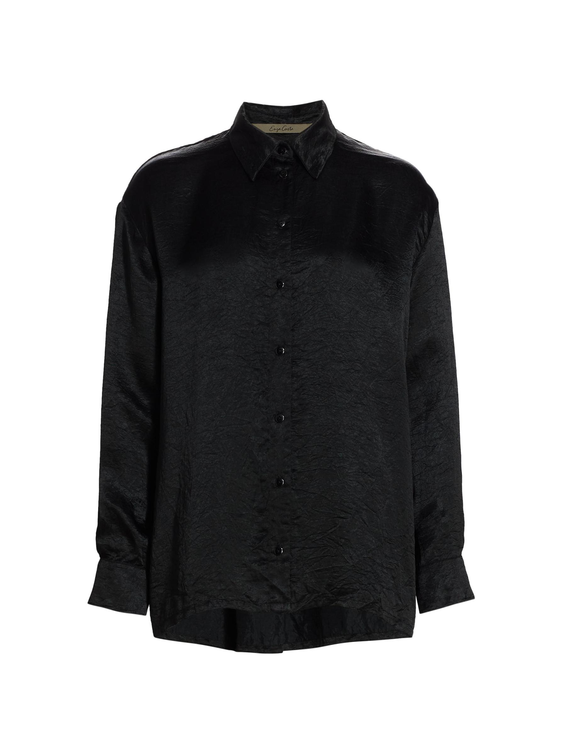 قميص Enza Costa ذو الأزرار الأمامية مصنوع من الساتان المنقوش. يتميز هذا النمط المريح بياقة مدببة وأكتاف منسدلة وأكمام طويلة.