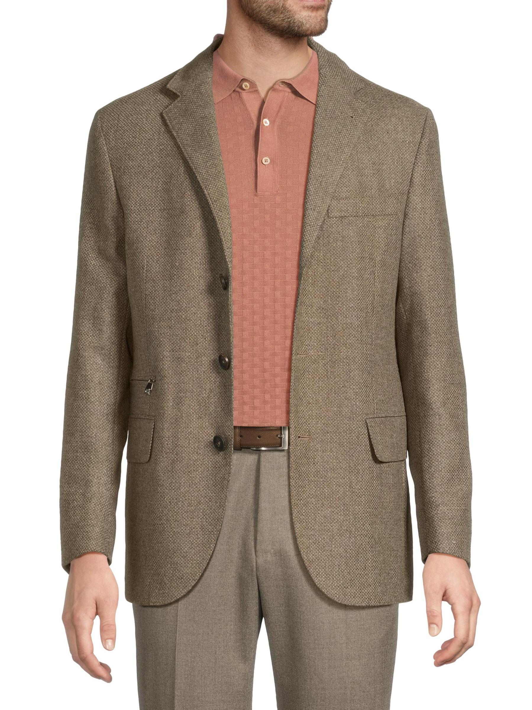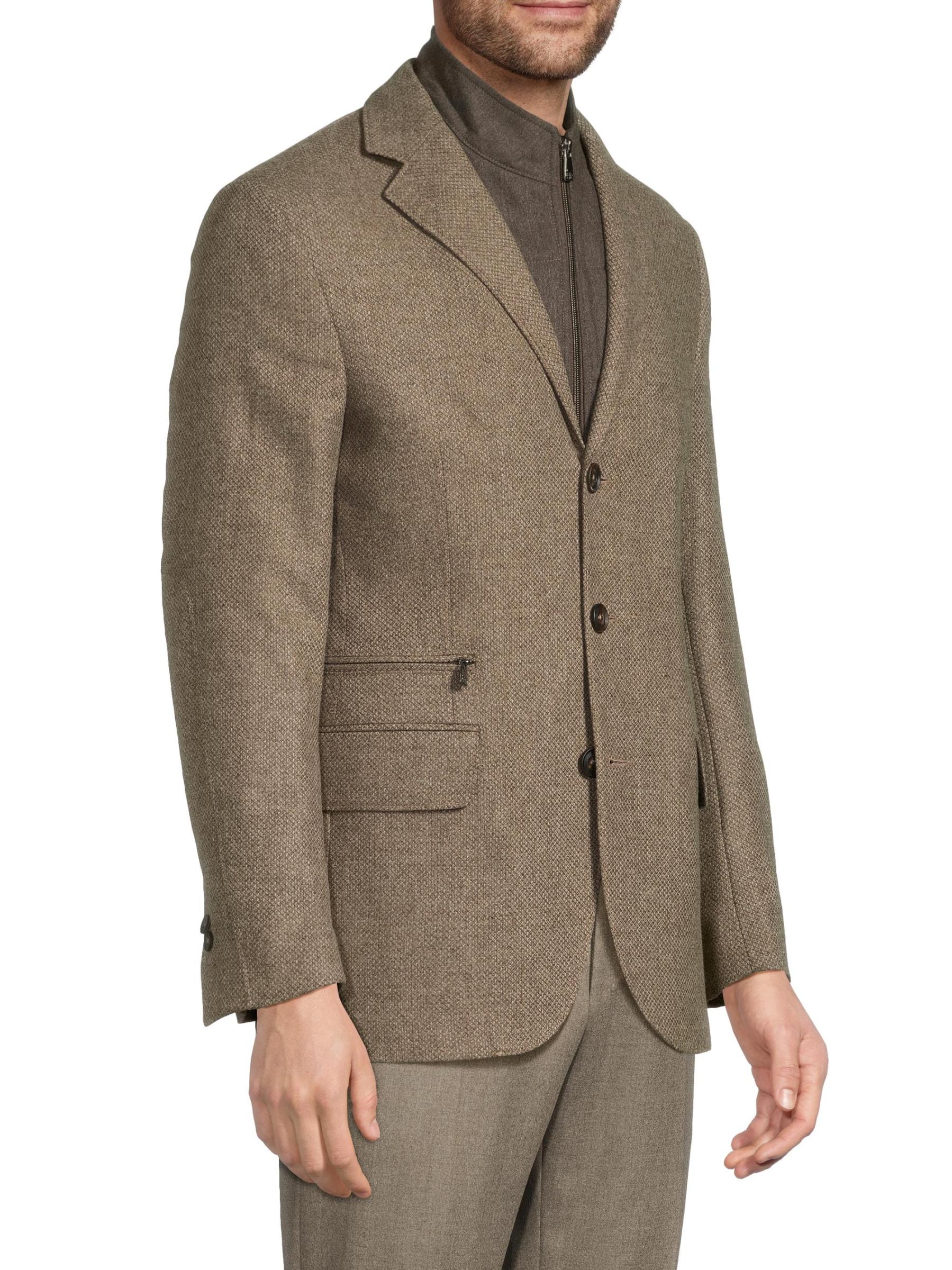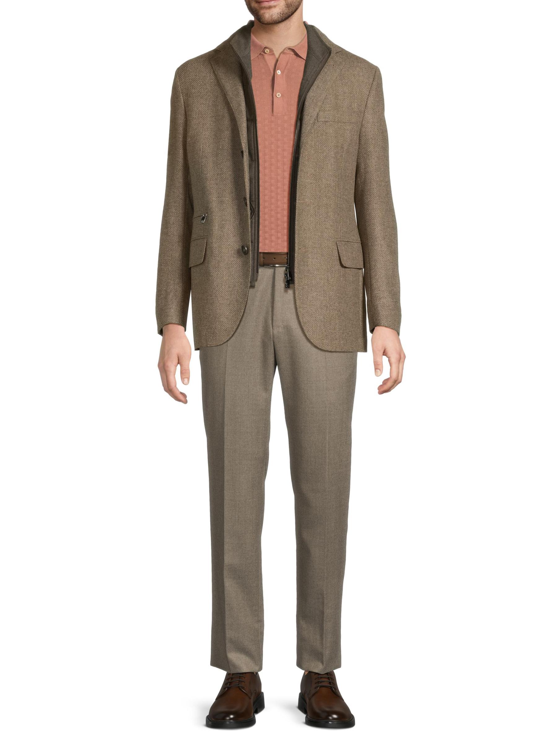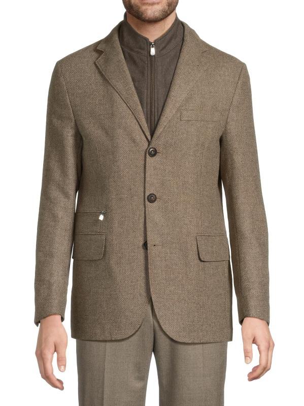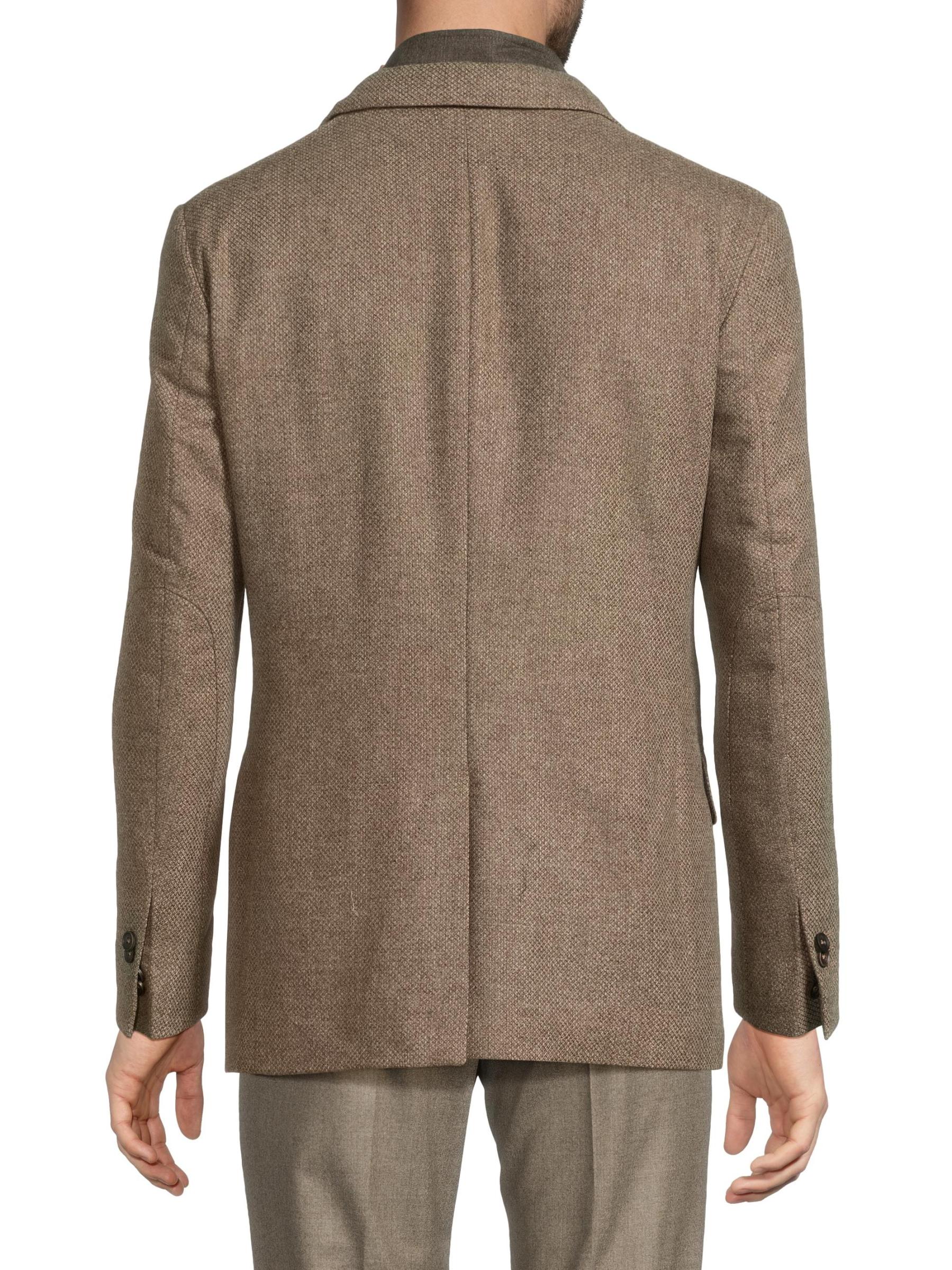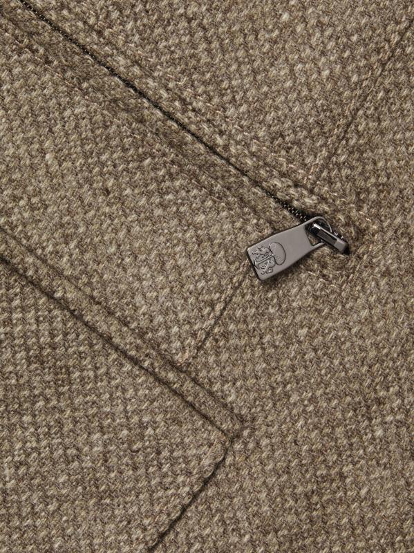 معطف Corneliani الرياضي مصنوع من مزيج من الصوف البكر والكشمير، ويتميز بمريلة داخلية رياضية بسحّاب كامل. تم تصميم هذا الطراز بطيات مشقوقة وجيب جانبي للتذاكر وجيوب جانبية قابلة للطي.