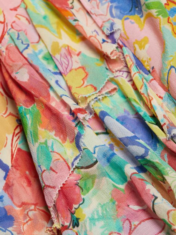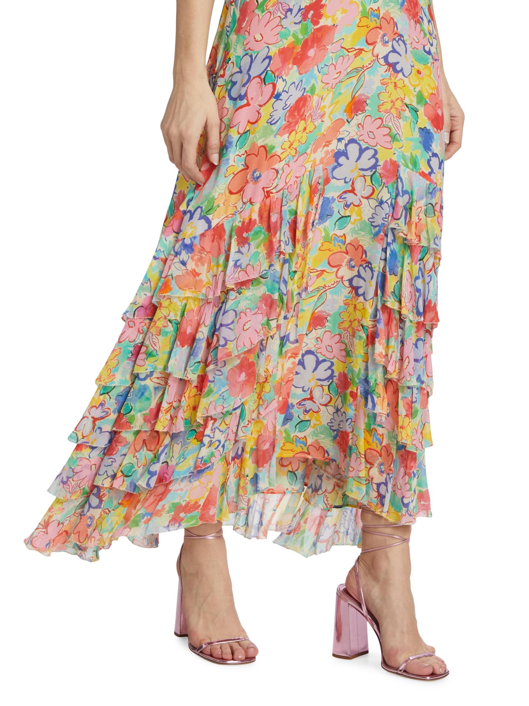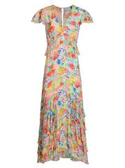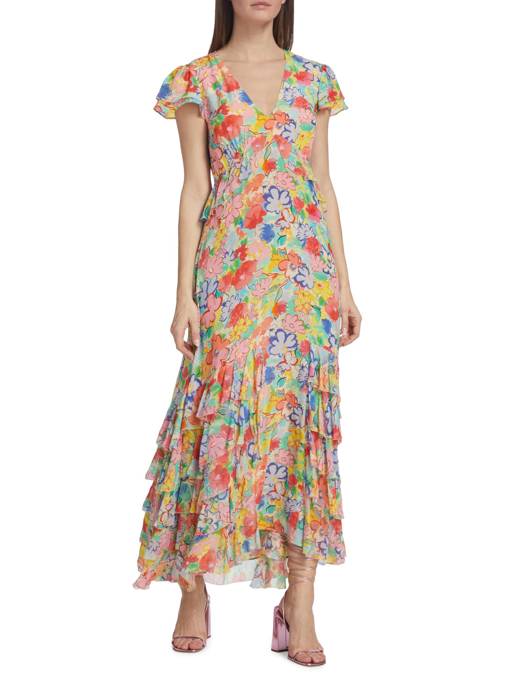 يتميّز فستان Thanvi maxi ذو الأكمام الواسعة من Rixo بتنورة مكشكشة متعدّدة الطبقات وطبعات مزركشة بألوان زاهية.