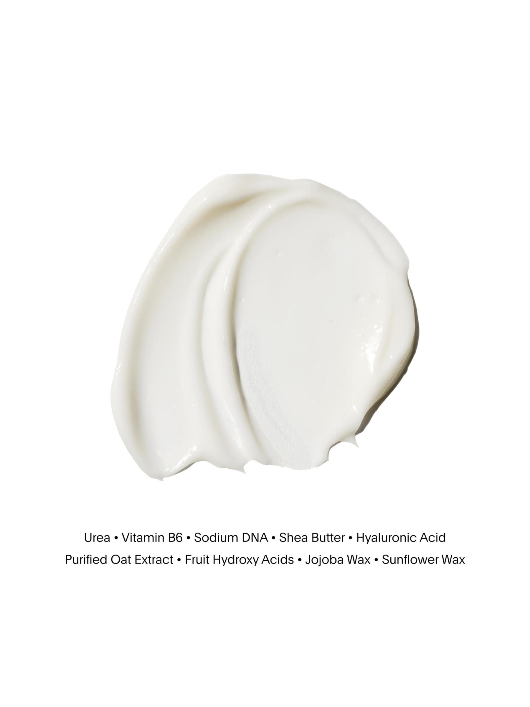 اليوريا، وفيتامين B6، وحمض الصوديوم، وزبدة الشيا، وحمض الهيالورونيك، وأليغوساكاريد ألفا جلوكان، ومستخلص الشوفان المنقى، وأحماض ألفا هيدروكسي بالفواكه، وحمض الساليسيليك، والجوجوبا، وعباد الشمس، وشمع الميموزا