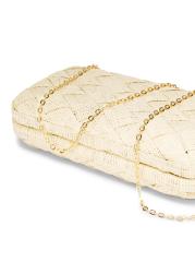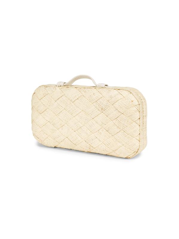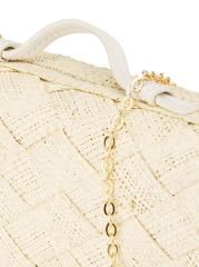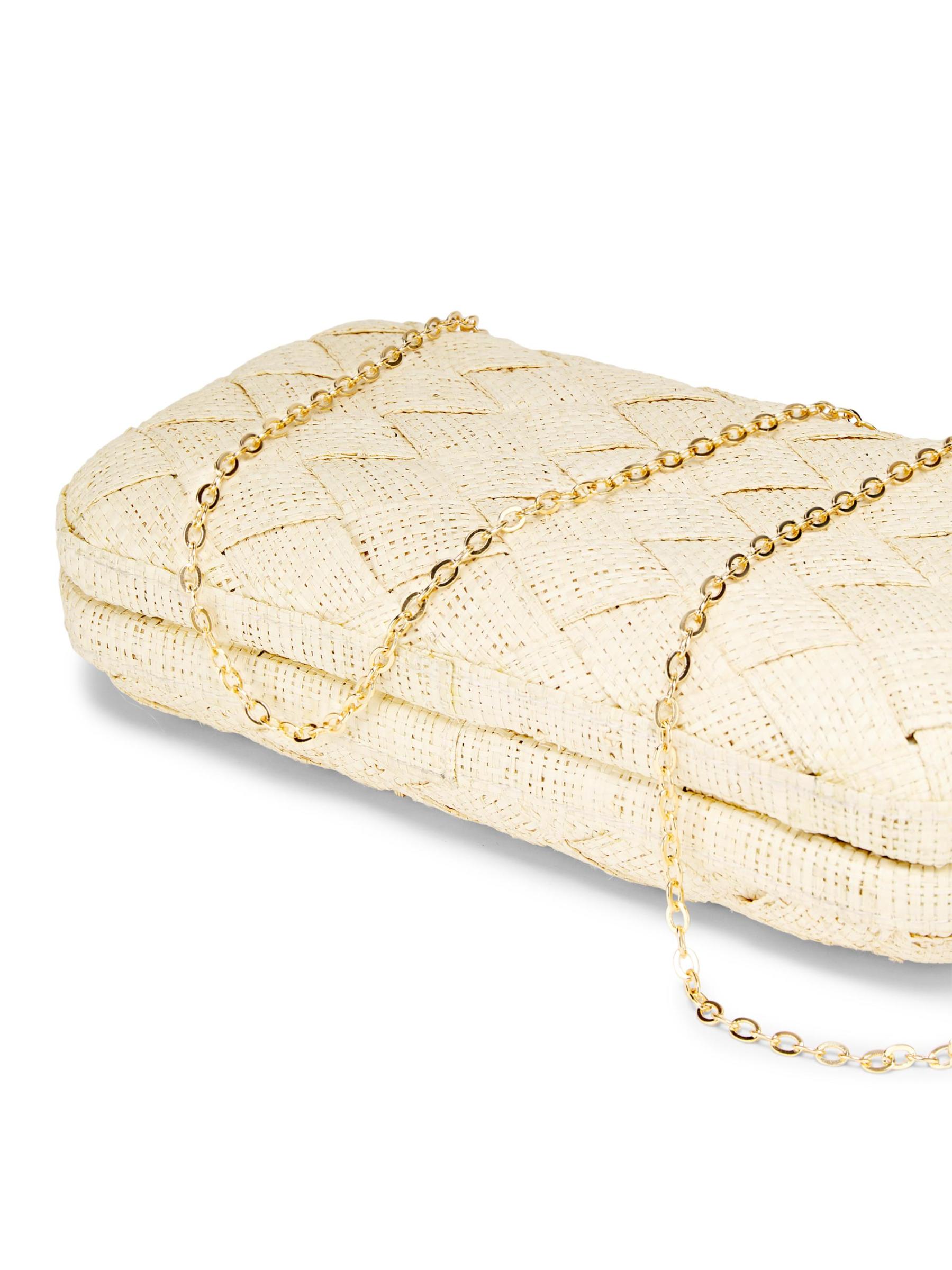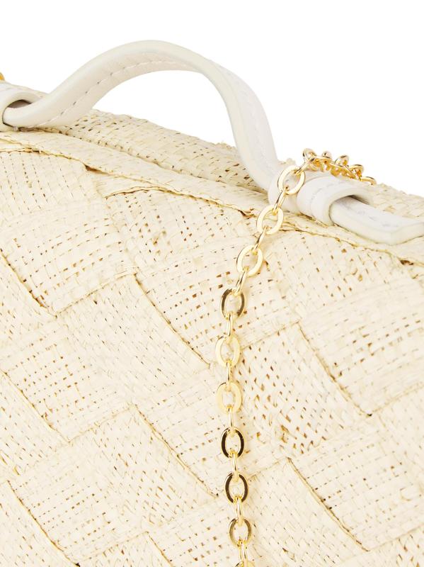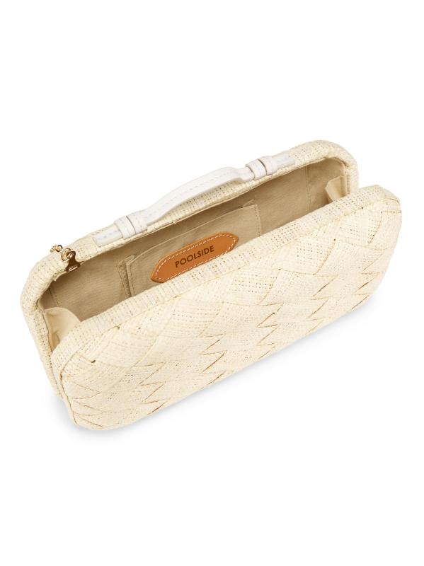 تم تصميم حقيبة إيست ويست من Poolside بتصميم من نسيج القش يتميز بمقبض علوي من الجلد وحزام سلسلة مدسوس باللون الذهبي.