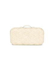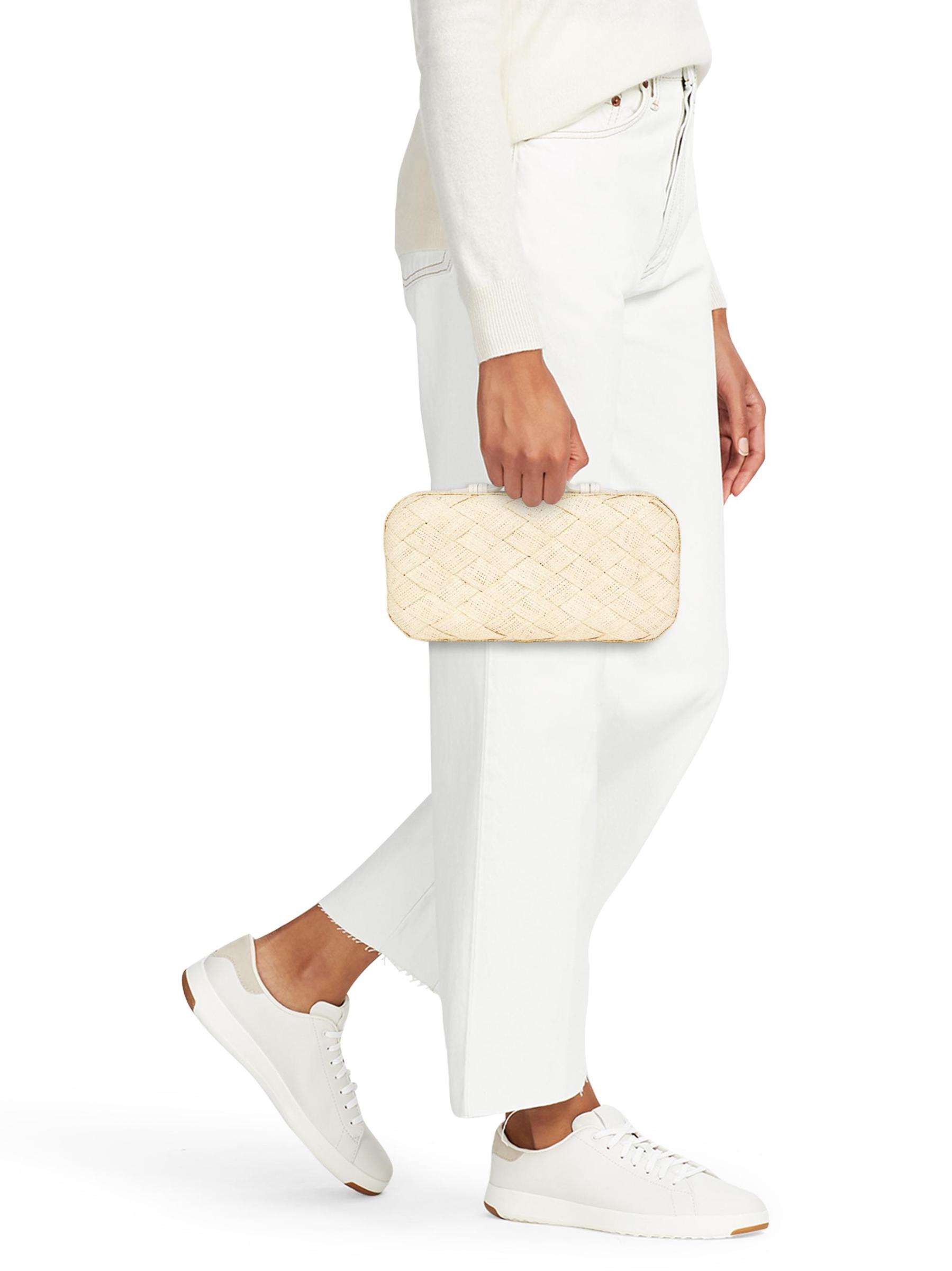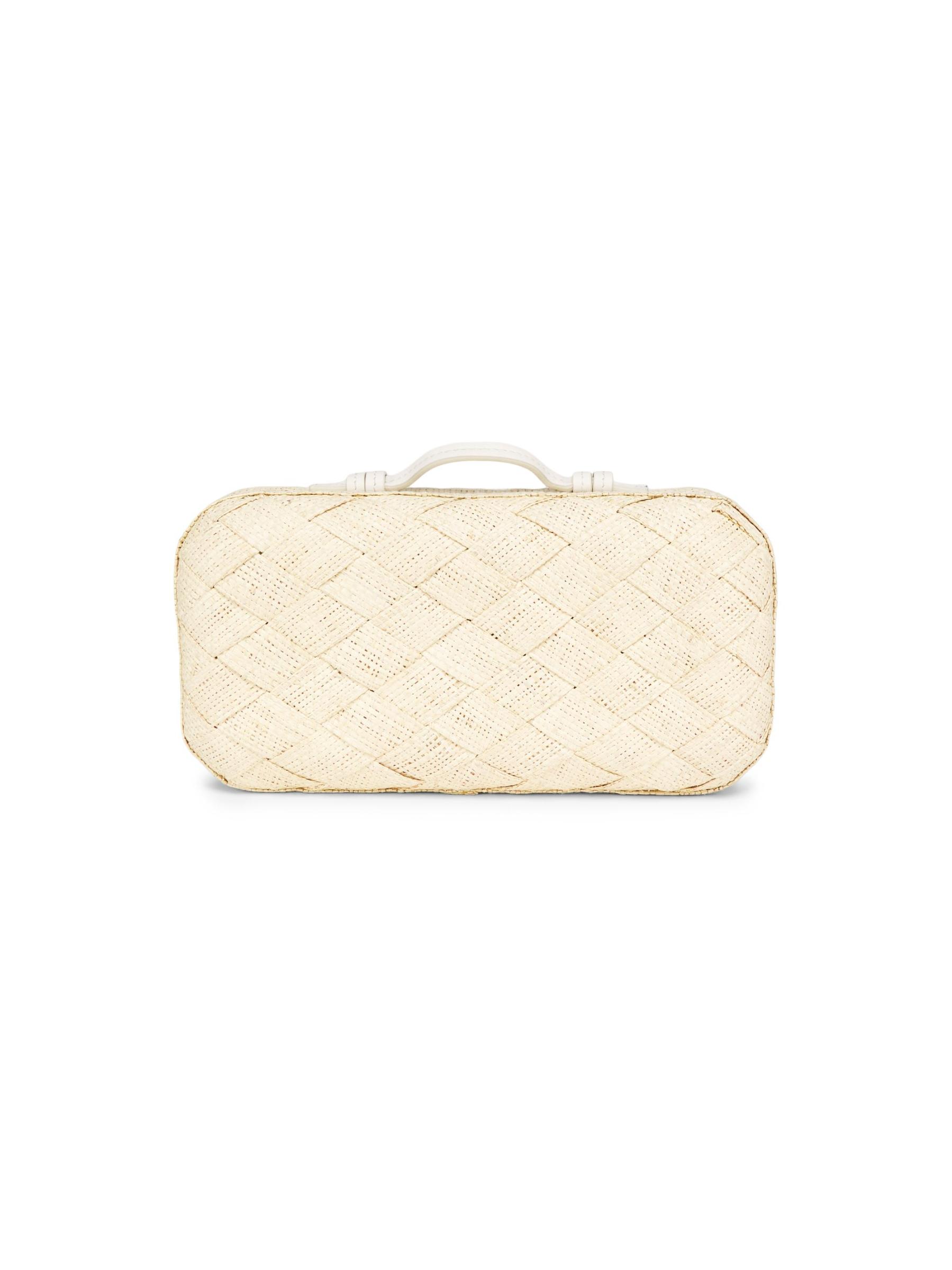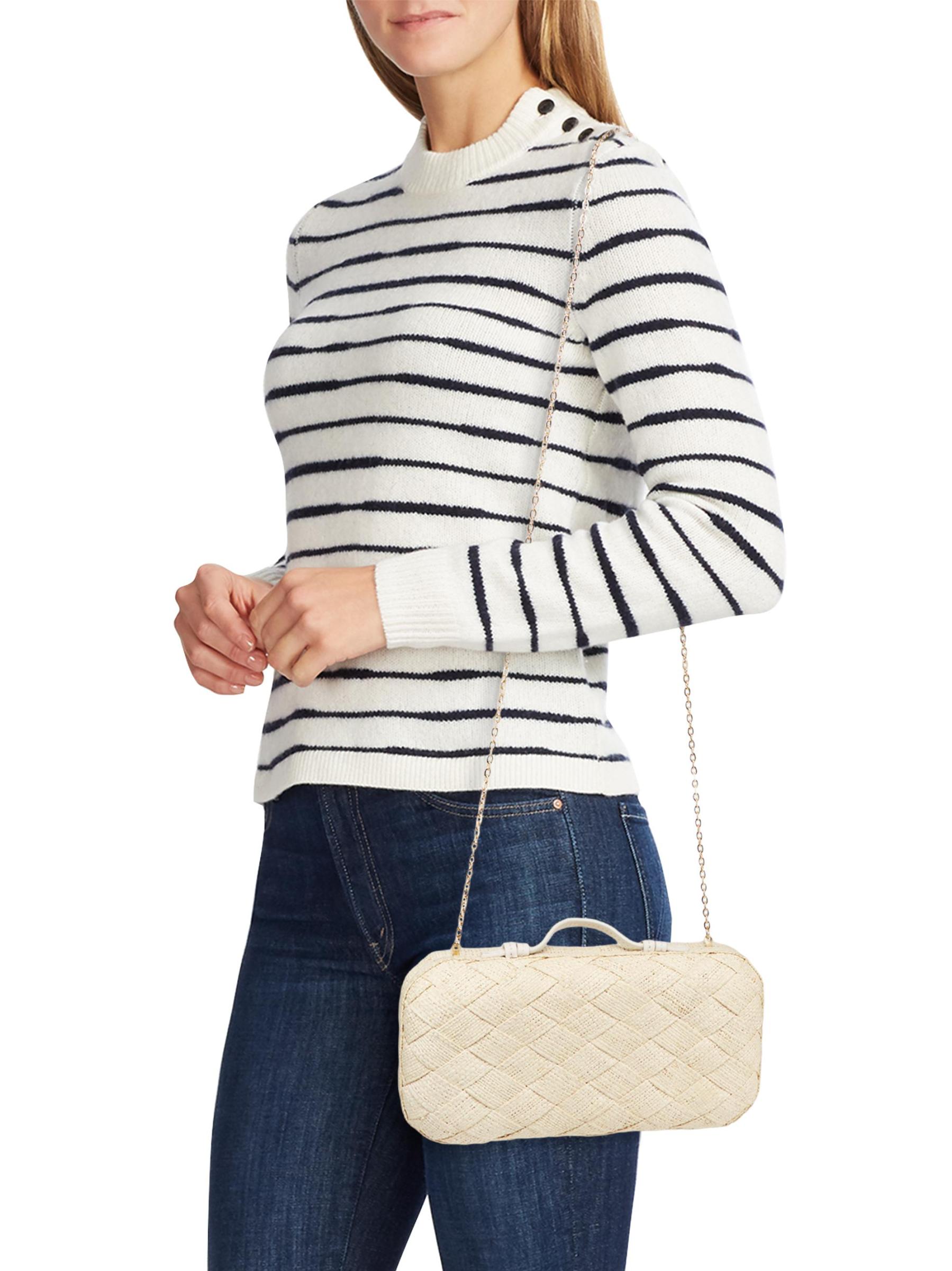 تم تصميم حقيبة إيست ويست من Poolside بتصميم من نسيج القش يتميز بمقبض علوي من الجلد وحزام سلسلة مدسوس باللون الذهبي.