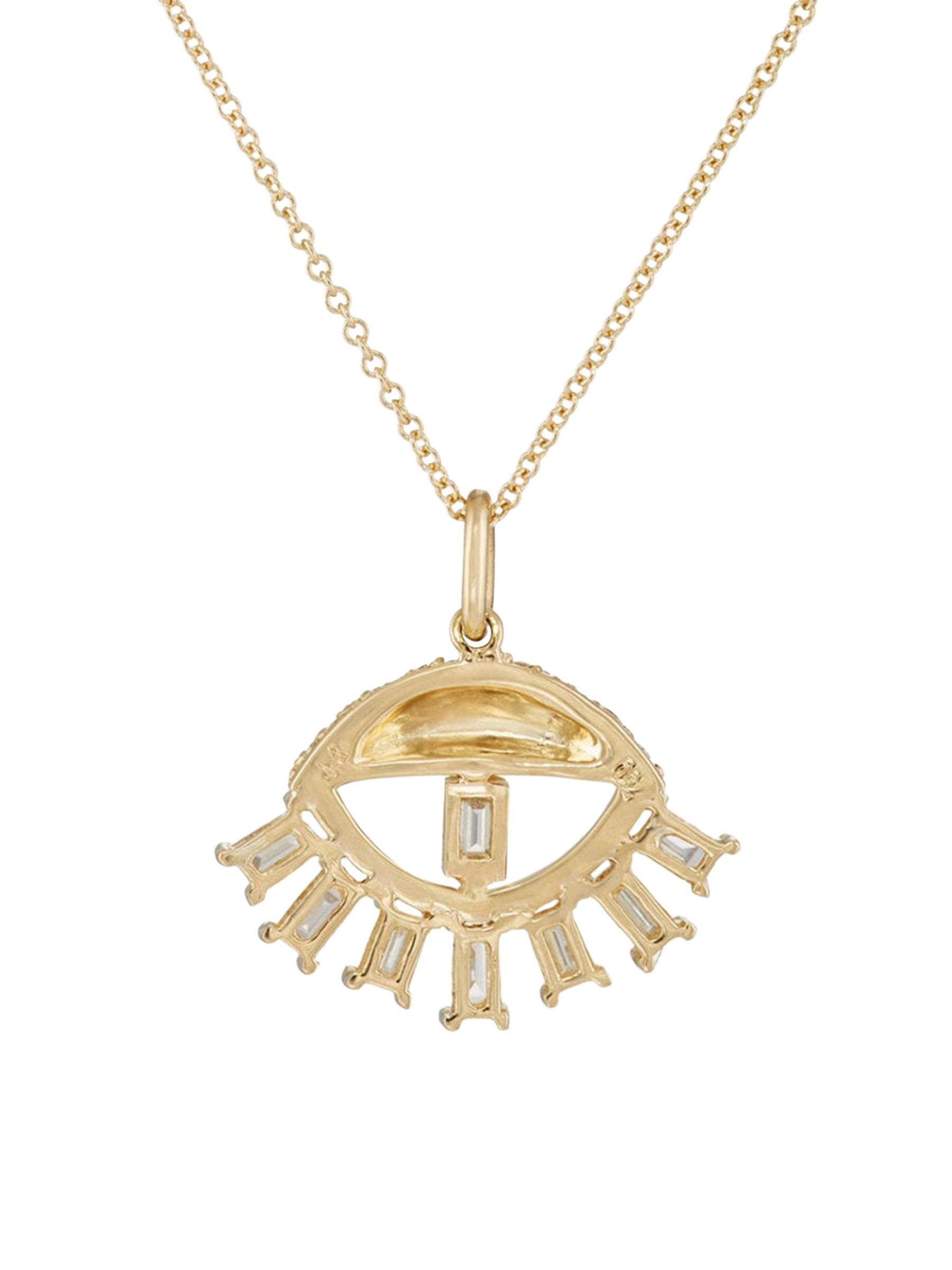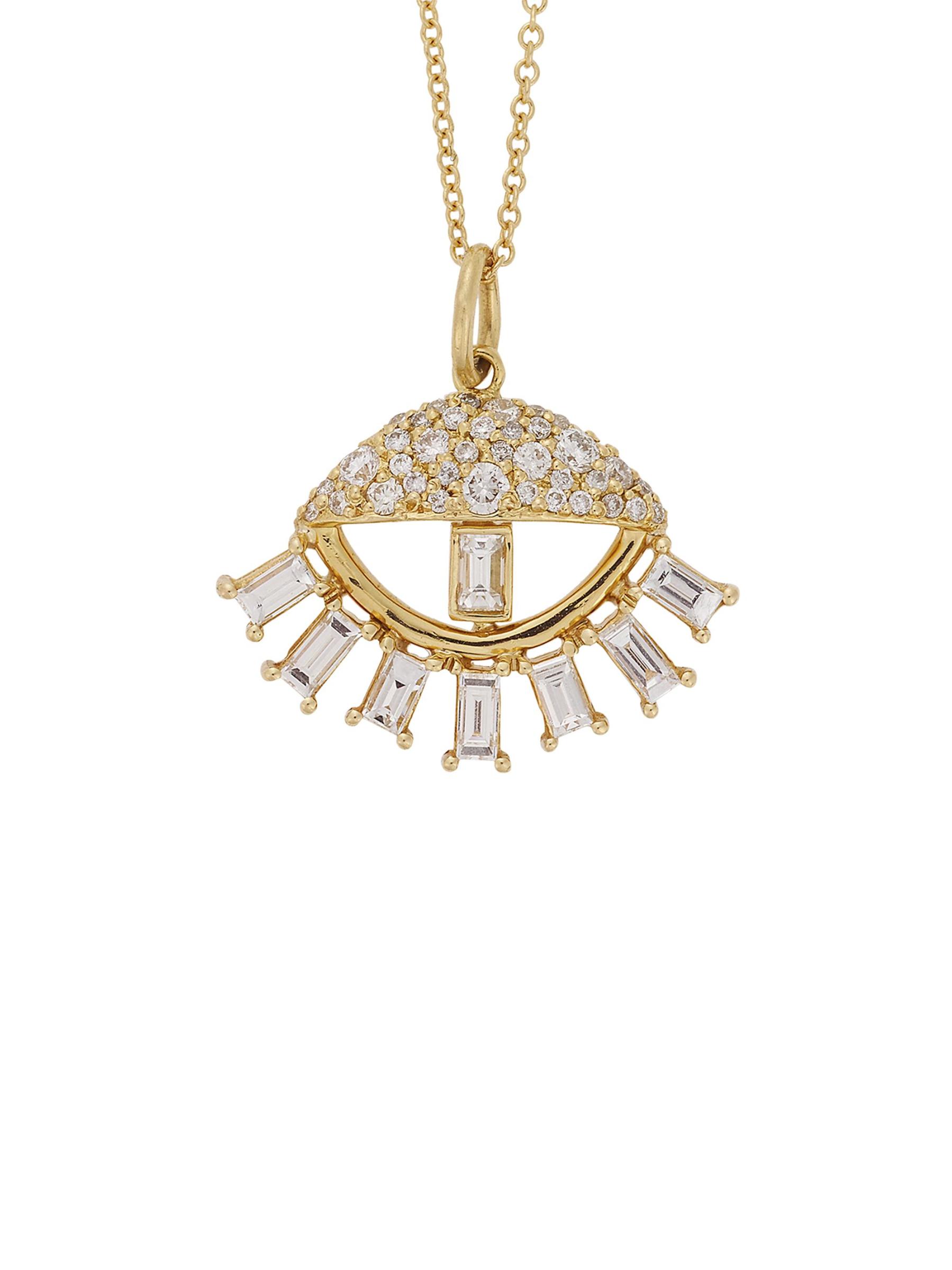 من مجموعة التحرير. تتميّز قلادة إليانا ماكري، المصنوعة من الذهب الأصفر عيار 18 قيراطًا، بقلادة على شكل عين هادئة مزيّنة بالألماس البافي اللامع والباجيت.