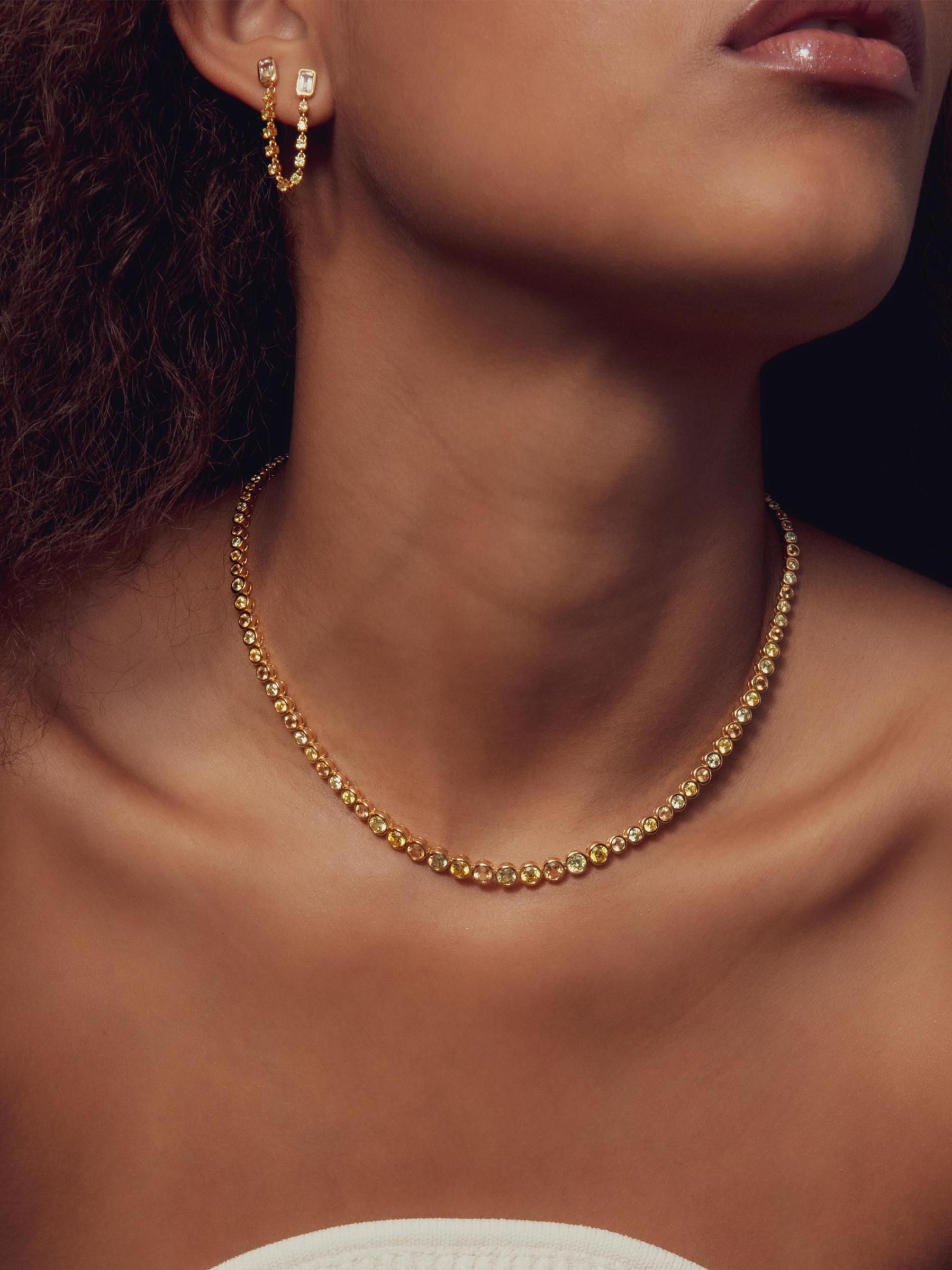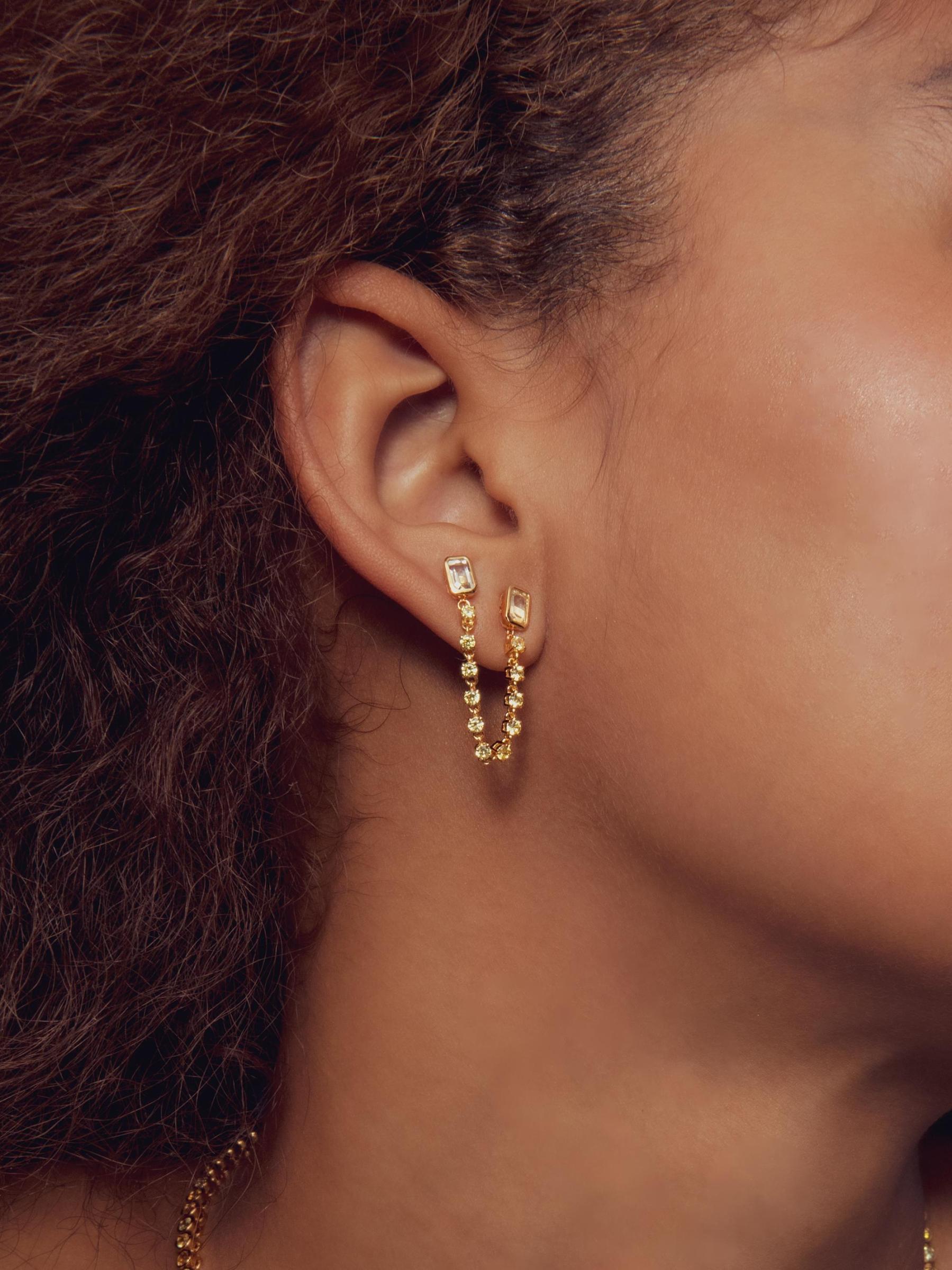 تتميّز ترصيع Estelle من Luv AJ، المُصممة بأعمدة مزدوجة متصلة بسلسلة منسدلة، بطلاء ذهبي عيار 18 قيراطًا مع الجمشت الأخضر والزركونيا المكعبة الصفراء.