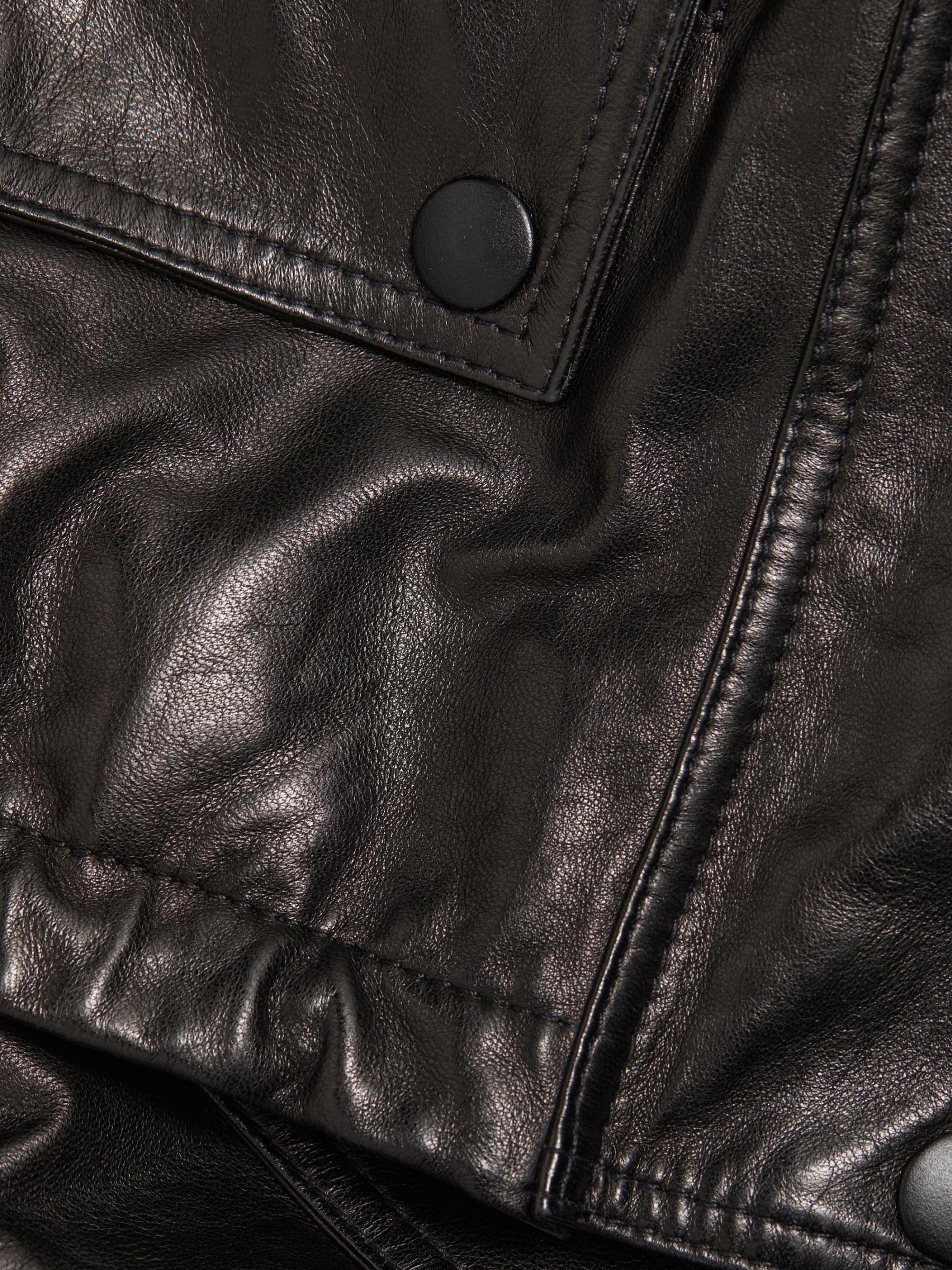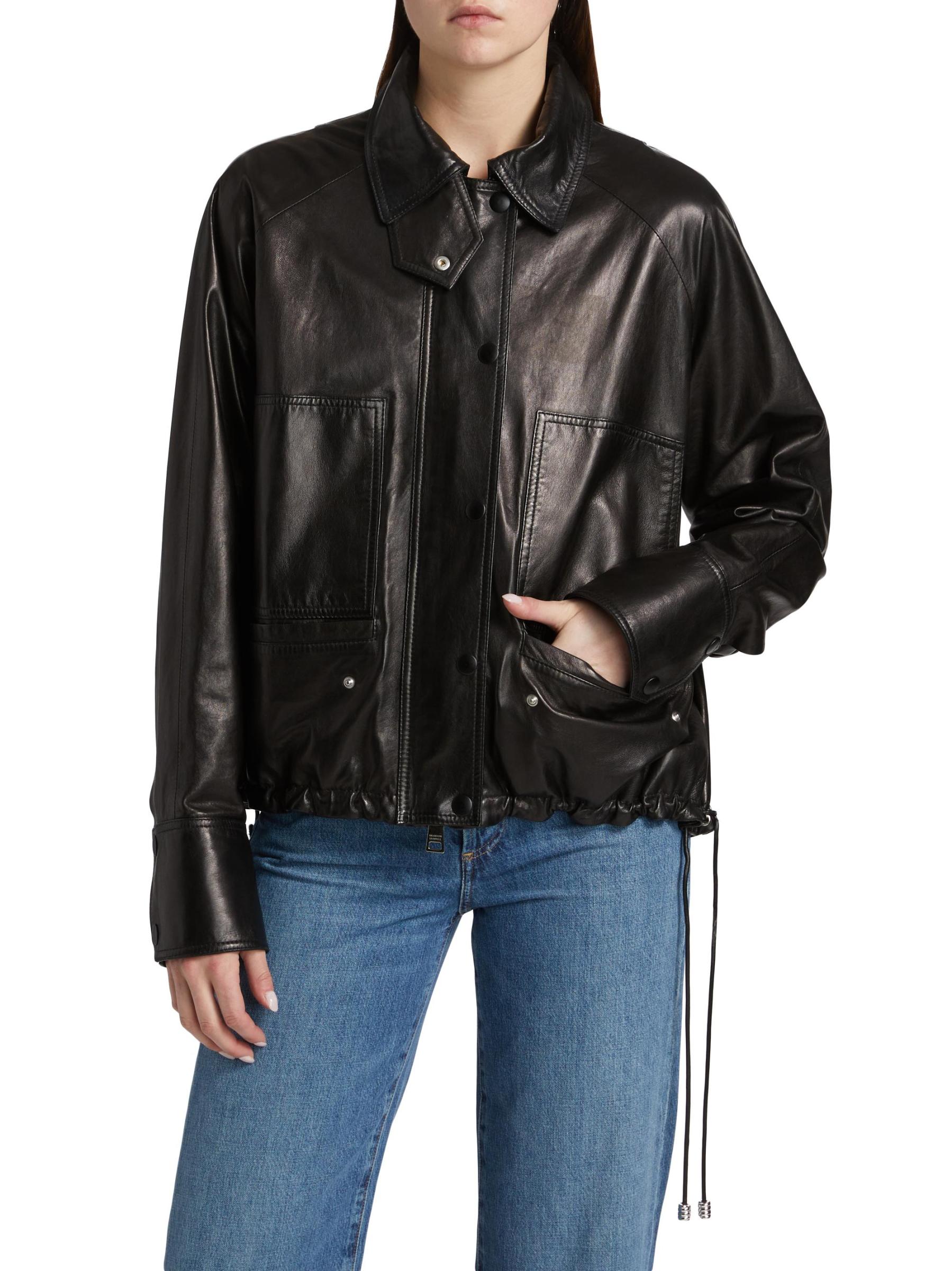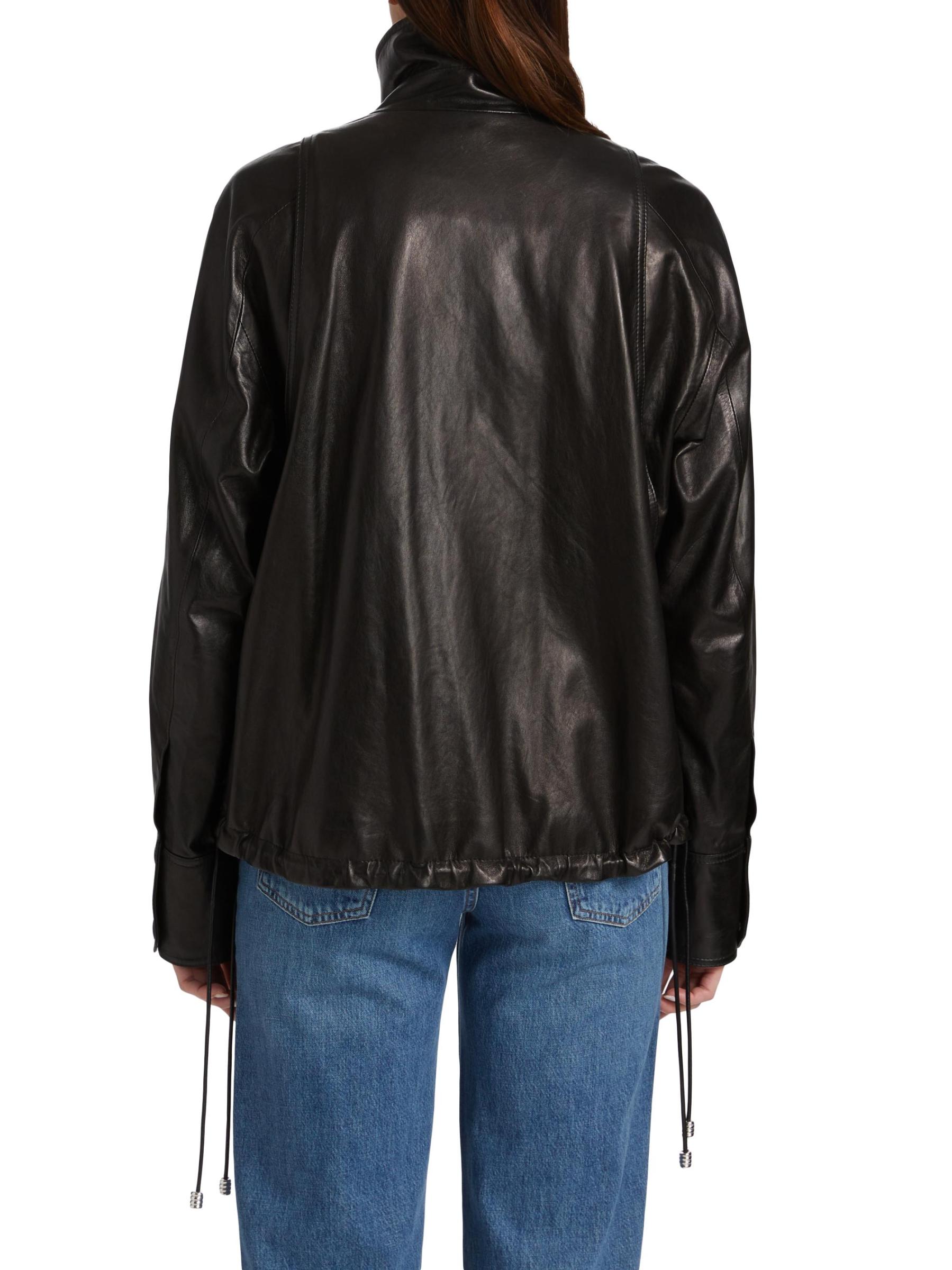تم تصميم جاكيت هاربر الجلدي من براندون ماكسويل بحافة رباط فريدة لإضفاء لمسة عصرية على الصورة الظلية التقليدية. تتميز الجيوب الخارجية المختلفة بتفاصيل الجسم، بينما تخفي فتحة سناب ستورم الإغلاق الأمامي.