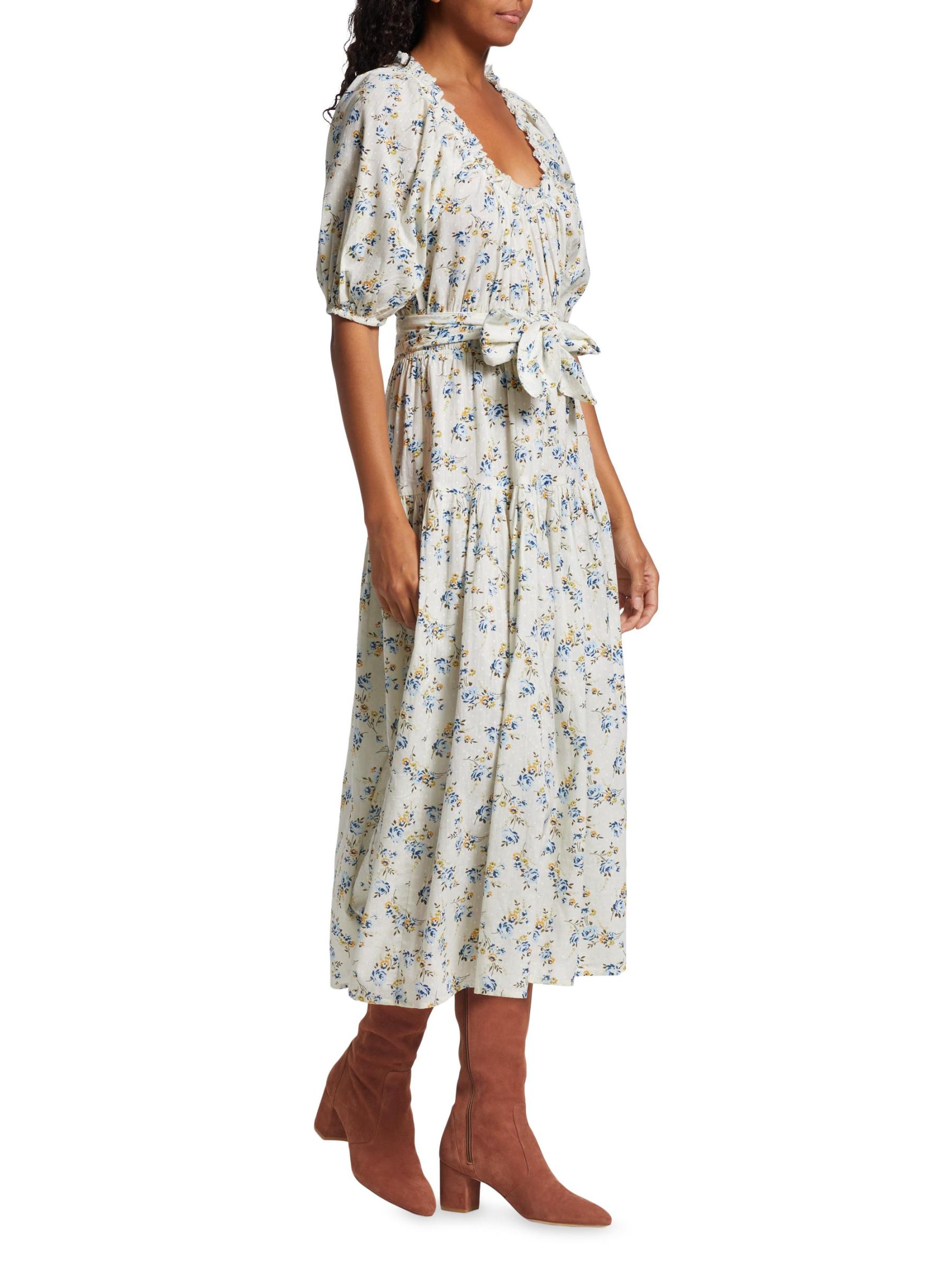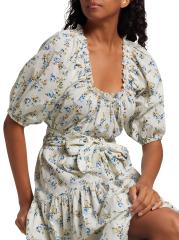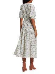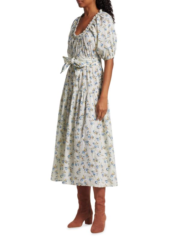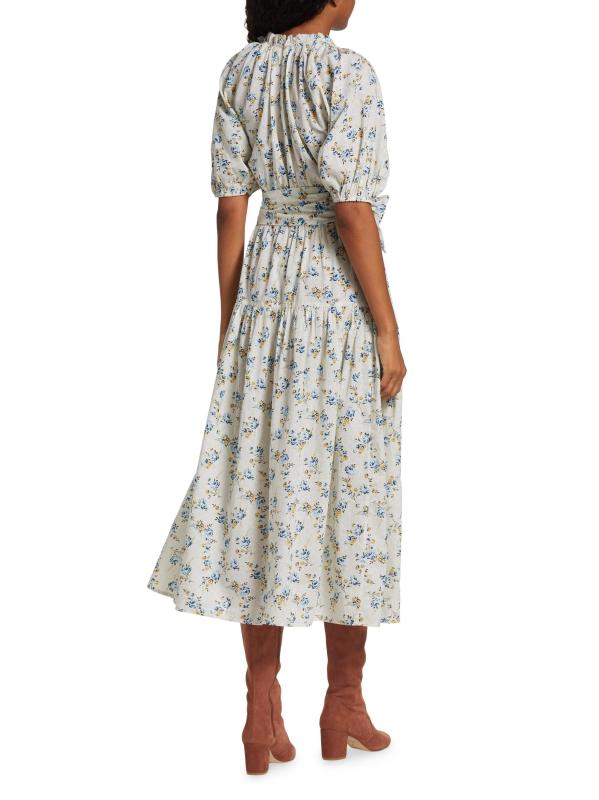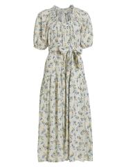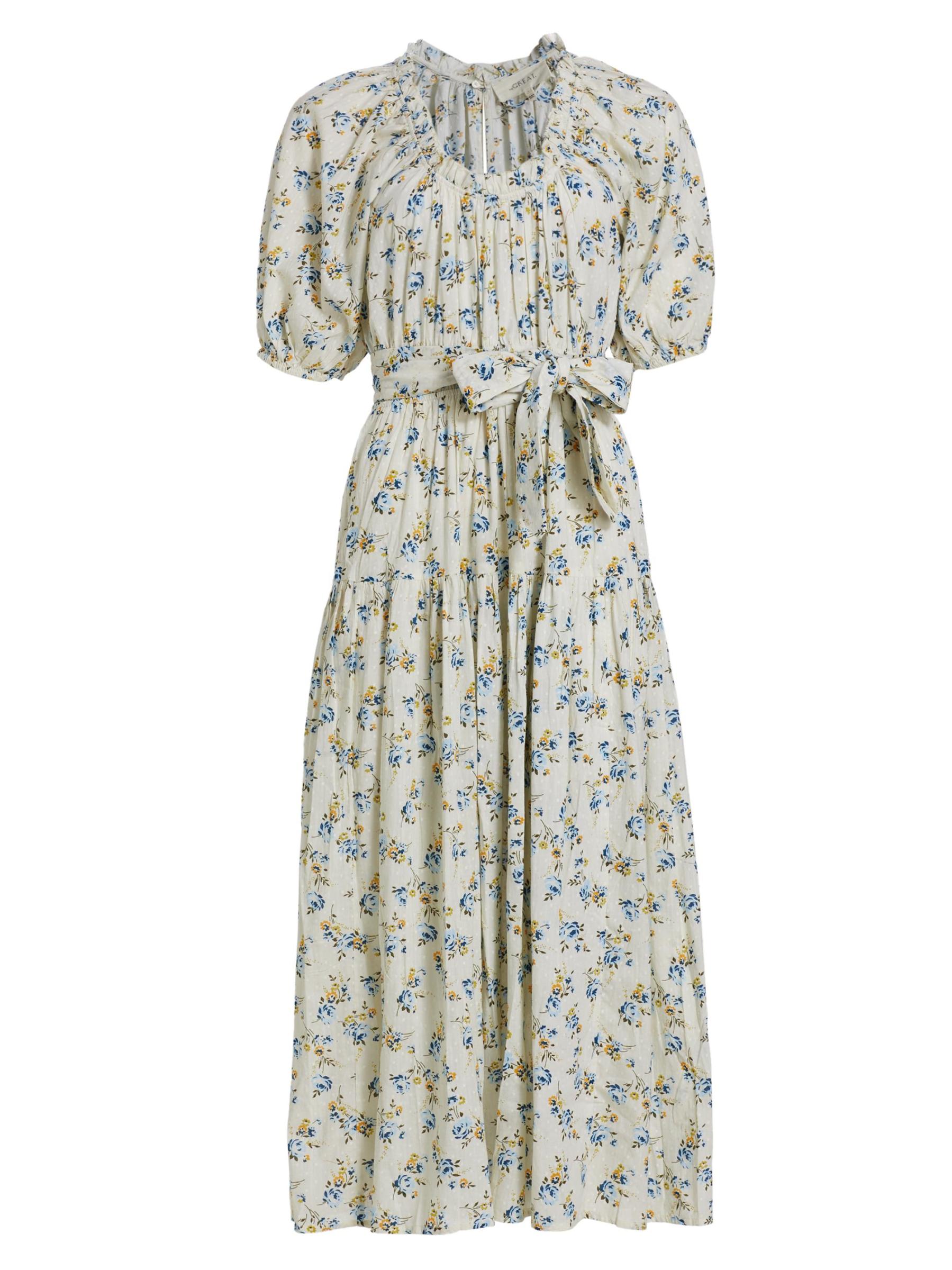 يتميز فستان Moonstone المتوسط من The Great بتصميم على شكل حرف A مصنوع من القطن الزهري. يتم تعريف الأسلوب من خلال رقبة دائرية مكشكشة وأكمام منفوخة بطول الكوع وحزام مطابق للربط الذاتي.