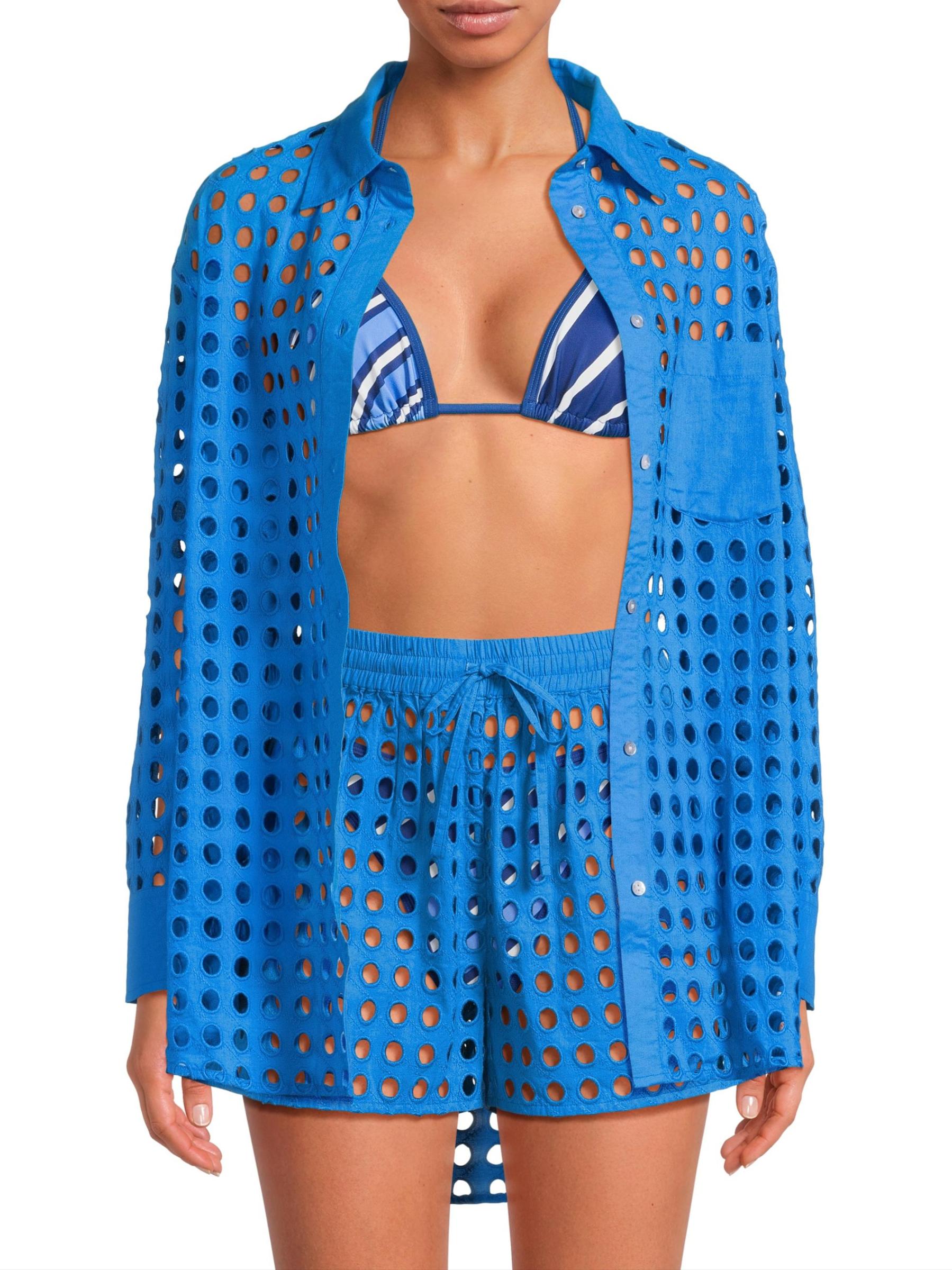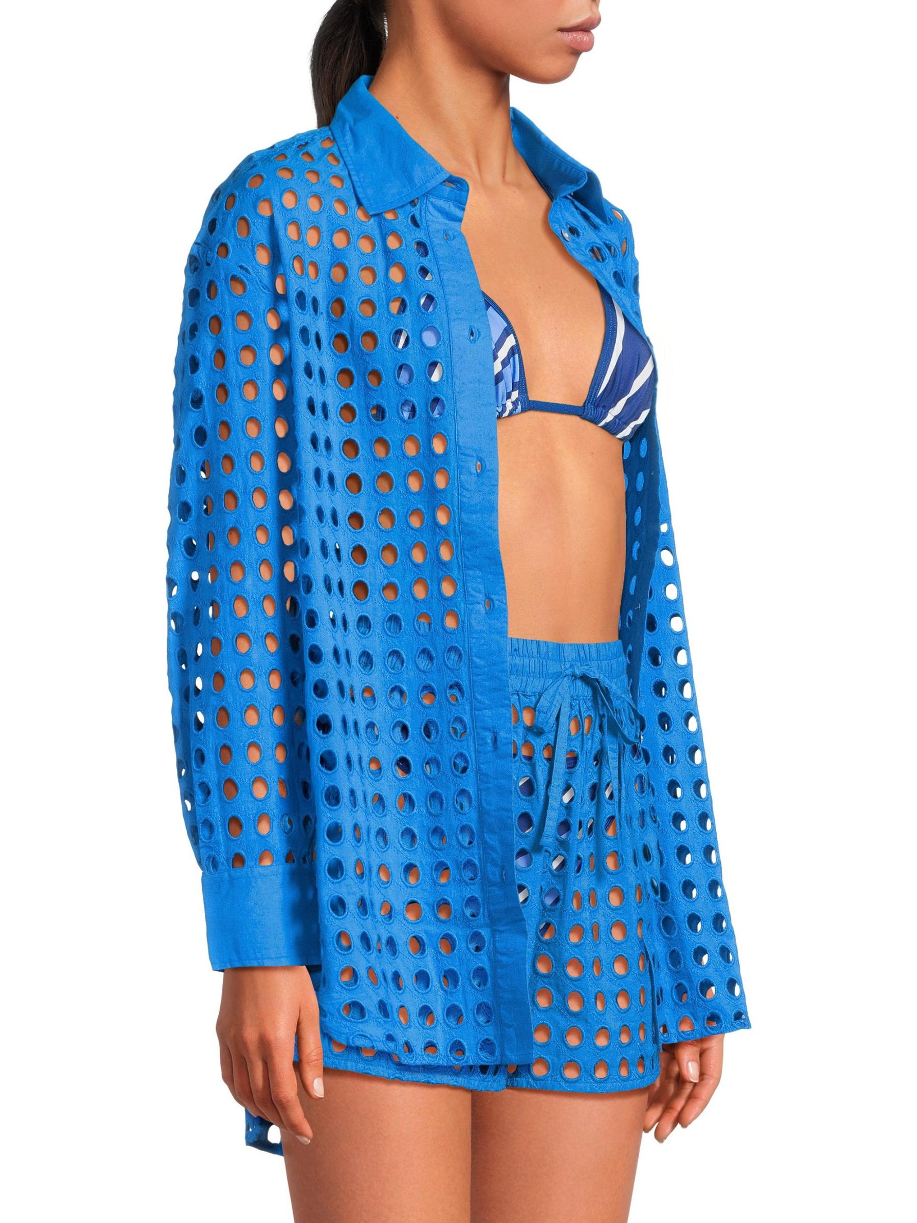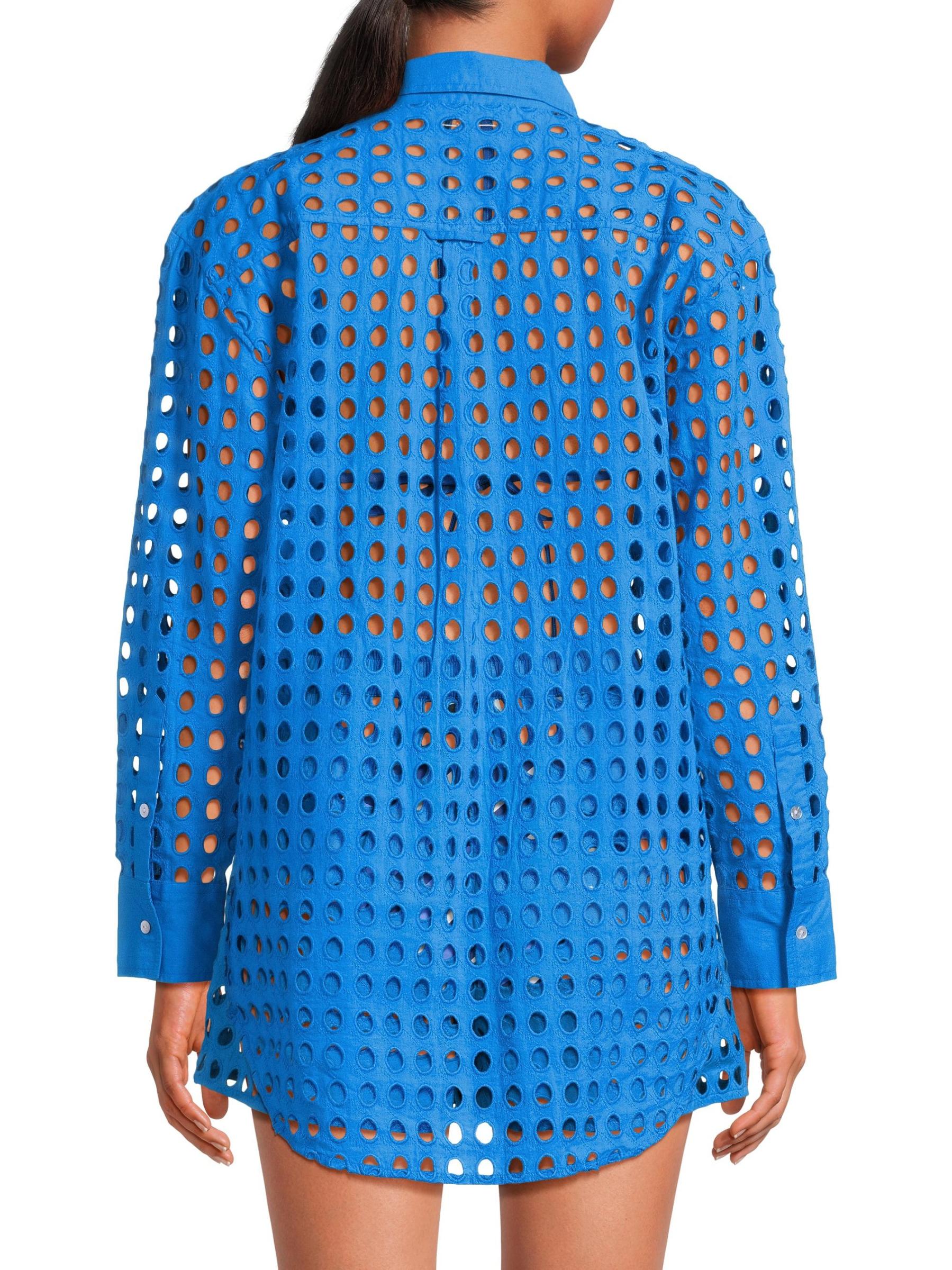 Striped بمقاس مريح، وهو مصنوع من القطن ويتميز بتصميم مُطرز على شكل ثقوب.طوق سبريد أكمام طويلة إغلاق بأزرار أمامية قطن بنسبة 100% يُغسل في الغسالة مستوردة