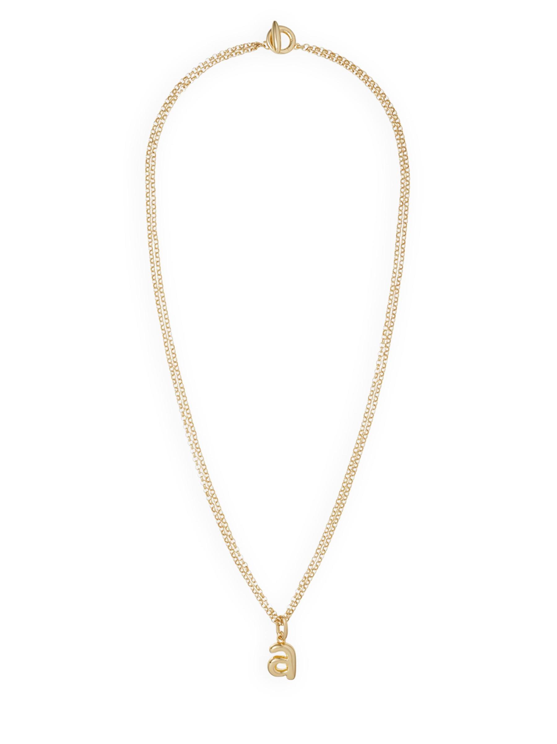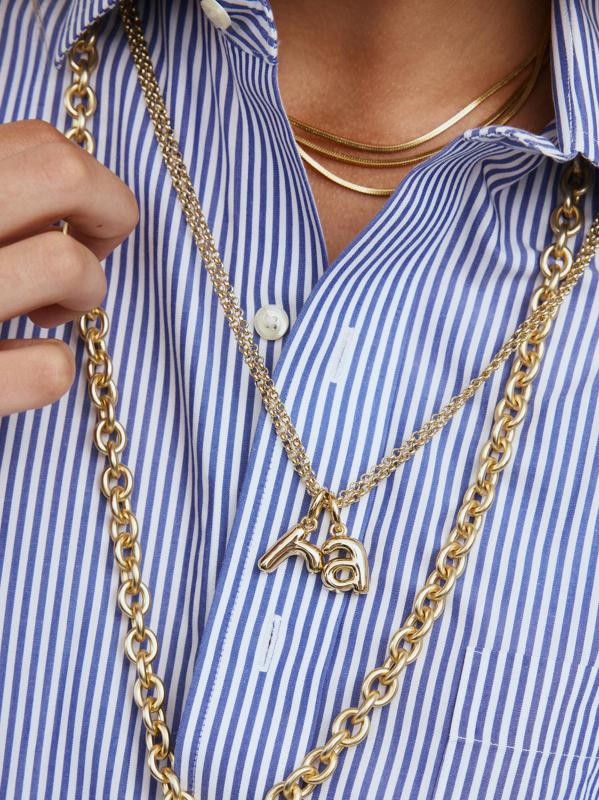 تسلط قلادة Puffy Initial من Roxanne Assoulin الضوء على سلسلتي كابل باللون الذهبي ترسيان حلية الحروف المنتفخة.