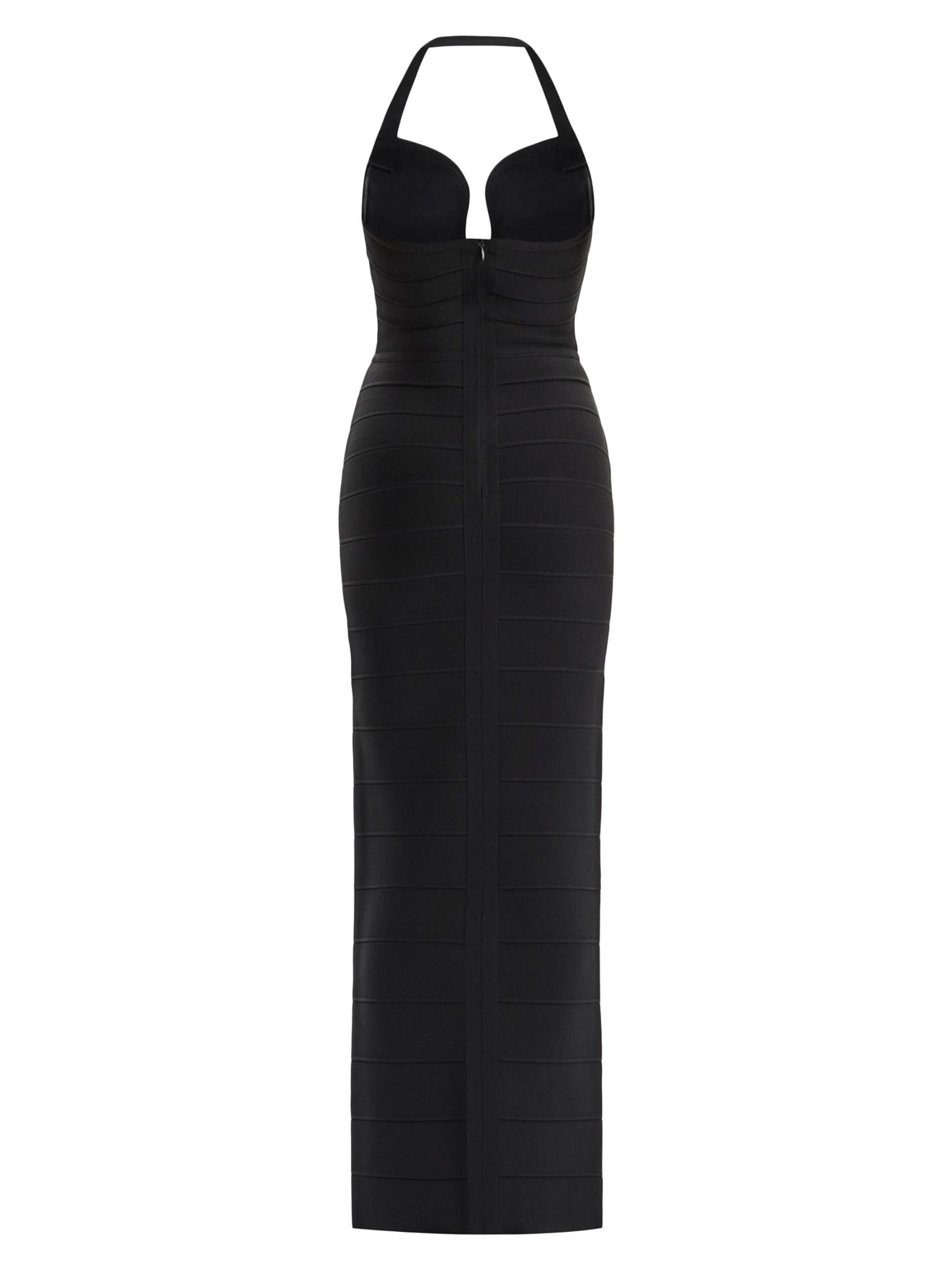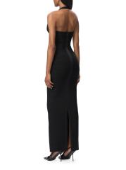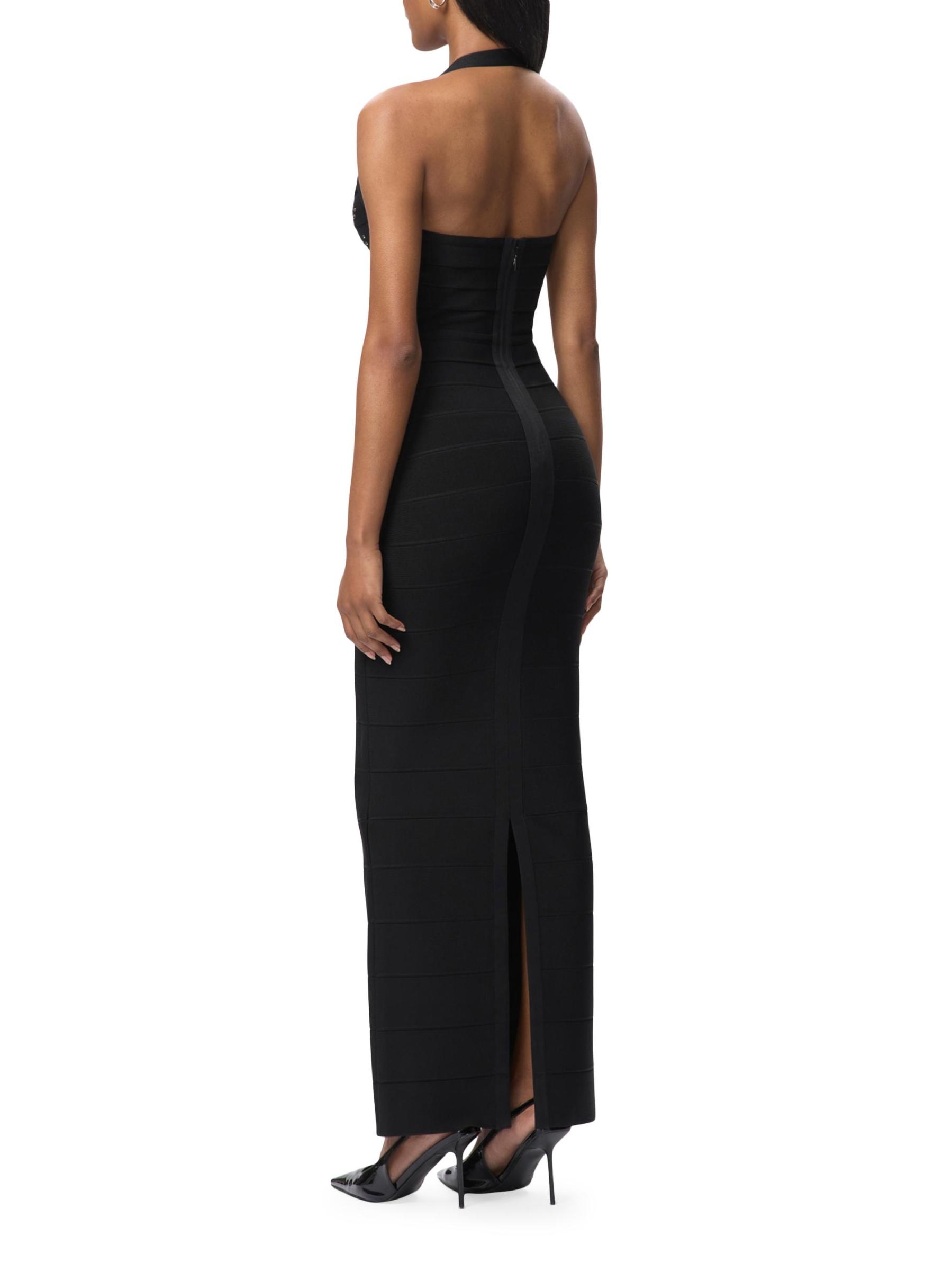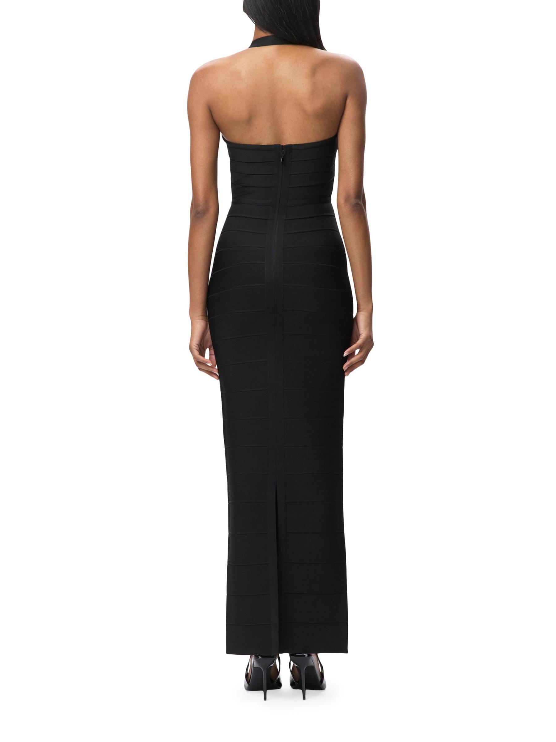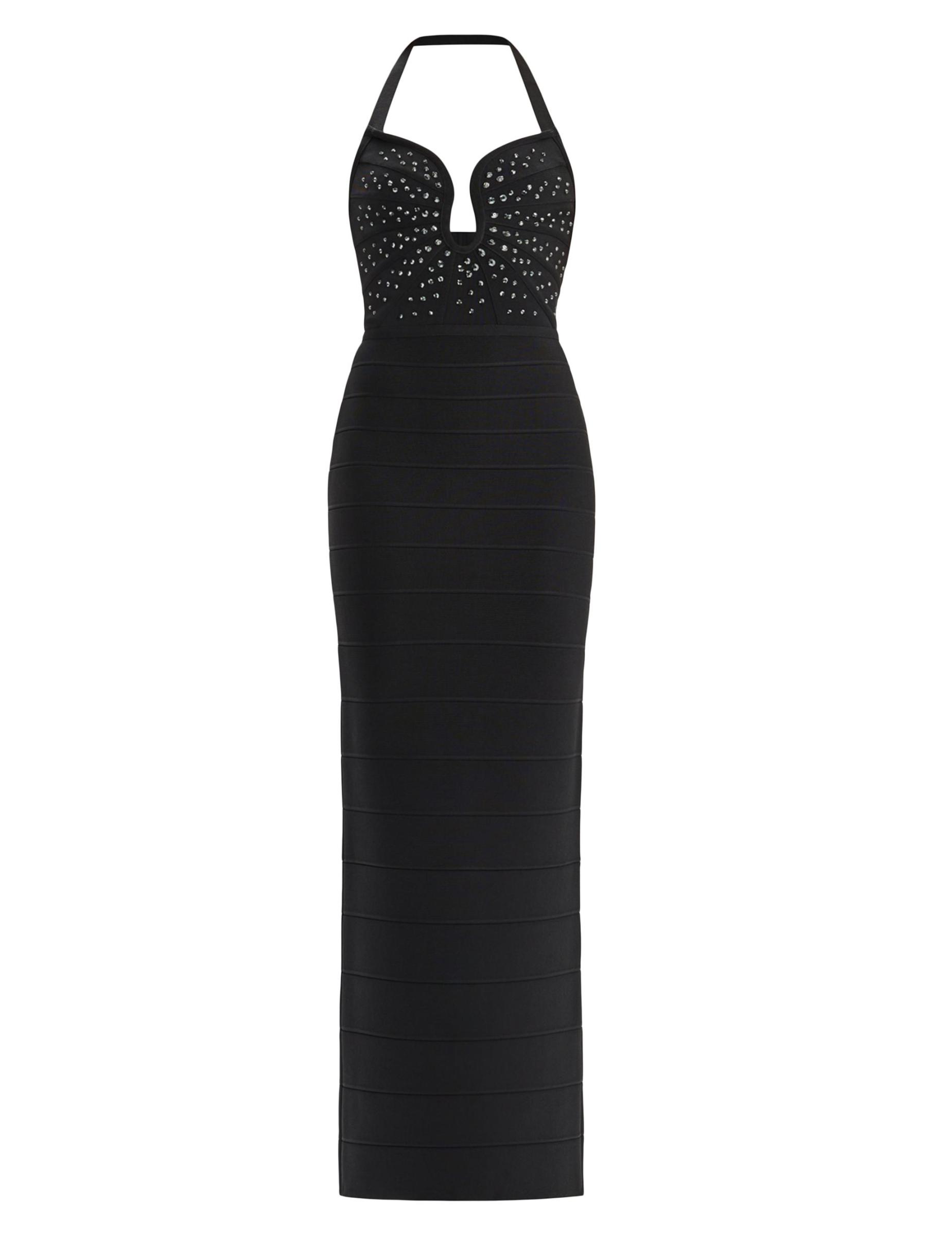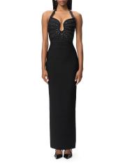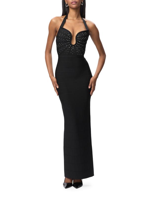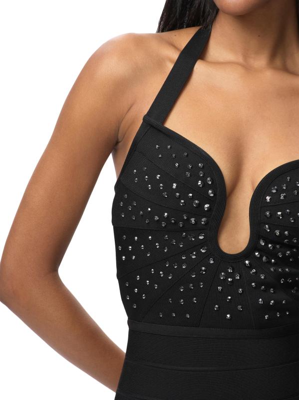 تم تزيين فستان The Reina من Hervé Léger بتفاصيل كريستالية على الصدر. صُممت هذه القطعة لتنعيم الشكل بتفاصيل ضمادة مميزة، وتتميز بتقويرة واسعة وتنورة عمودية ضيقة.فتحة رقبة واسعة على شكل قلب أحزمة هالتر شق خلفي إغلاق بسحّاب خلفي مخفي 90% رايون/ 9% نايلون/ 1% سباندكس تنظيف جاف مستوردة