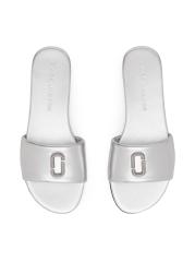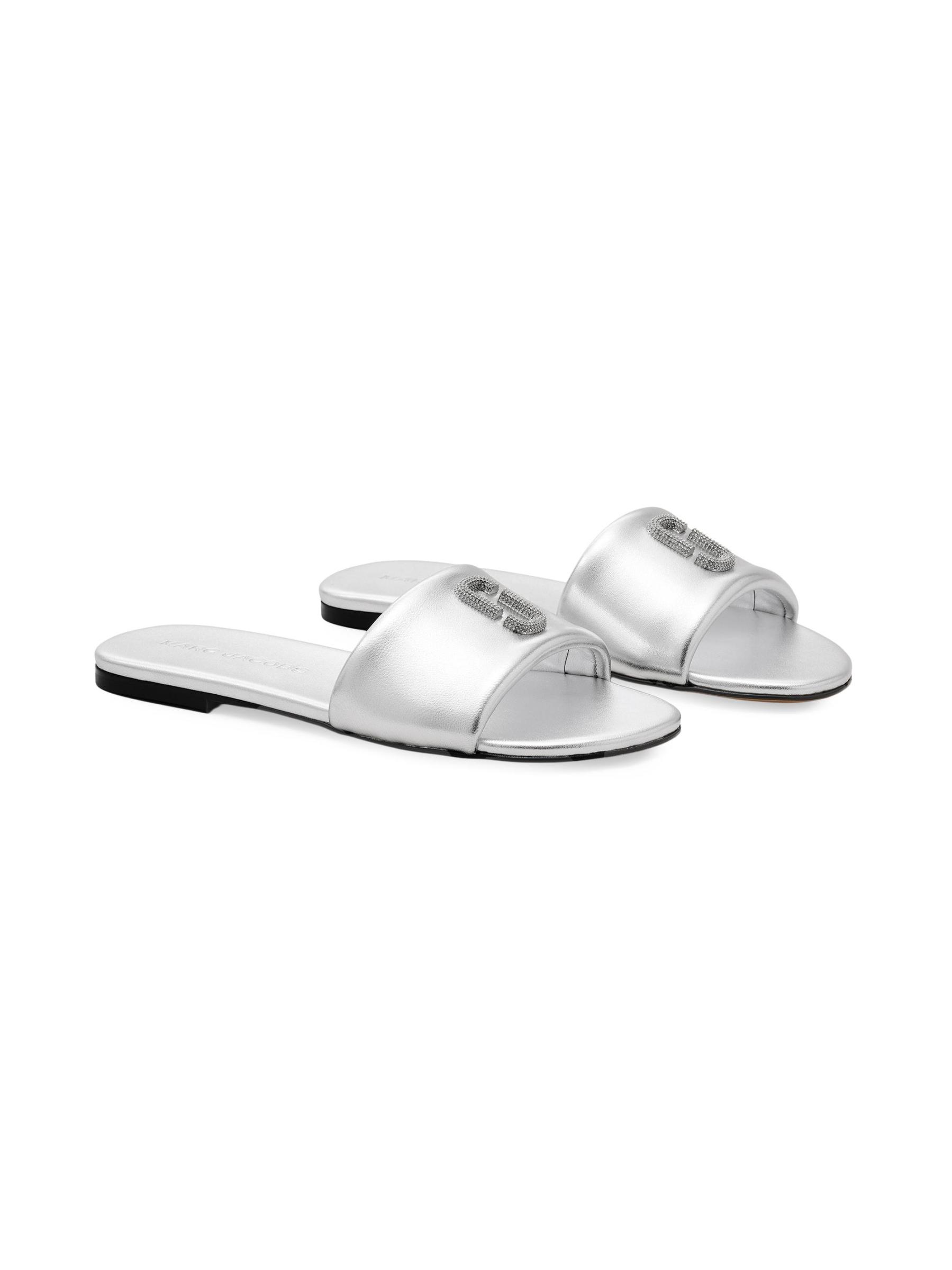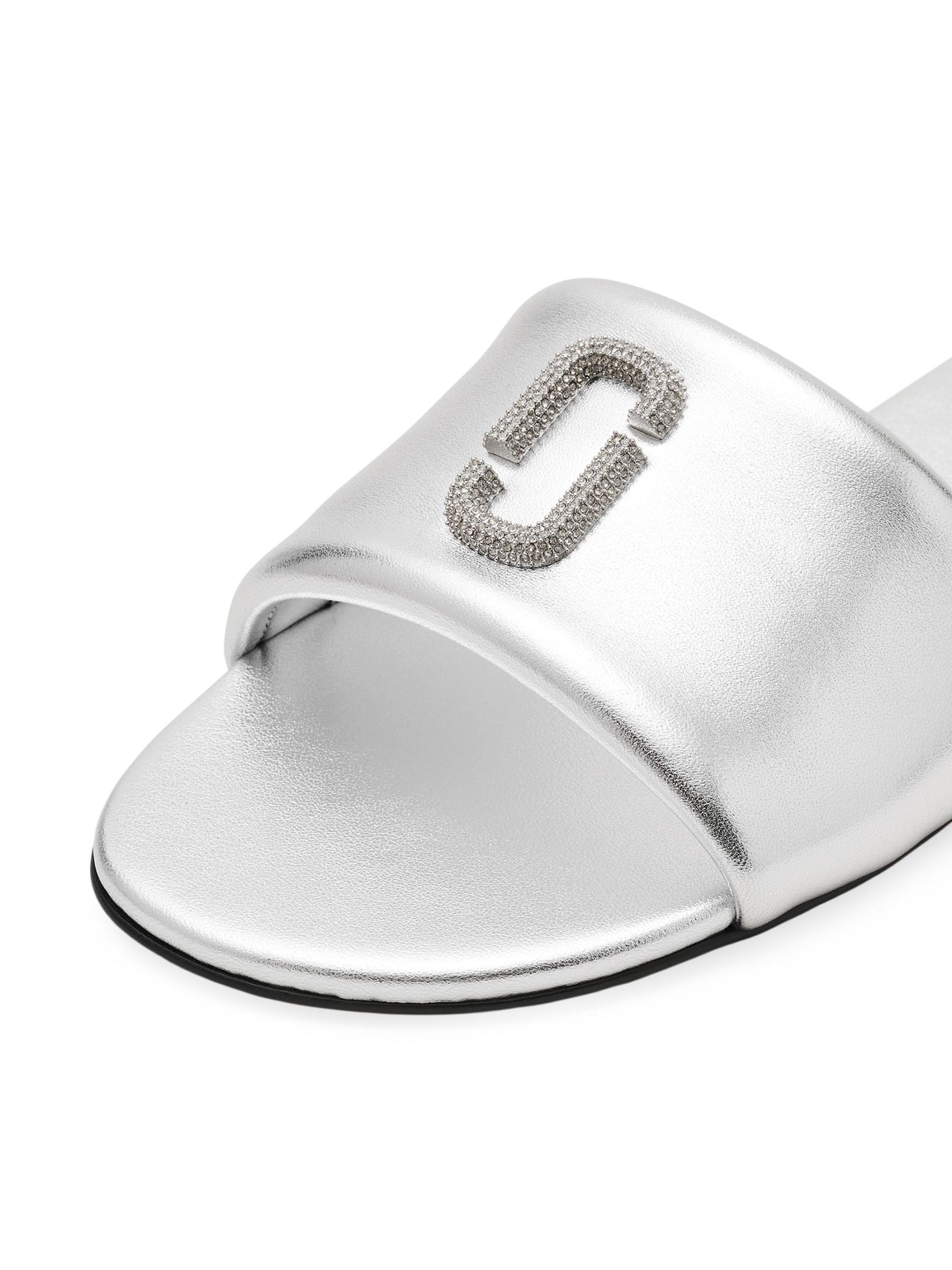صُنعت شرائح Snapshot من Marc Jacobs من الجلد، وتتميز بحزام مطاطي عريض واحد مزين بجرأة بلوحة شعار مزينة بالكريستال.