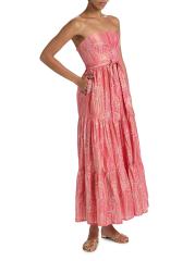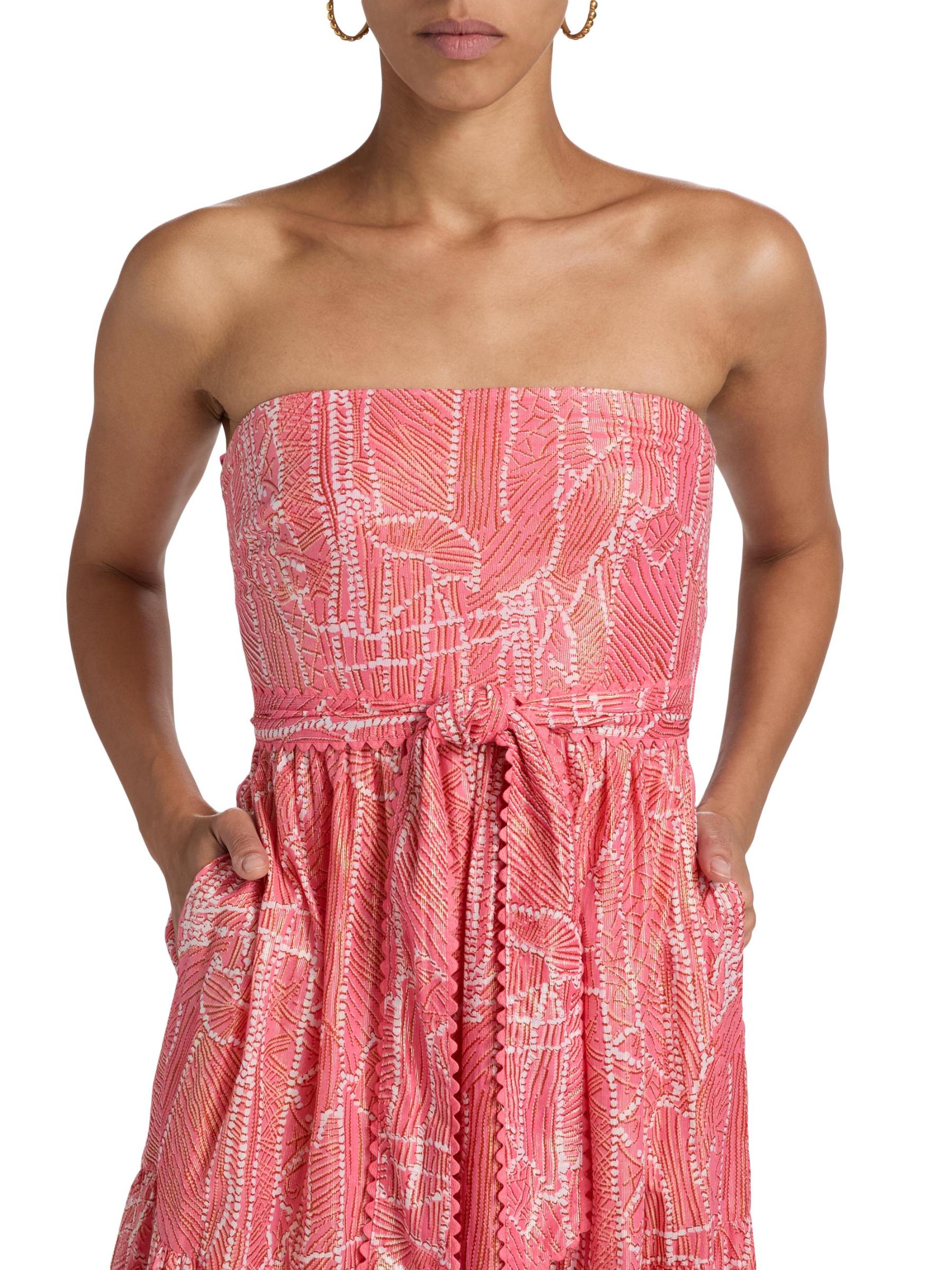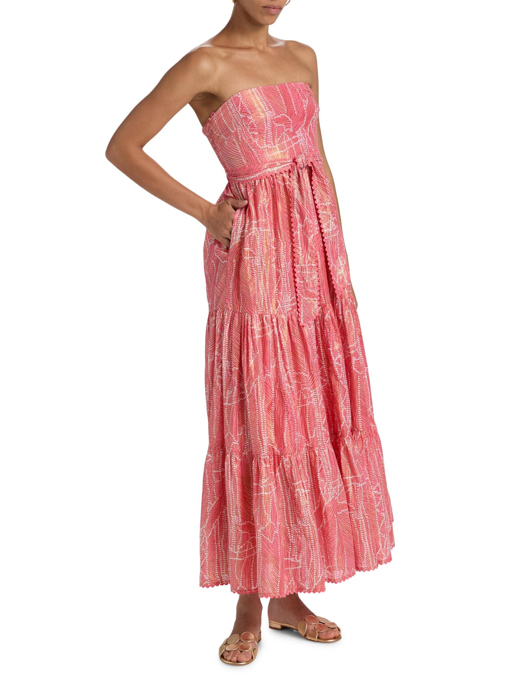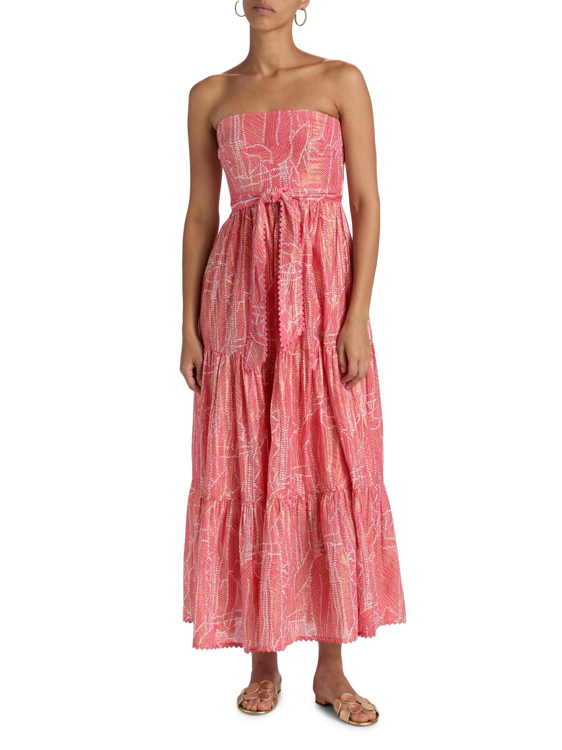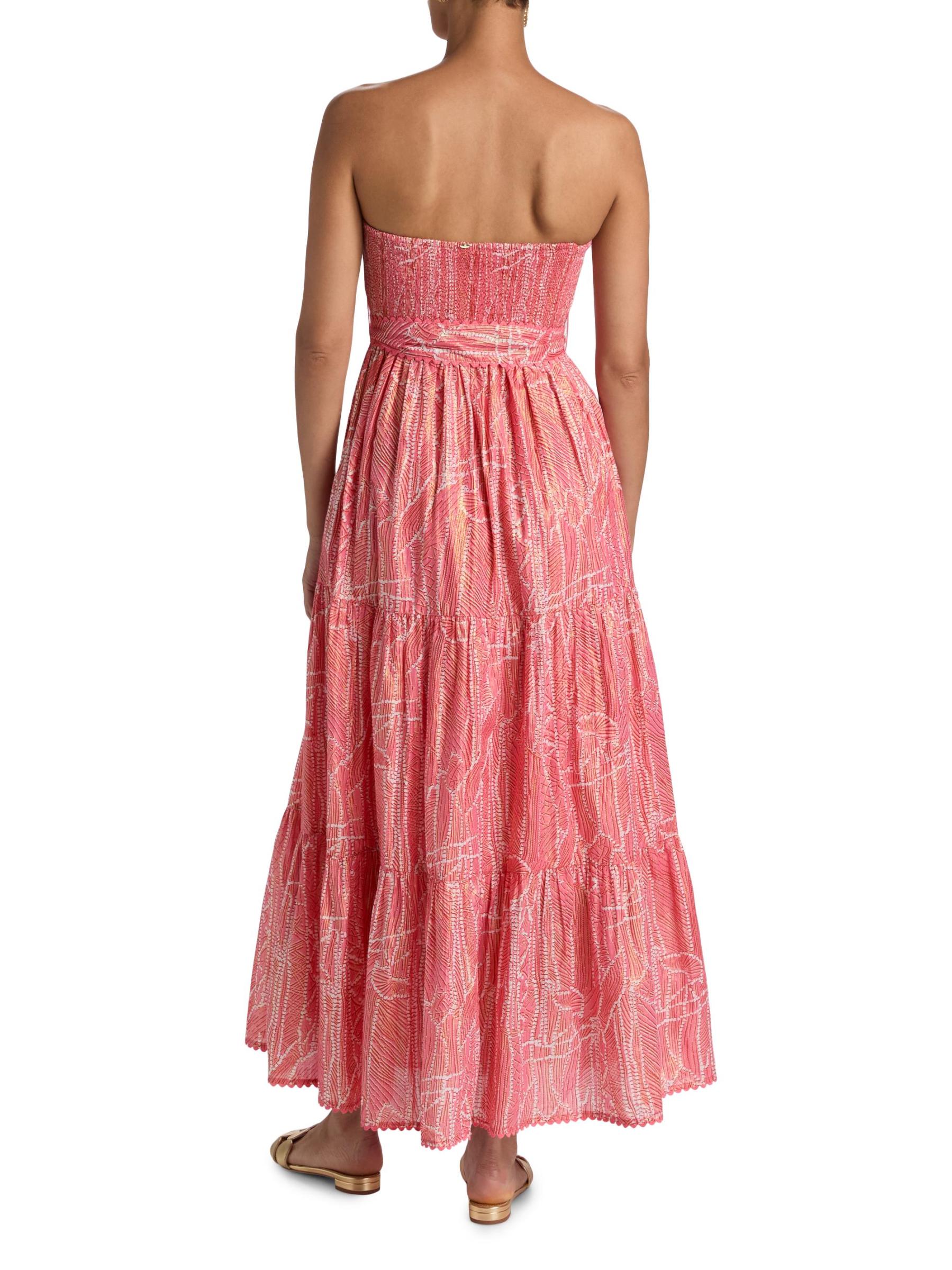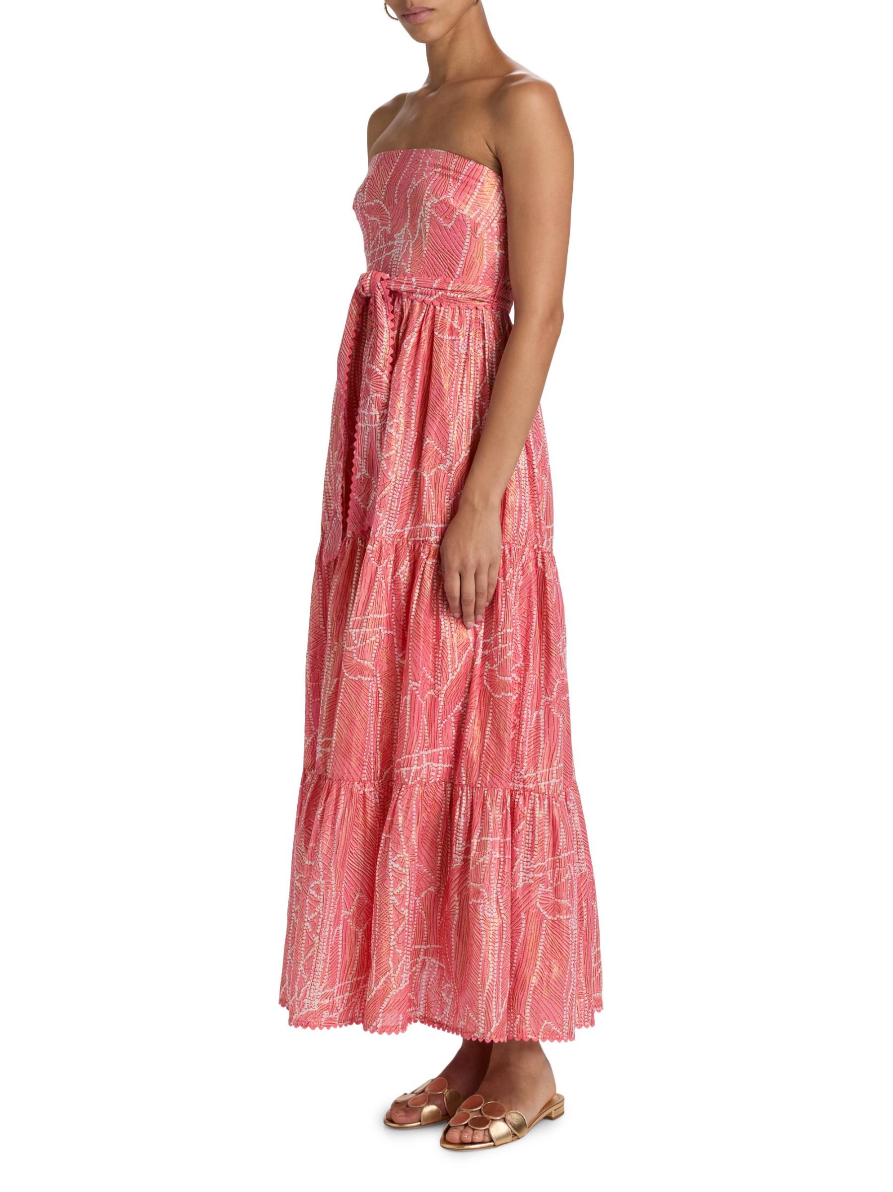 تم تصميم ماكسي Poupette St Barth بدون حمالات من القطن الخفيف، مع تفاصيل بنقشة ديناميكية، وحزام صدفي برباط ذاتي، وتنورة ذات طبقات.