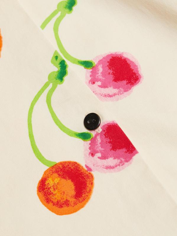 من مجموعة هذه المرة. يُبرز فستان SWF القصير المصنوع من القطن نقشة الكرز الساحرة. تتميز هذه القطعة برقبة على شكل حرف V وقصة بلا أكمام وإغلاق بأزرار أمامية
