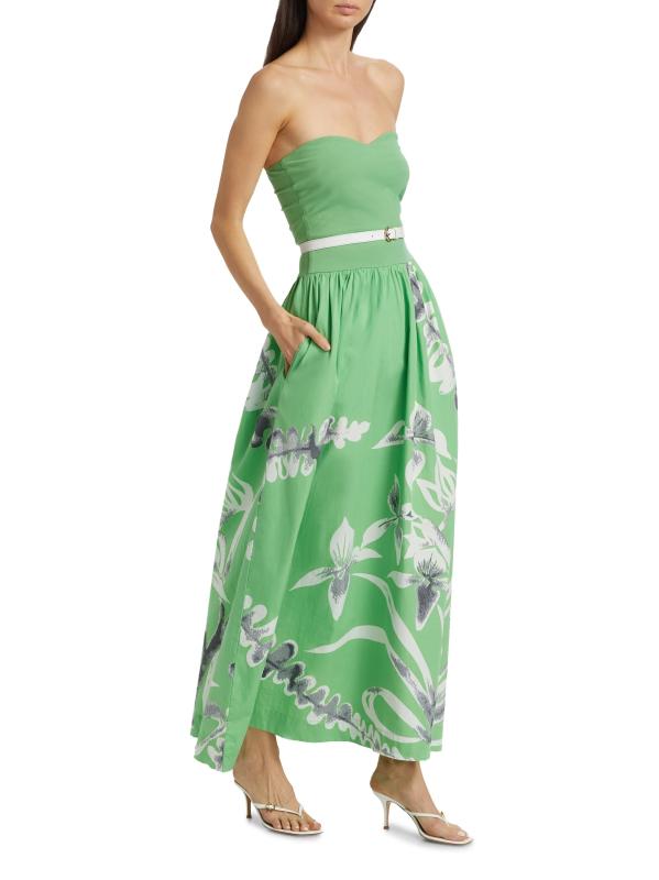 من مجموعة هذه المرة. يُبرز هذا الفستان الطويل من SWF تصميمًا منقسمًا، ويتميز بصدّار متين برقبة على شكل قلب وتنورة منقوشة مع جيوب جانبية.