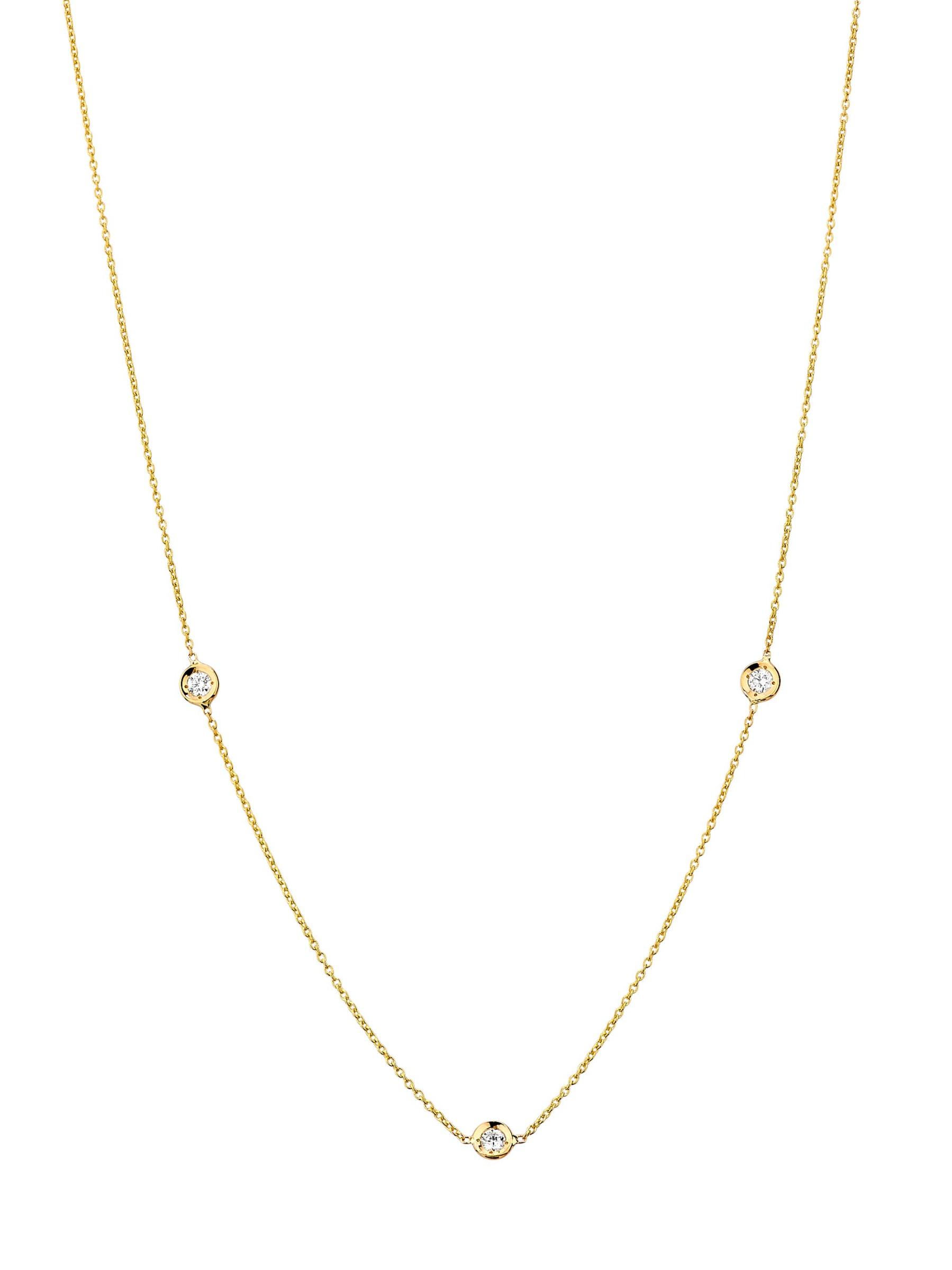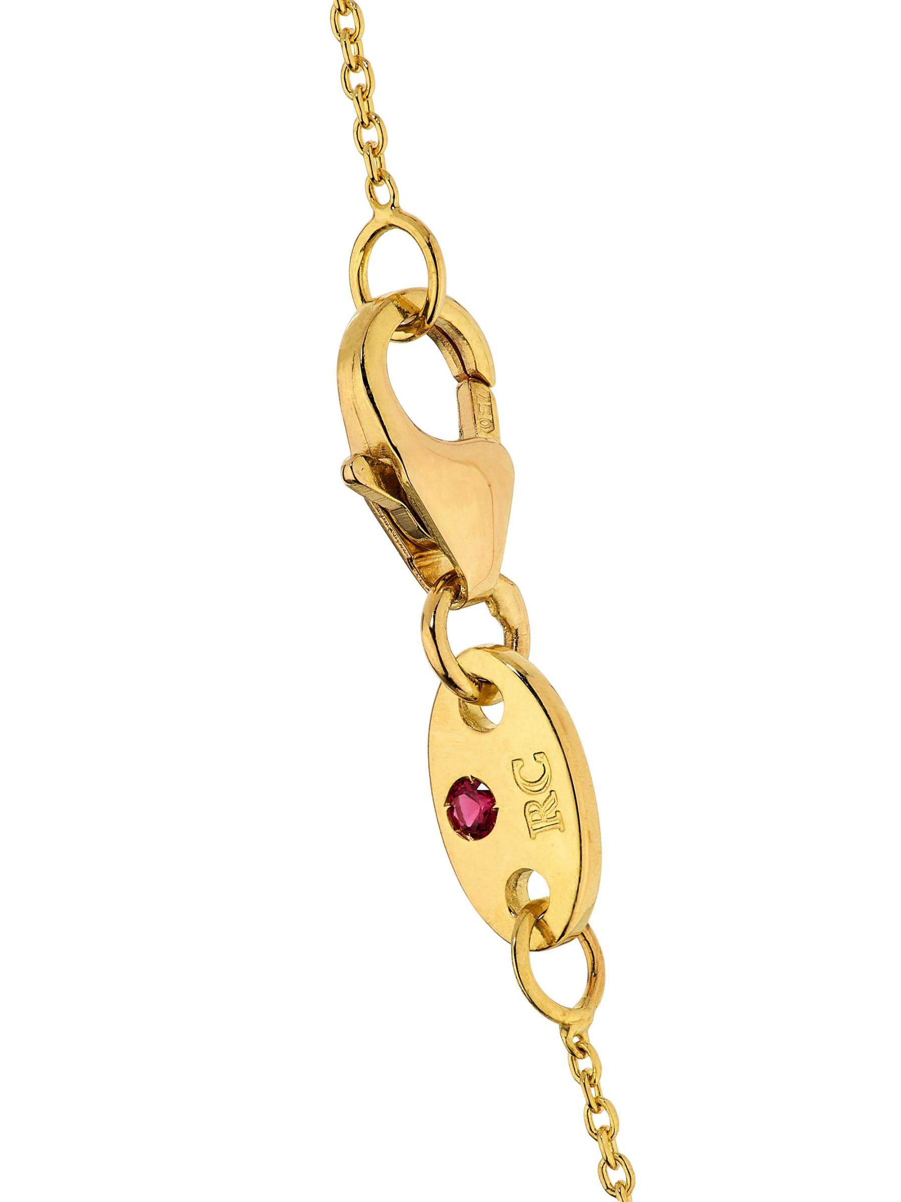 من مجموعة الكنوز الصغيرة. تتميز هذه القلادة من روبرتو كوين، المصنوعة من الذهب الأبيض عيار 18 قيراطًا، بثلاث حلقات مستديرة من الماس مثبتة على طول سلسلة كابلات راقية. يقوم مصمم المجوهرات الشهير بتوقيع كل قطعة بحجر ياقوتي واحد يوضع في مكان مخفي.