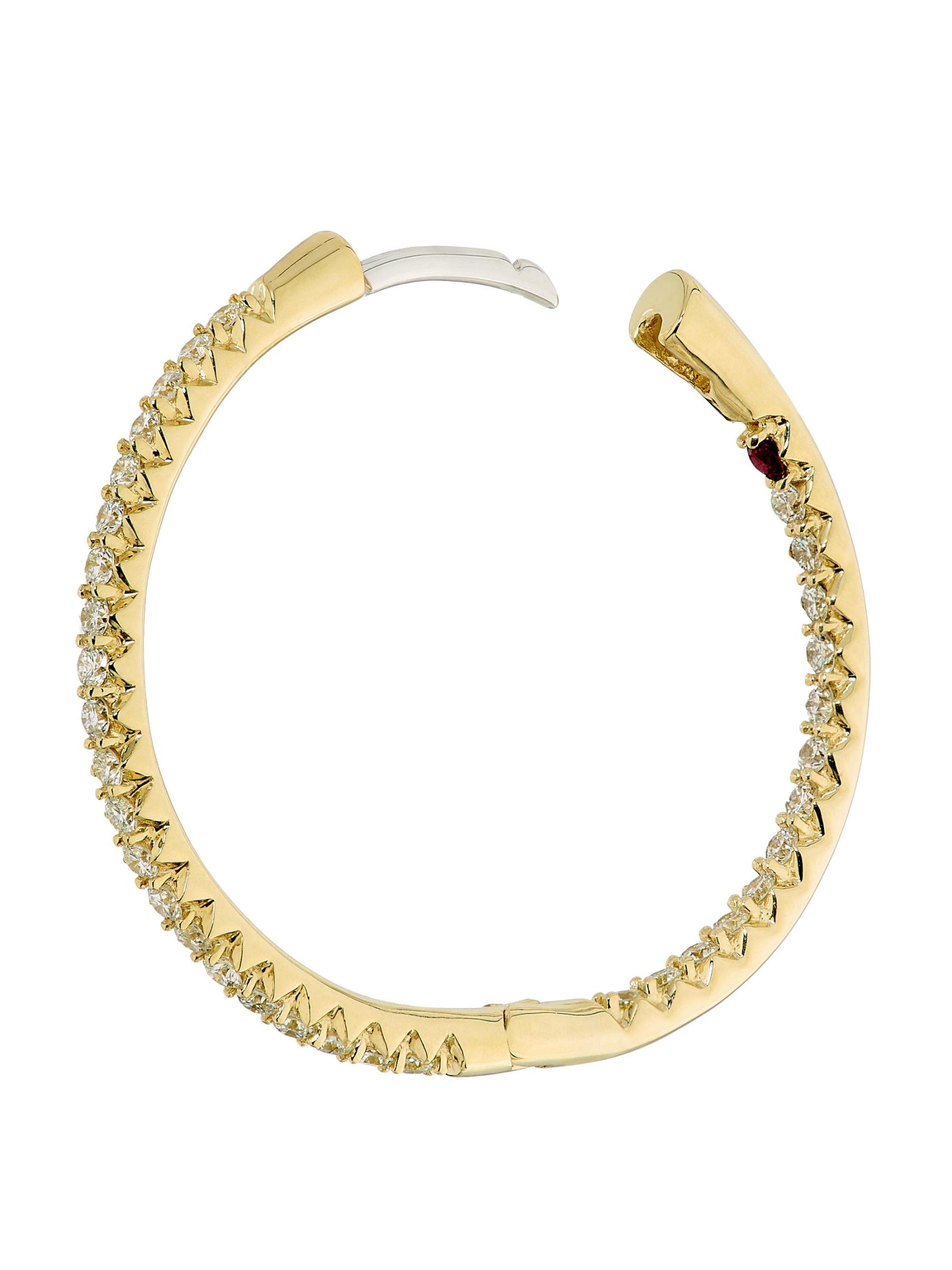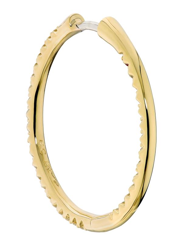 من مجموعة الكنوز الصغيرة. تحيط أحجار الماس المتلألئة بالحلقة الأمامية والداخلية لأقراط روبرتو كوين المصنوعة من الذهب الأصفر عيار 18 قيراطًا. يقوم المصمم بتوقيع كل قطعة بحجر ياقوتي واحد يوضع في موضع مخفي.