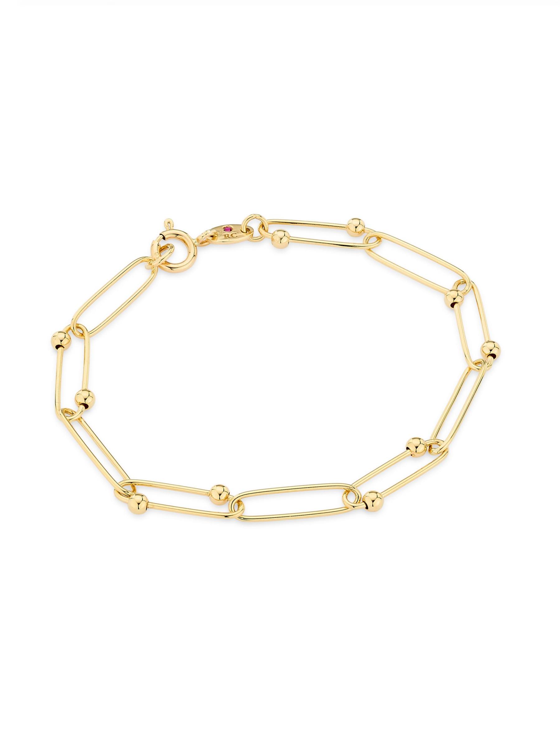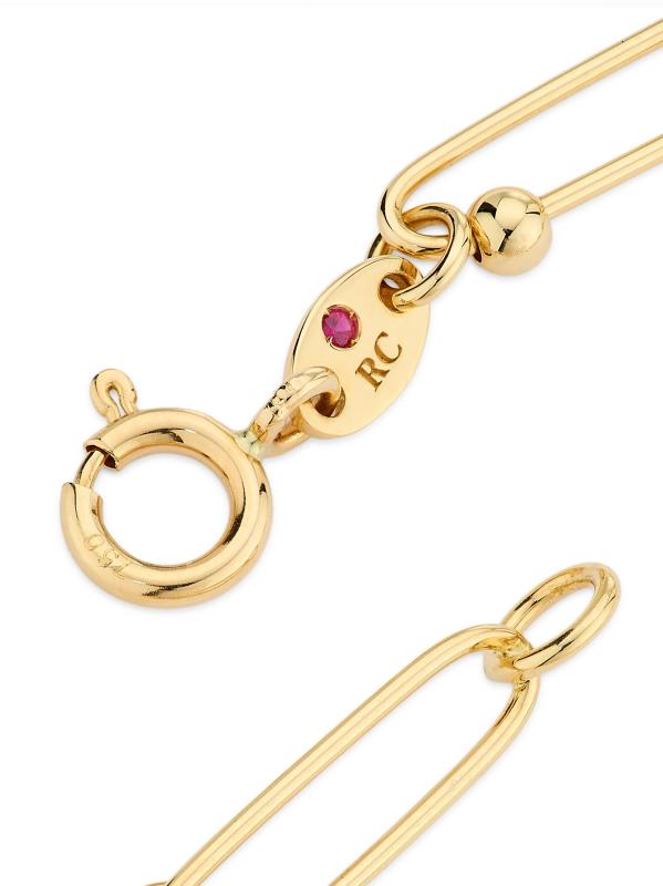 من مجموعة الكنوز الصغيرة. سوار روبرتو كوين ذو السلسلة الكروية هذا مصنوع من الذهب الأصفر المصقول عيار 18 قيراطًا. يقوم مصمم المجوهرات الشهير بتوقيع كل قطعة بحجر ياقوتي واحد يوضع في مكان مخفي.