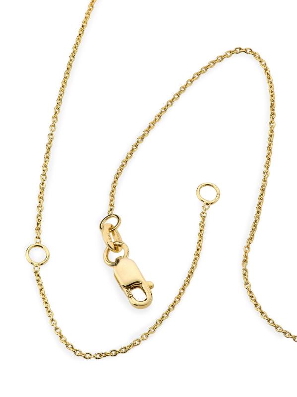 من مجموعة الكنوز الصغيرة. تصميم روحي يتلألأ بالألماس من الذهب عيار 18 قيراطًا على قلادة على شكل سلسلة.ألماس، 0.18 طن ذهب أبيض عيار 18 قيراط الطول، حوالي 16 بوصة مع موسع 2 بوصة مقاس القلادة، حوالي 0.5 بوصة مشبك لوبستر صُنع في إيطاليا