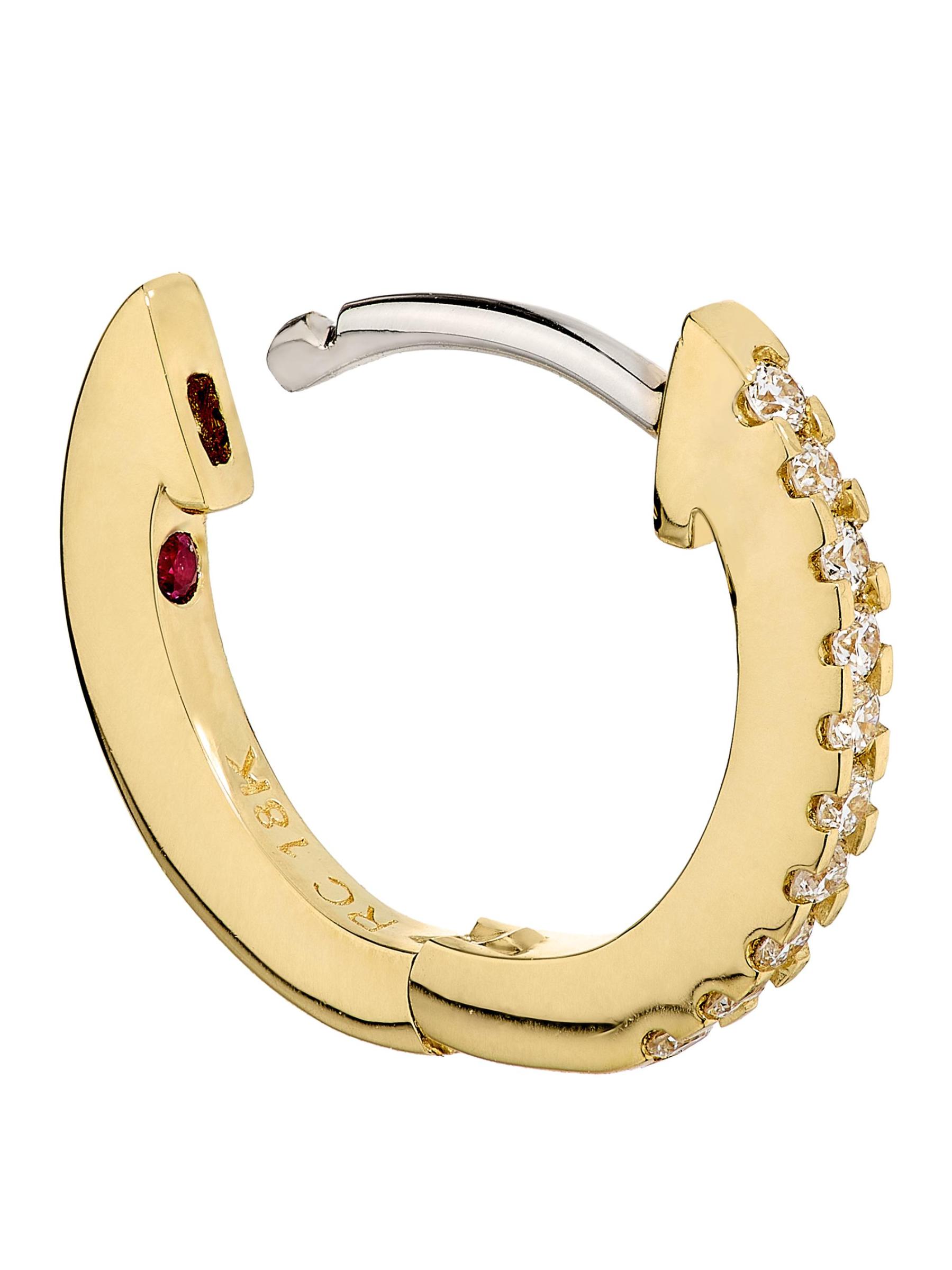 أقراط Huggie الصغيرة من الذهب الأصفر عيار 18 قيراطًا والياقوت والألماس عيار 0.09 TCW من Tiny Treasures