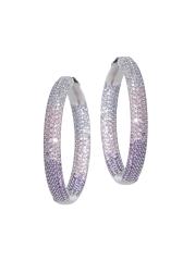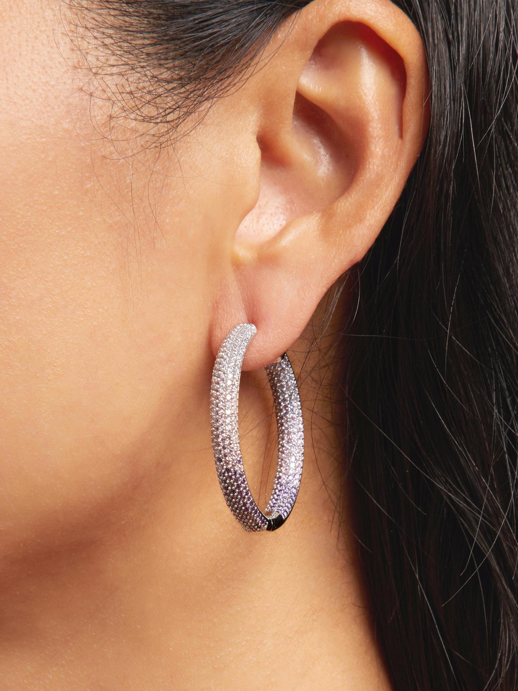 من مجموعة كلاسيك هوبس. تتلألأ أقراط Tire الحلقية من Nickho Rey المصنوعة من فيرميل الروديوم بكريستالات أومبري باللون الأرجواني المرصوف.