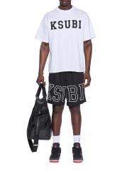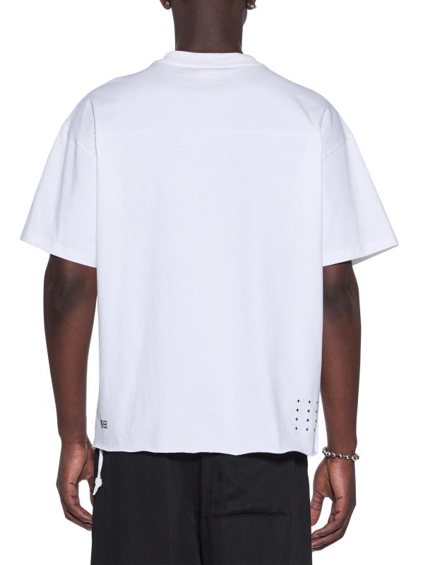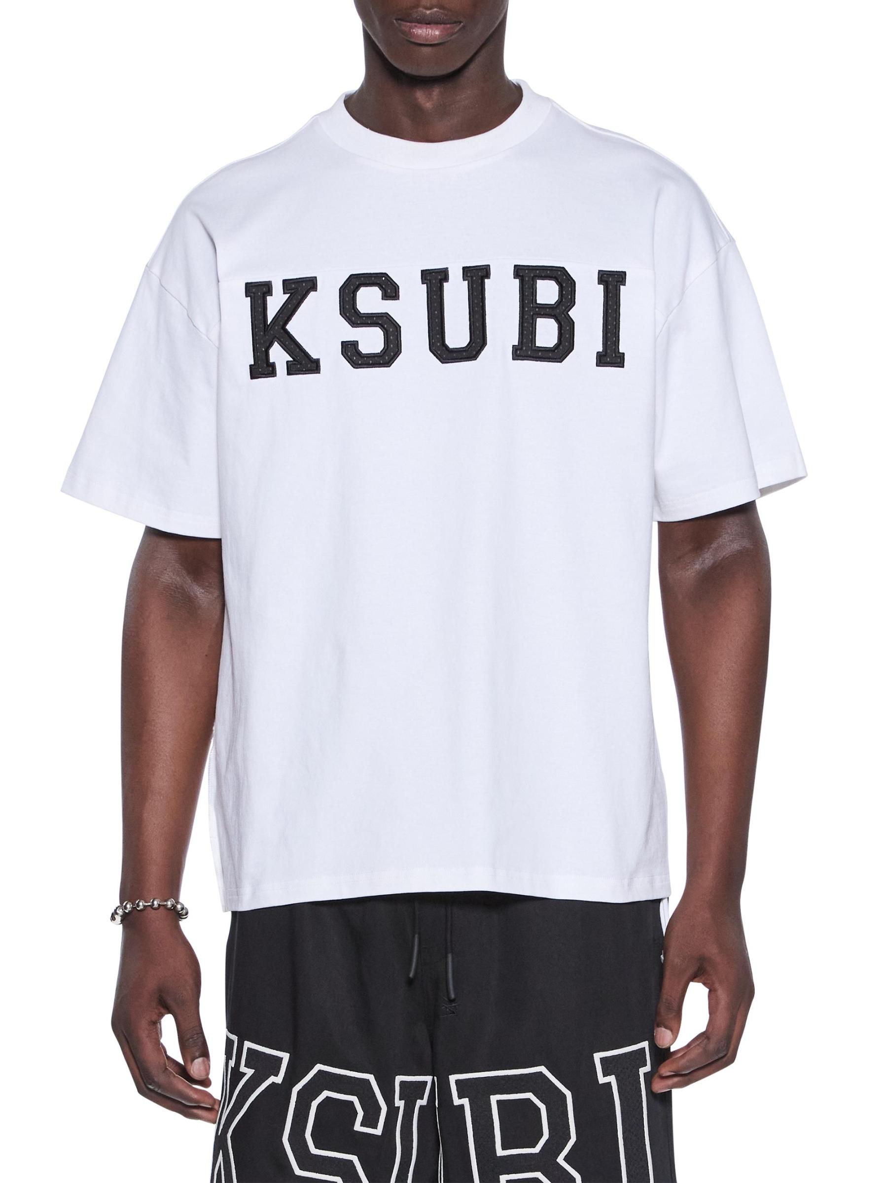 يتميّز تيشيرت Touchdown Ekcess Vintage من Ksubi بحاشية خلفية مقطوعة بشكل خام، ودرزات جانبية مقفلة بشكل عكسي، وذيل الجرذان المميز للعلامة التجارية. يتم تعريف الأسلوب من خلال شعار شبكي رياضي على الأمام وعلامة T-box المميزة وعلامة 4x4 على الظهر.