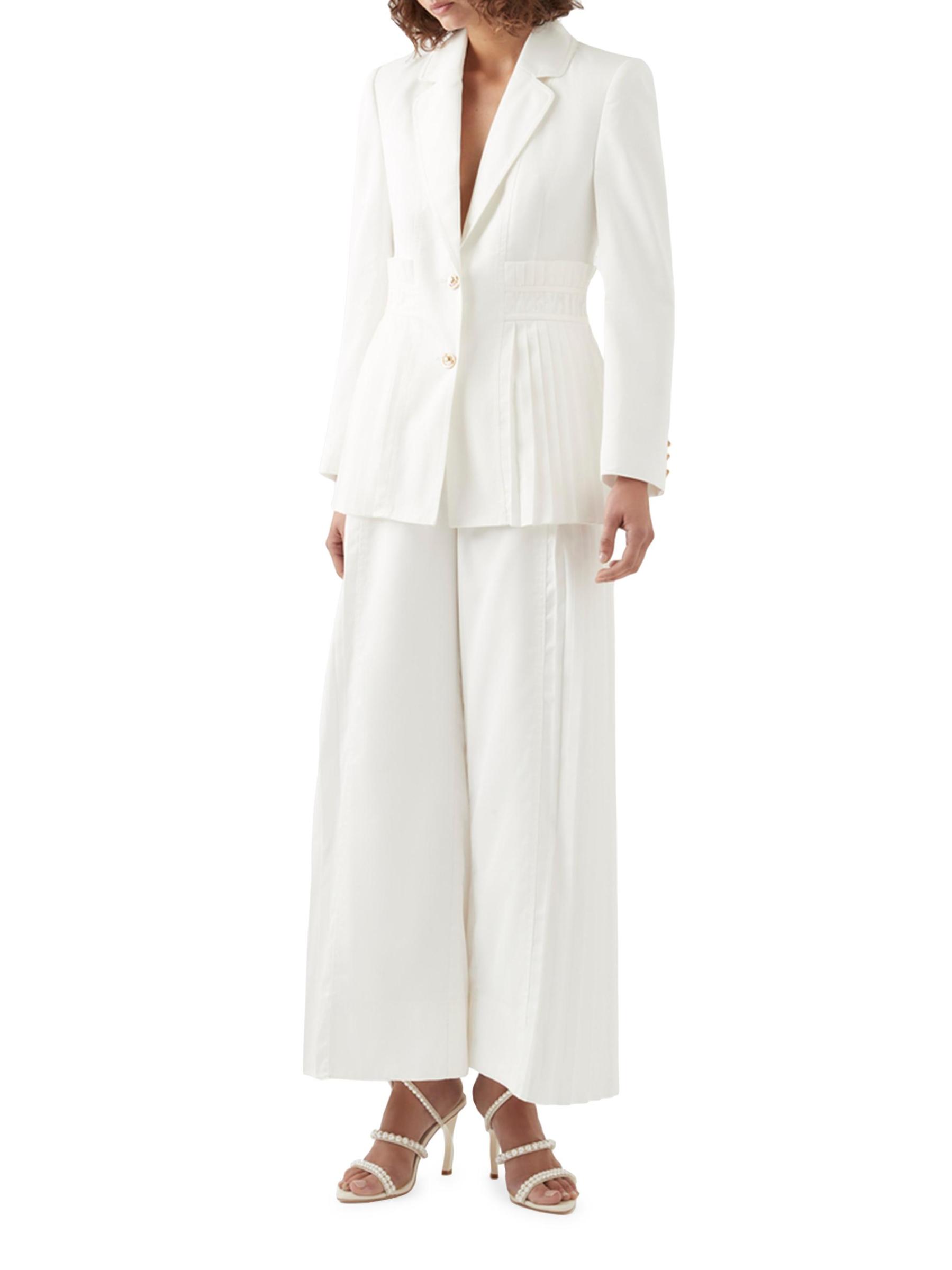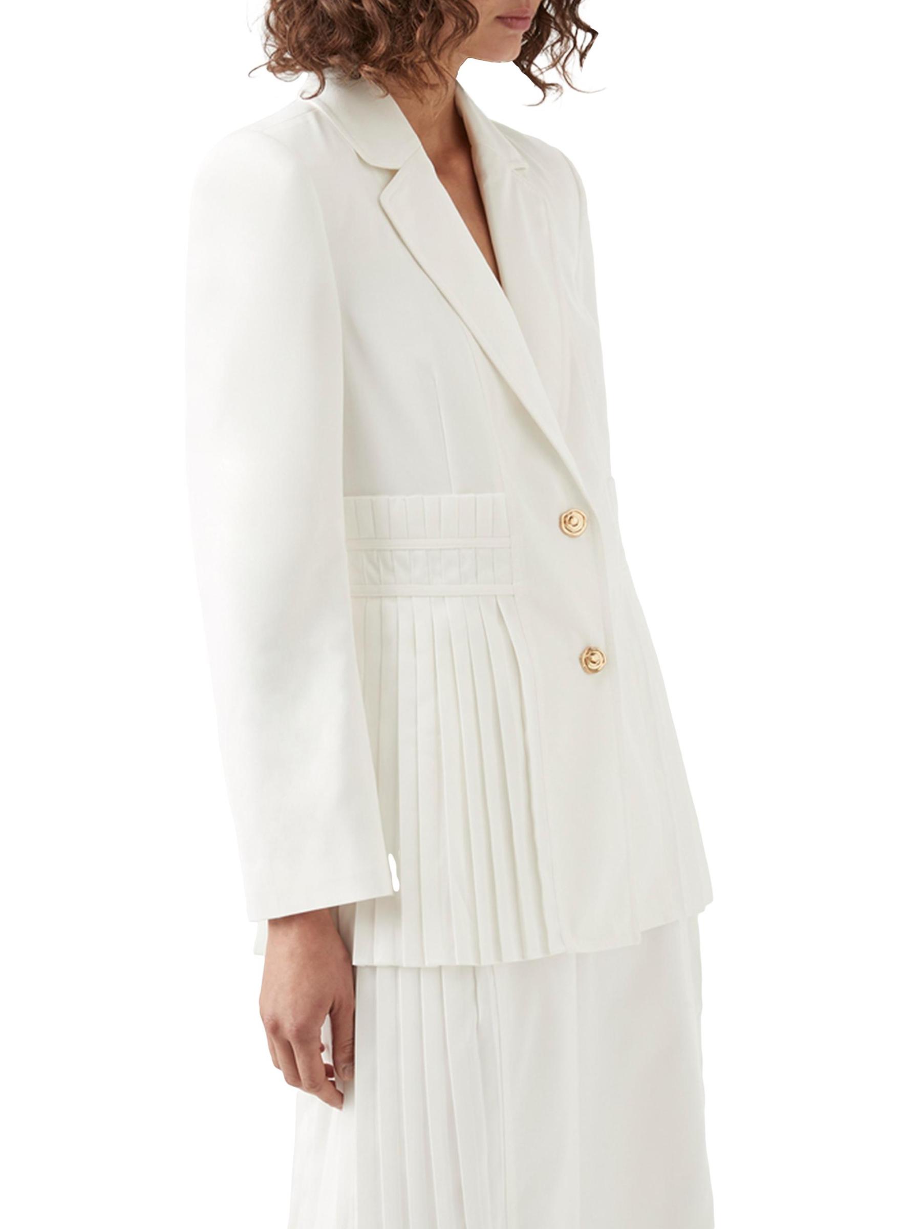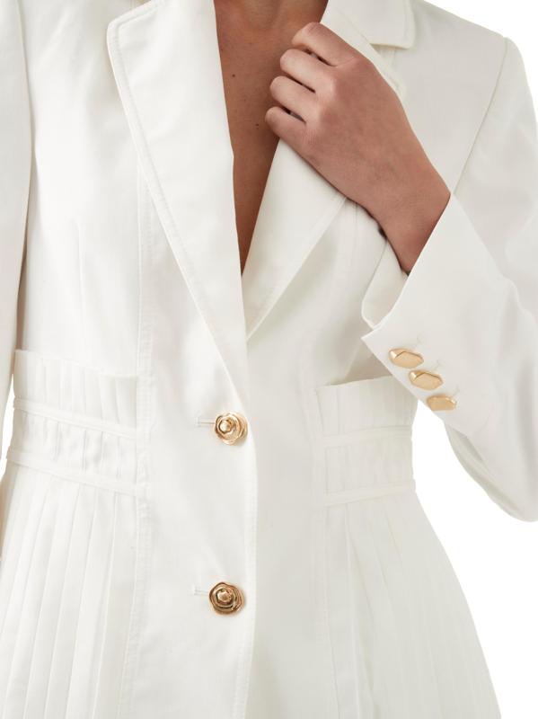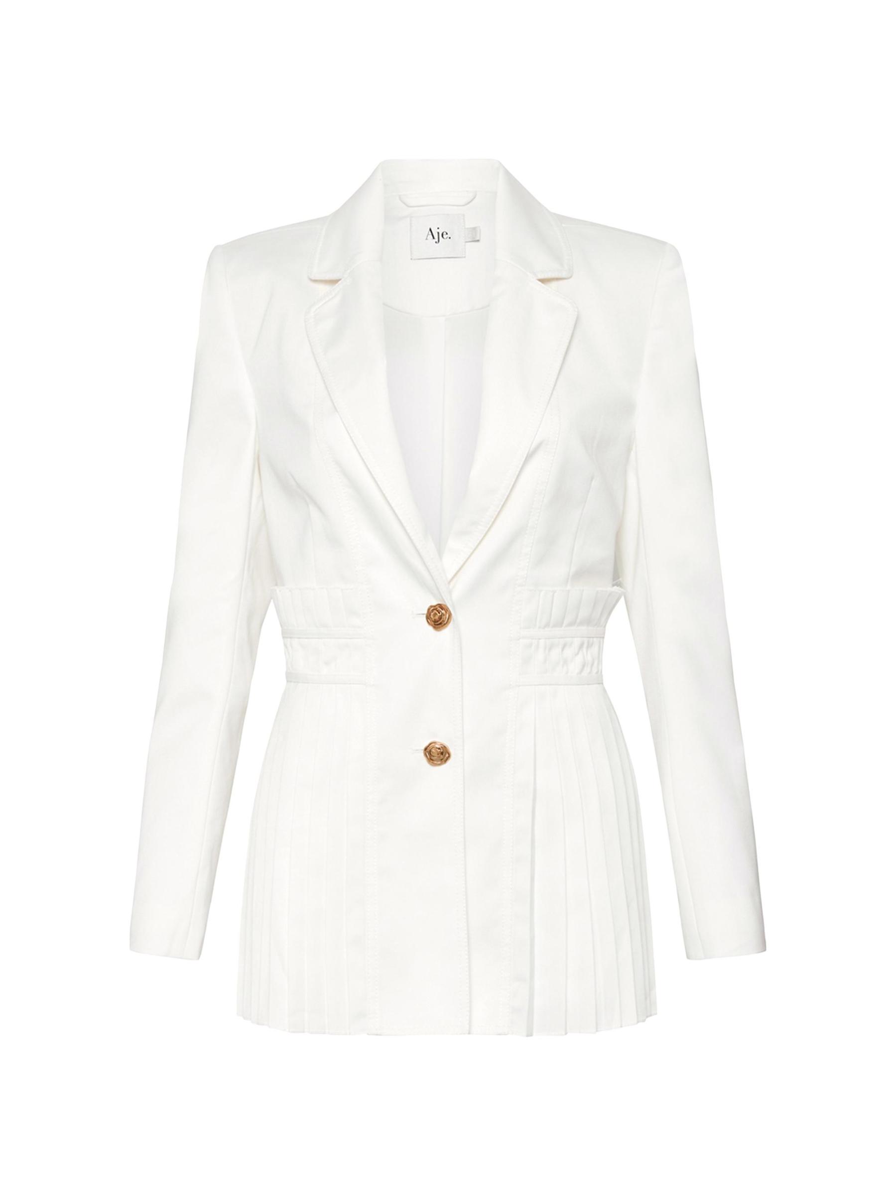 من مجموعة Lumen. يتميز جاكيت ترانكويليتي من Aje بتصميم مصمم خصيصًا مع ألواح مطوية. تضفي تفاصيل الأزرار ذات اللون الذهبي لمسة جمالية على المظهر.