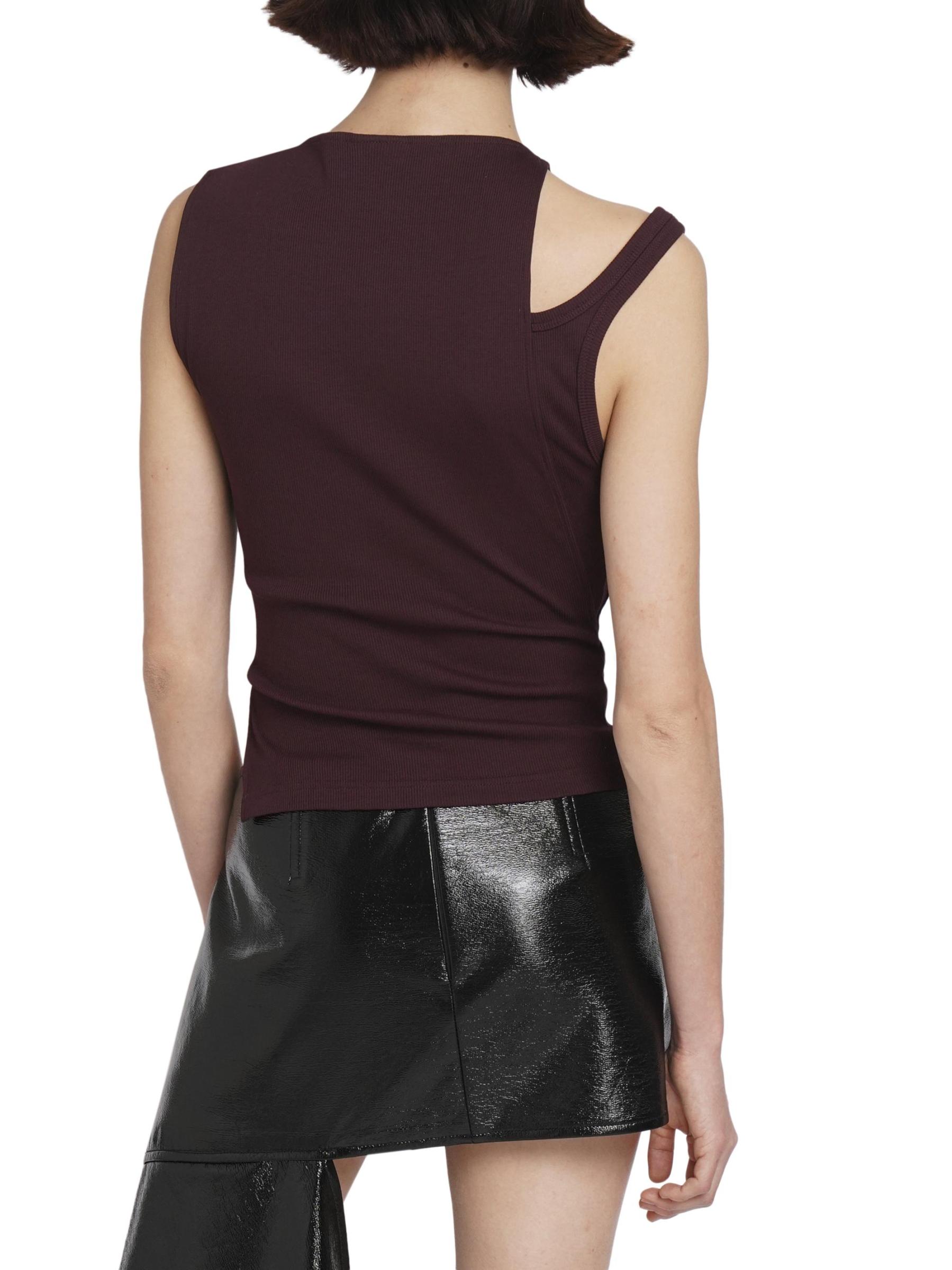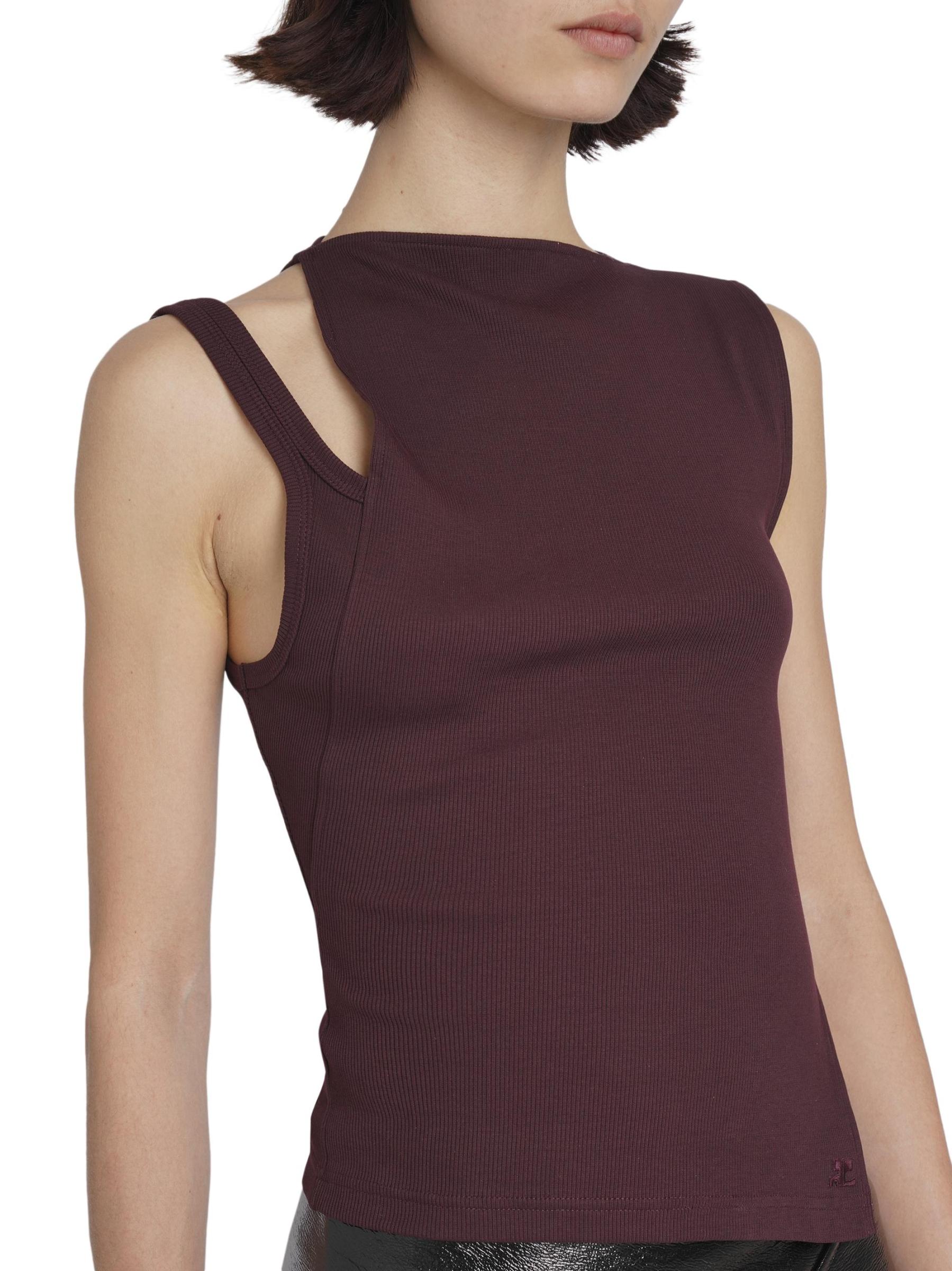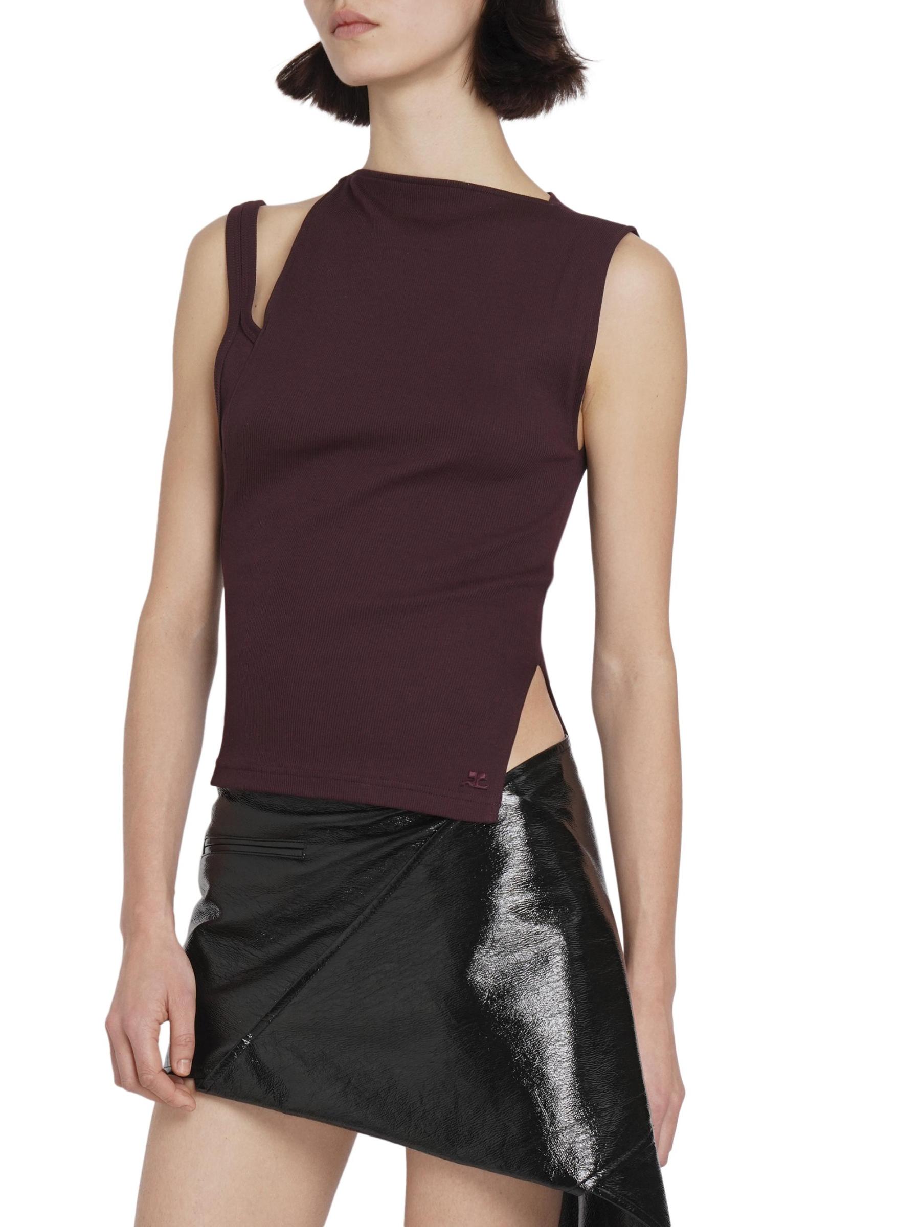 بلوزة Transverse 90s من Courreges مصنوعة من القطن المرن المحبوك، وتتميز برقبة عالية غير متماثلة مع فتحة على الكتف.