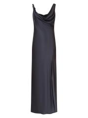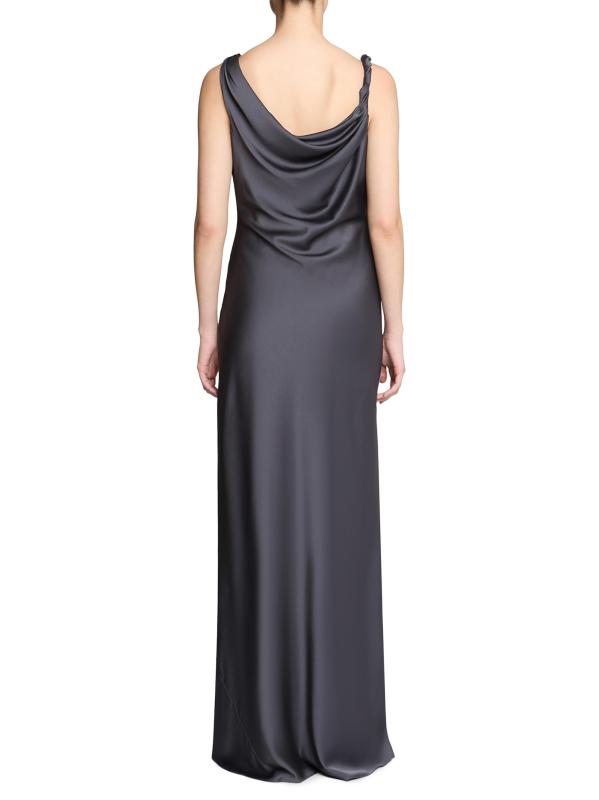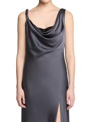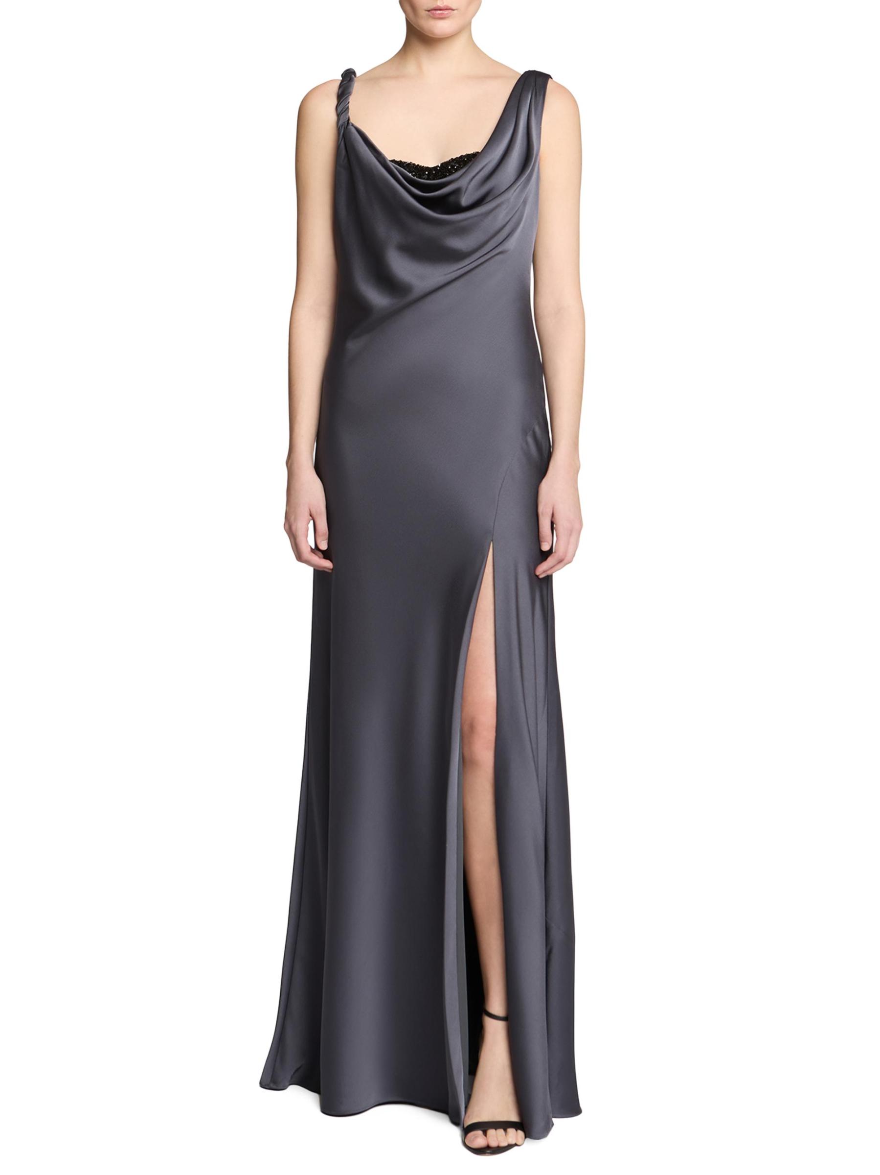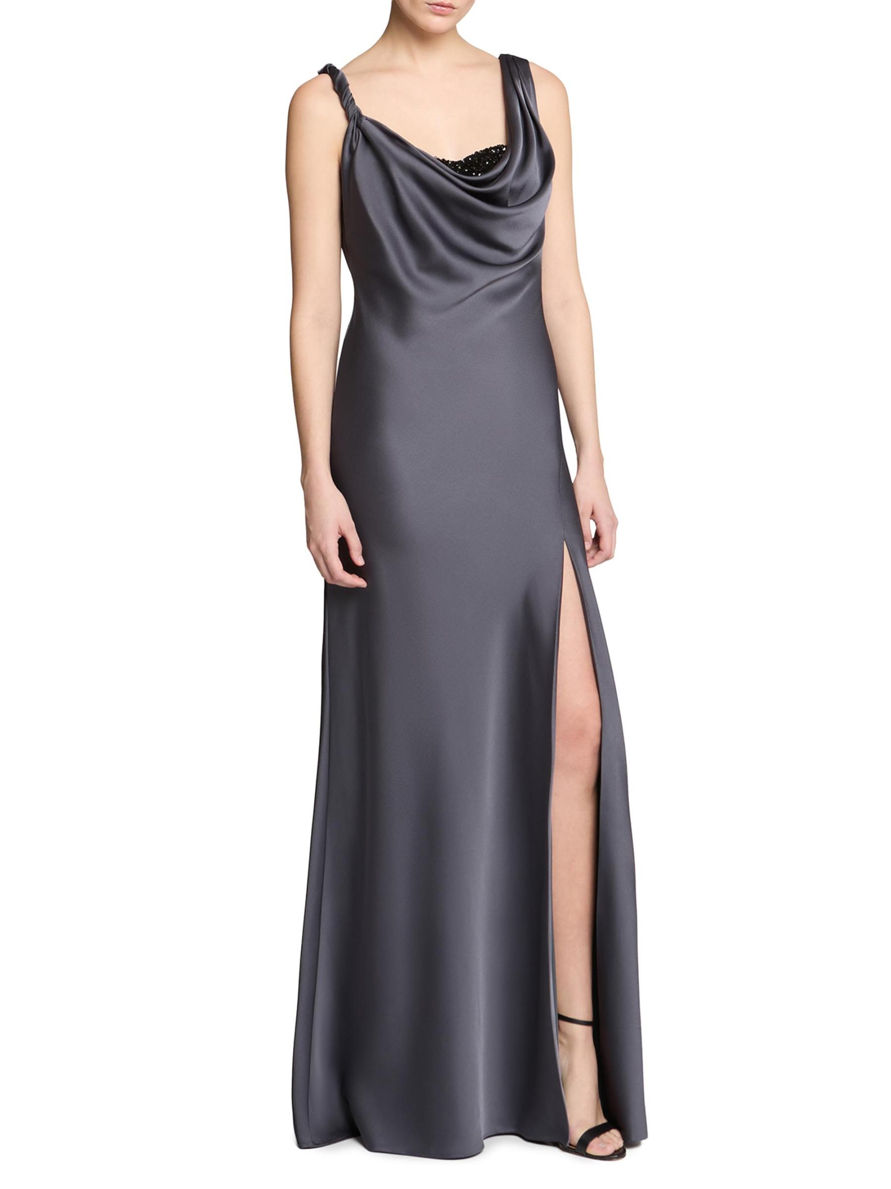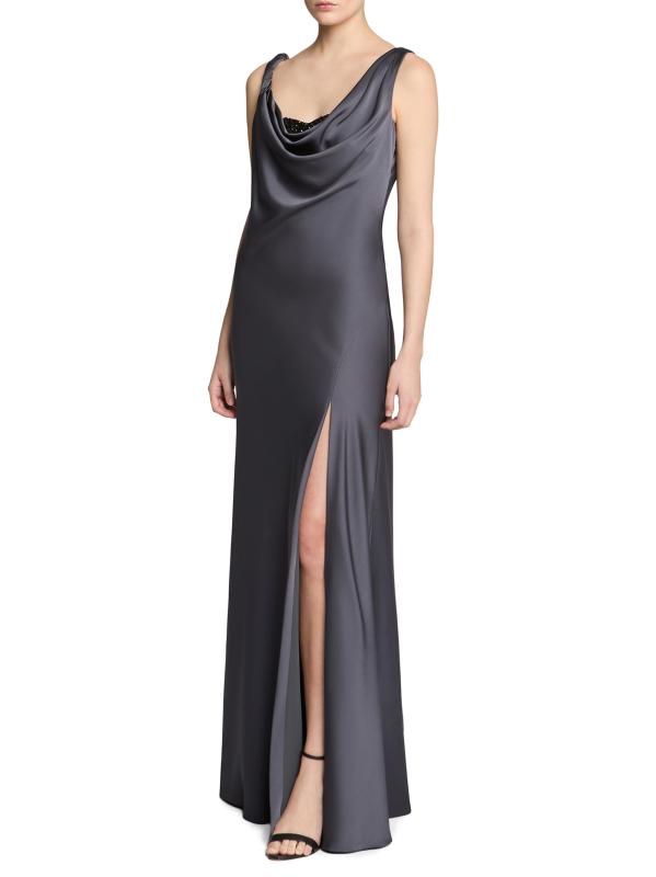 يتميز فستان ترينا هذا من هالستون، المصنوع من الساتان المدعوم بالكريب، برقبة على شكل قوس مزينة بالخرز.