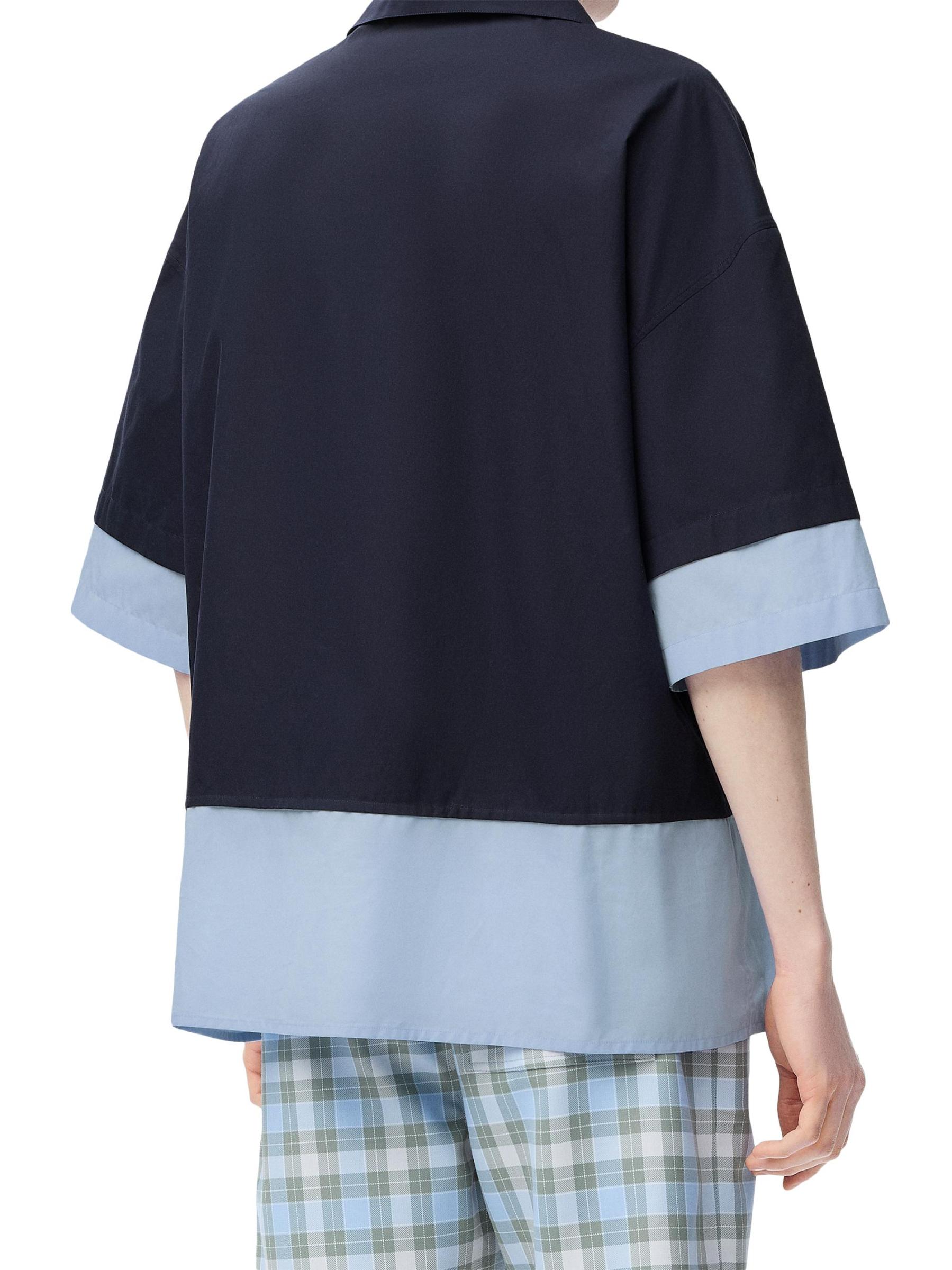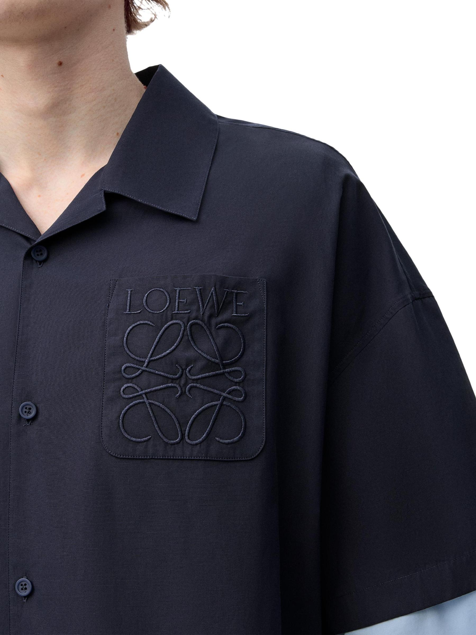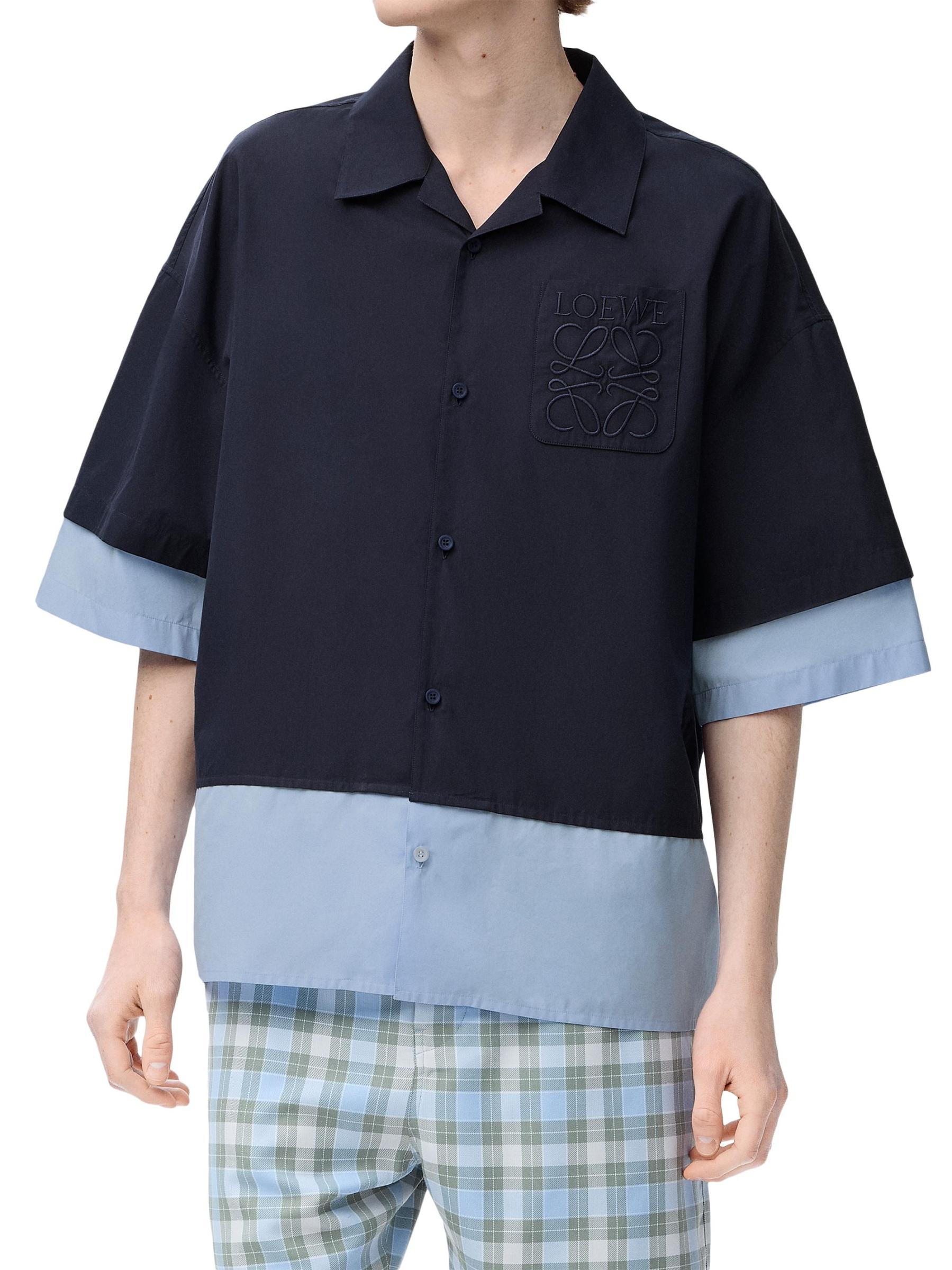 يتميز قميص Trompe l'oeil من LOEWE بتصميم ثنائي اللون وتفاصيل تجانس مع حروف الشعار في جيب الصدر.