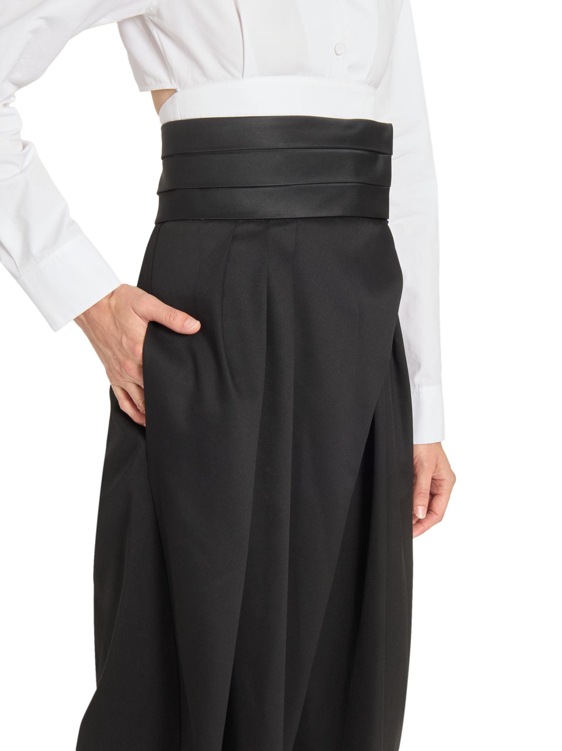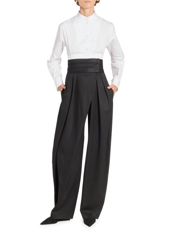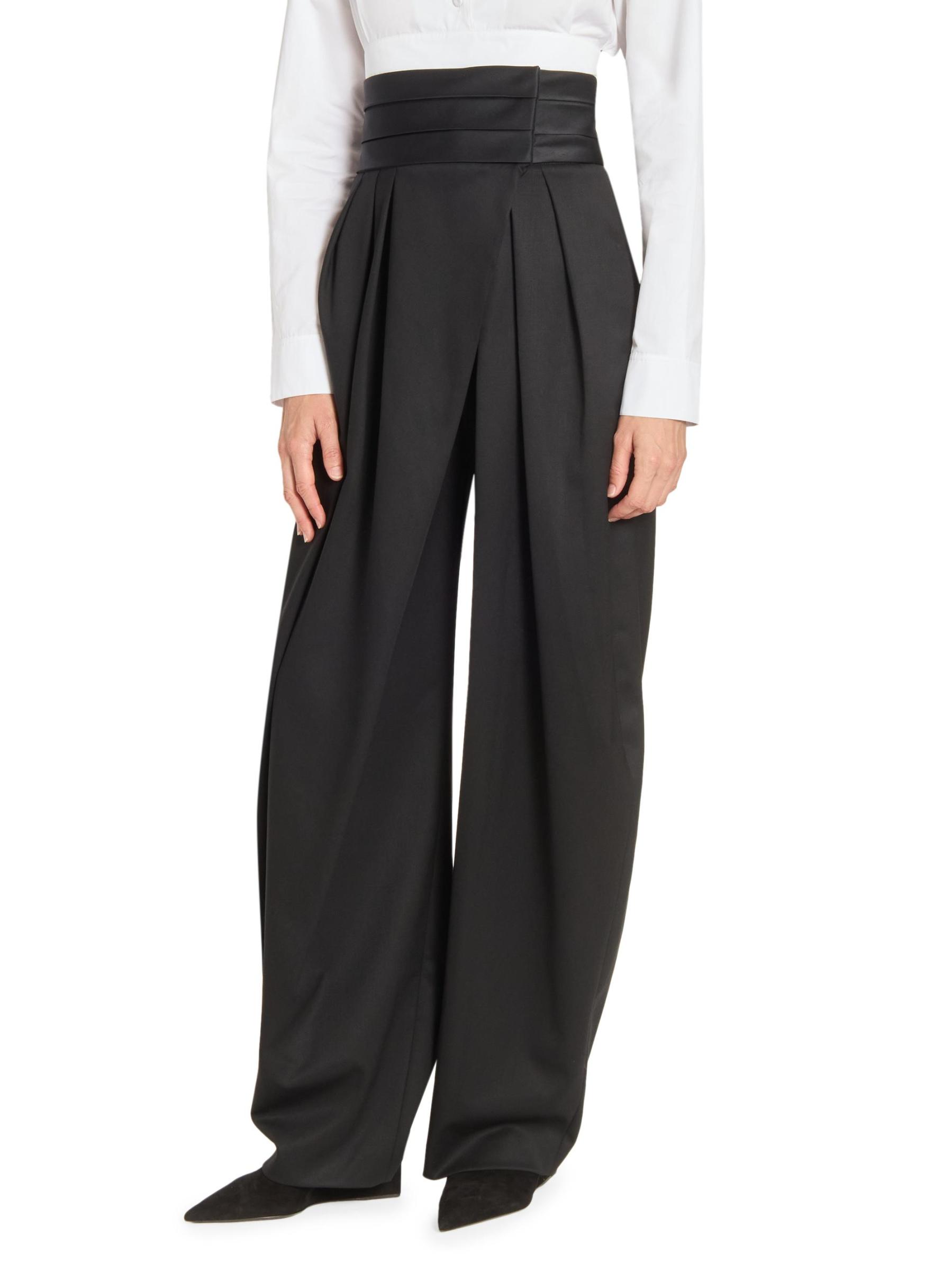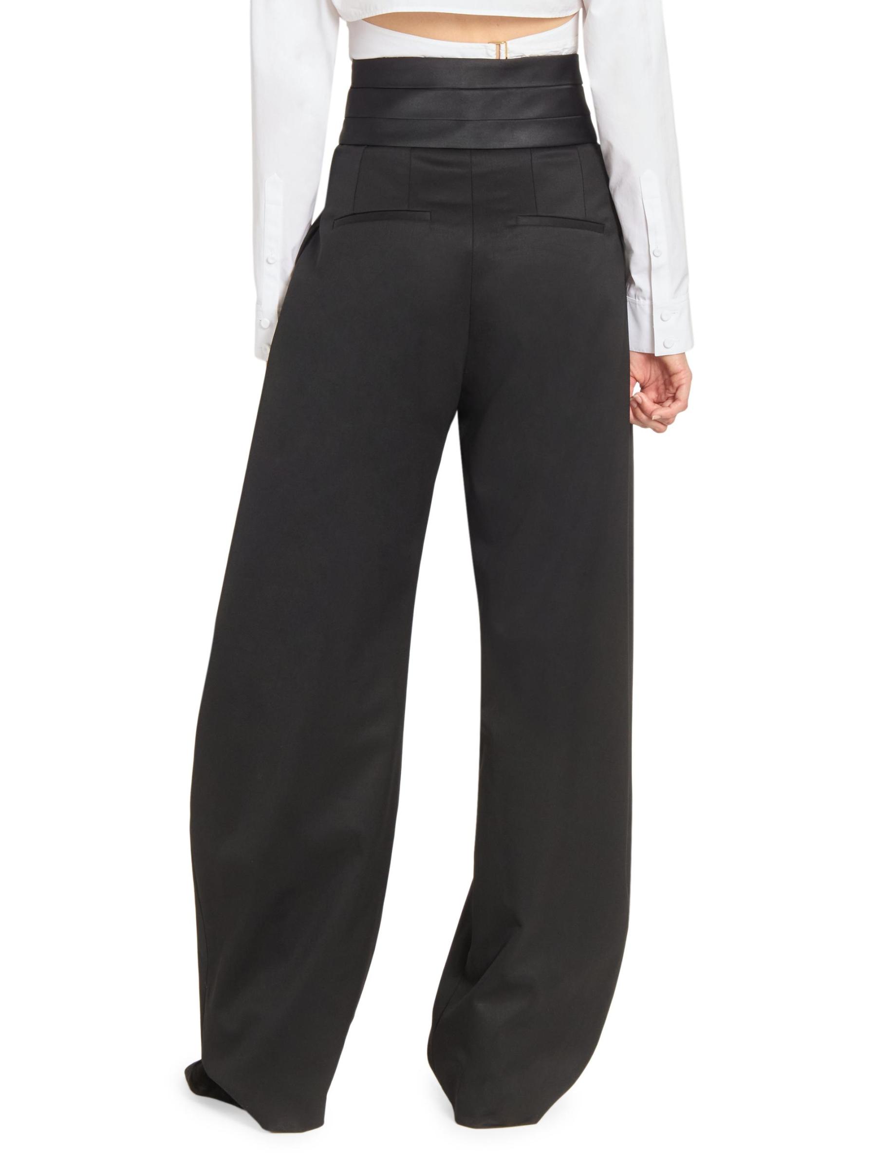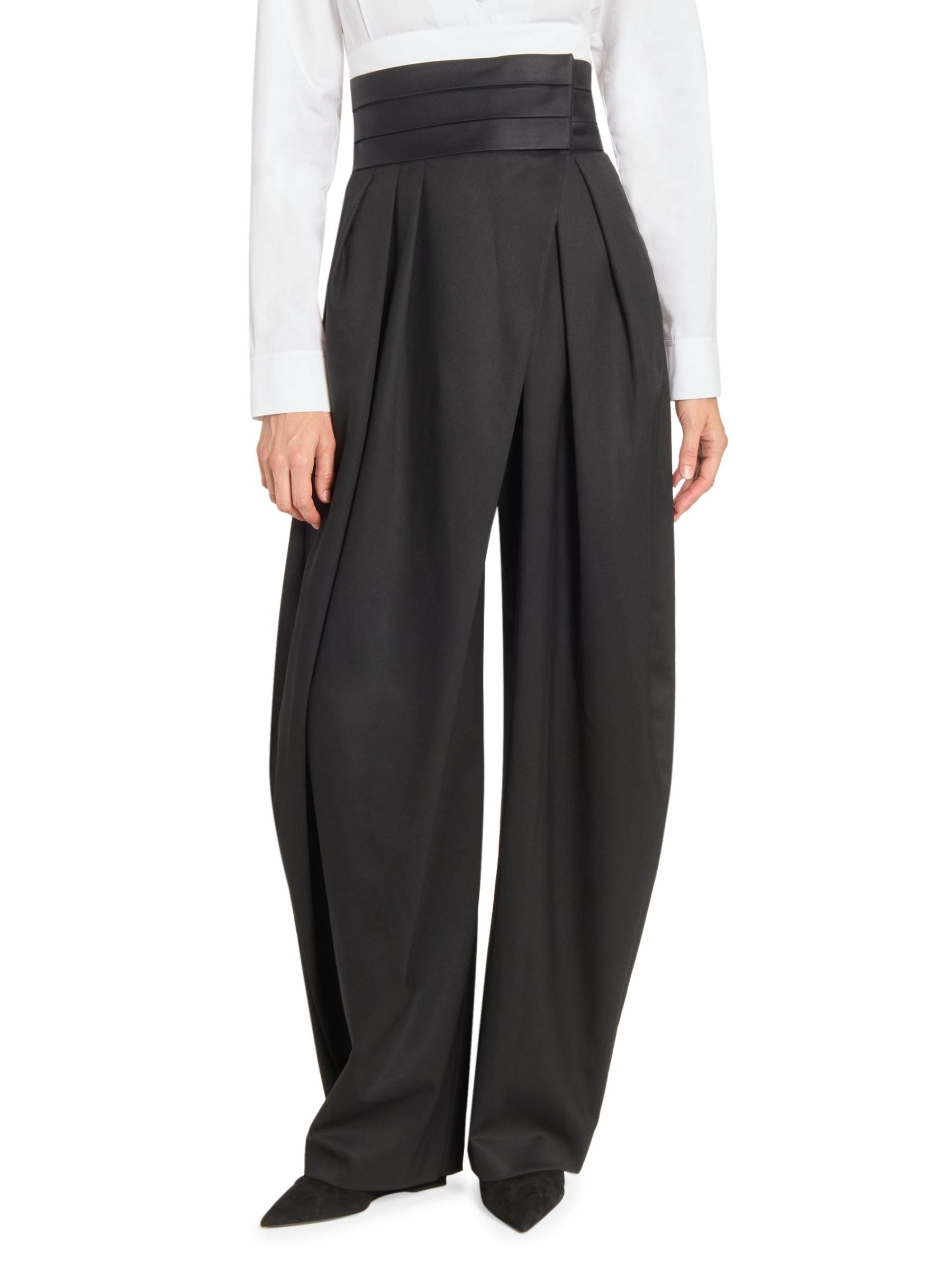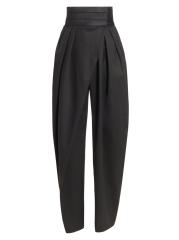 صُنعت سراويل التوكس من Alaïa في إيطاليا من الصوف المطاطي، وهي مصممة بشكل مرتفع على شكل ساقين أسطوانيين مع تصميم مطوي. يتميز هذا الزوج بخصر مستوحى من الساتان.