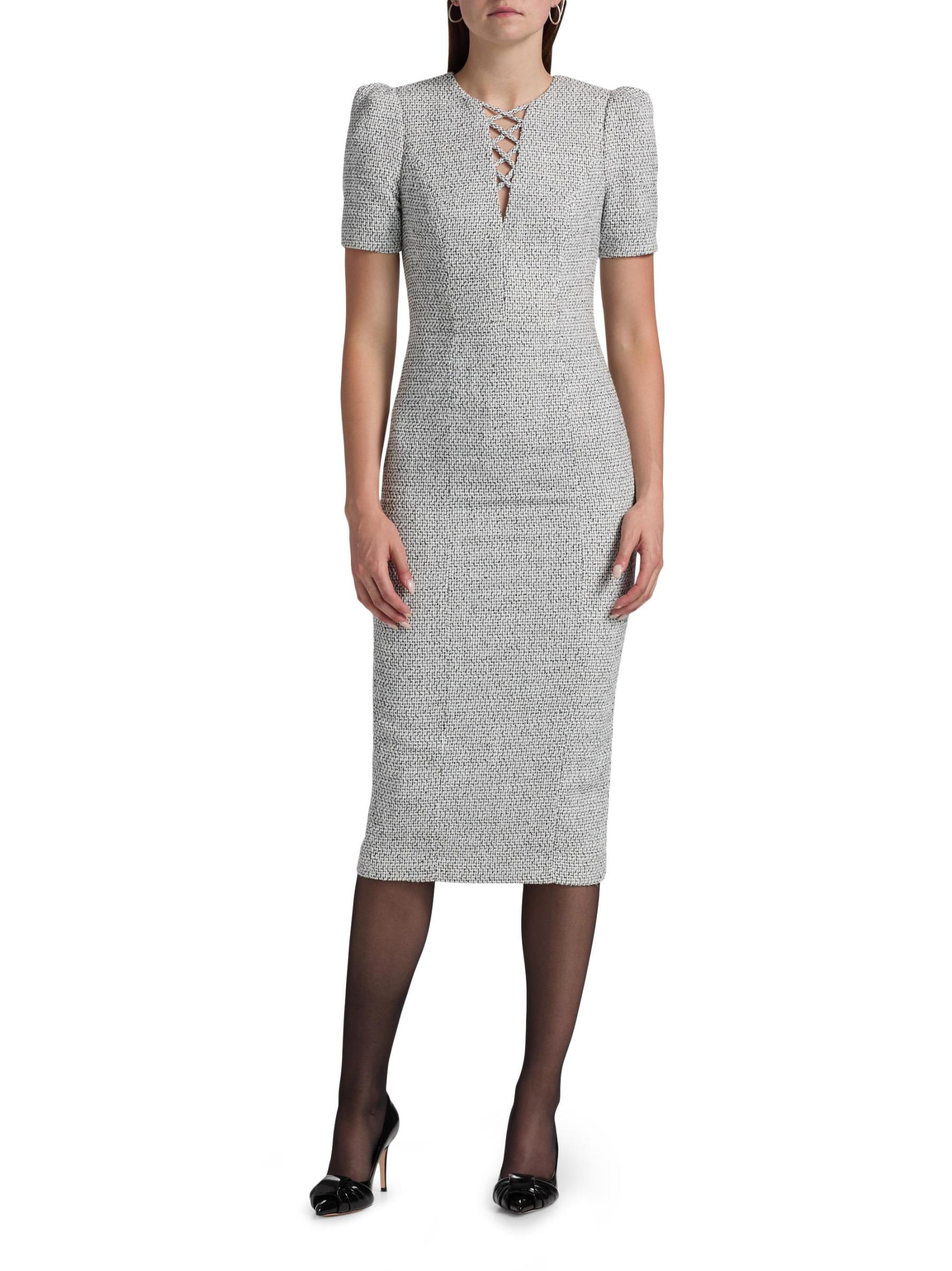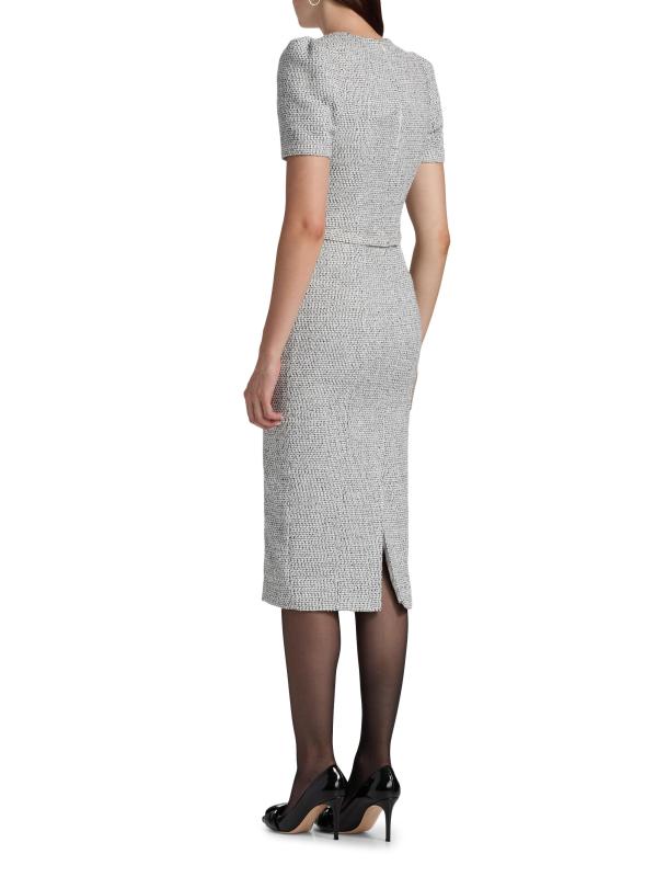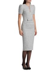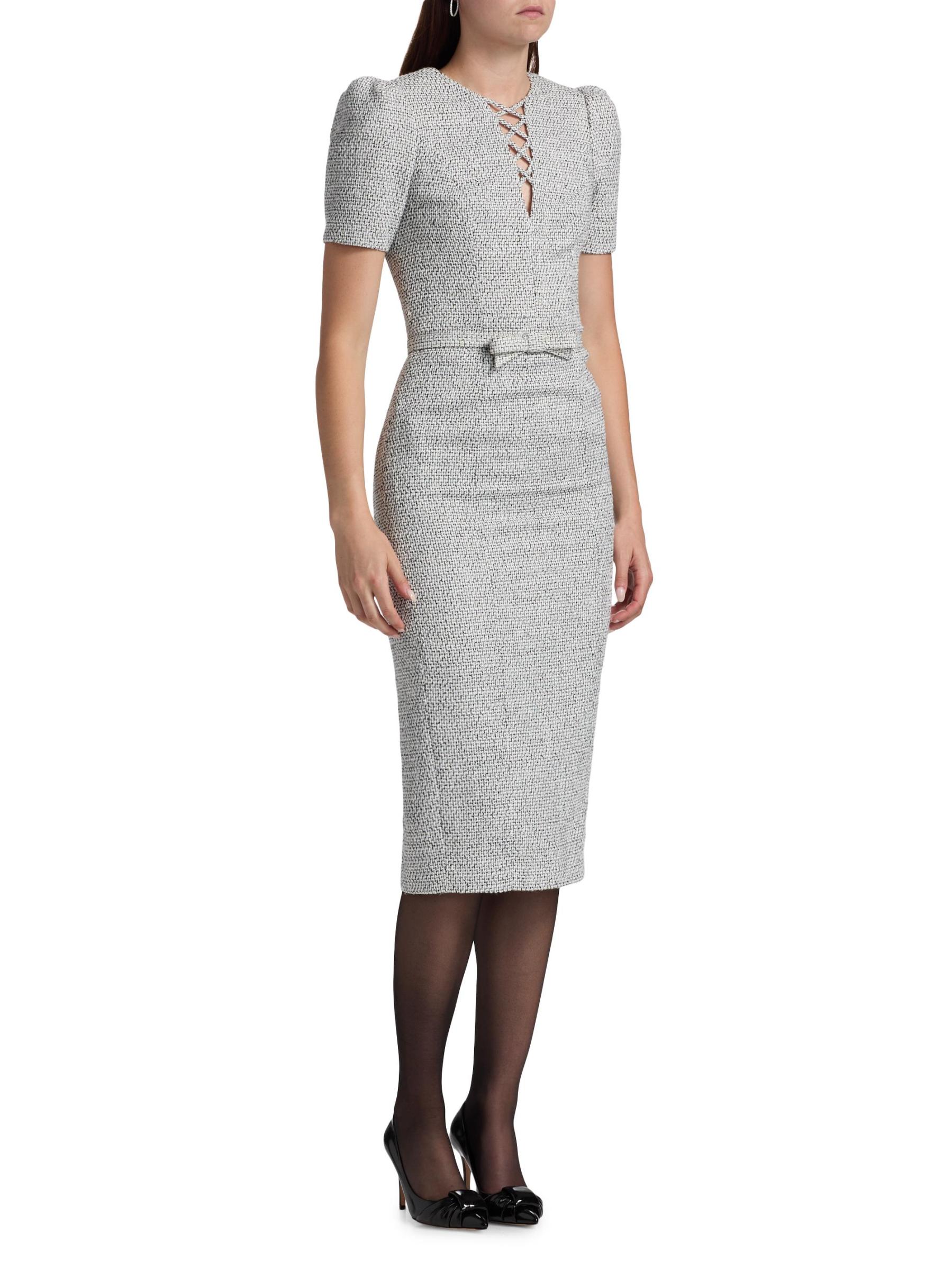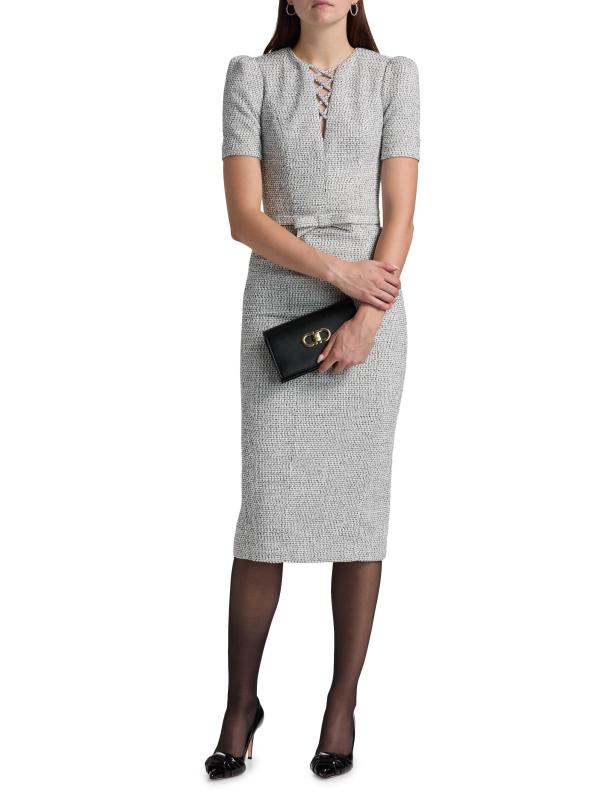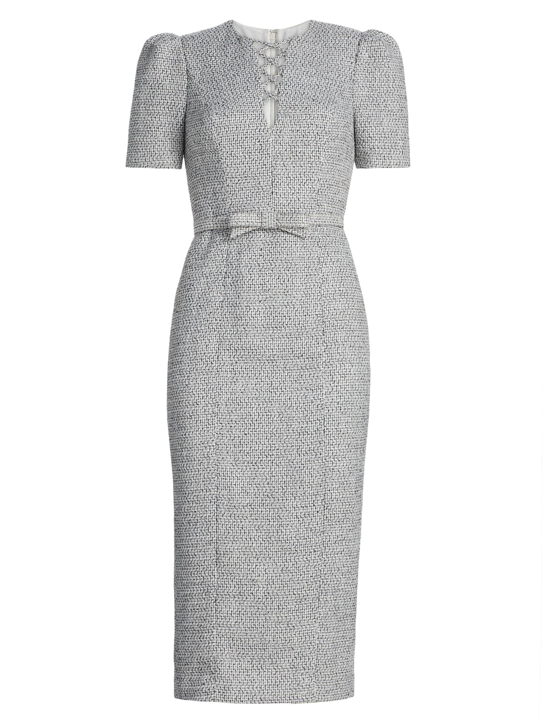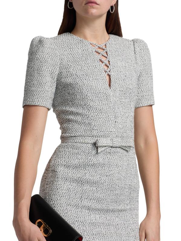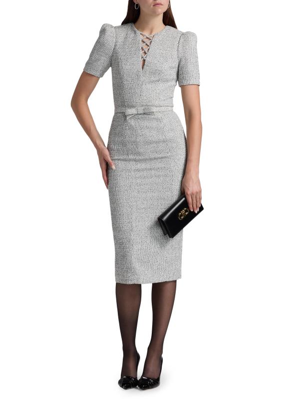 تم تصميم فستان الكوكتيل الضيق هذا من Badgley Mischka المصنوع من التويد بلونين مع حزام وقوس ثابت لتشكيل الخصر.