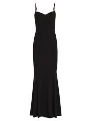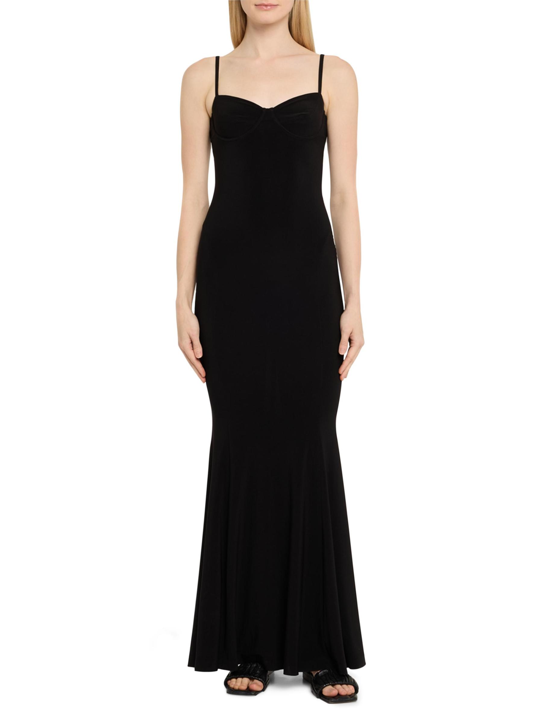 صُنع فستان Norma Kamali من قماش قابل للتمدد بأربعة اتجاهات ومزين بحافة على شكل ذيل السمكة. تم تصميم هذا الطراز النحيف مع تقويرة جميلة وأكواب مصبوبة بأسلاك سفلية لمزيد من البنية.