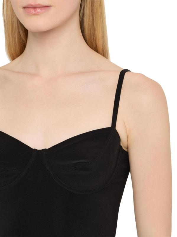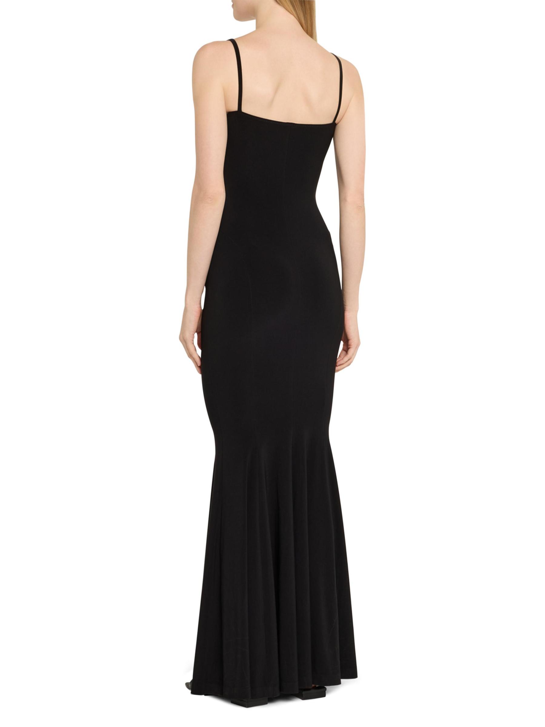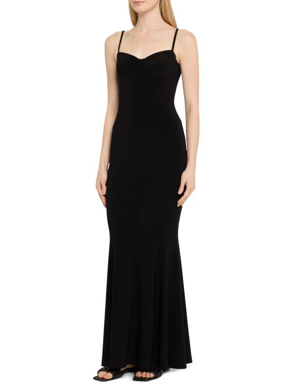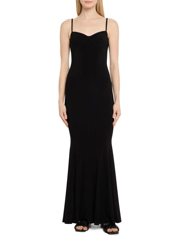 صُنع فستان Norma Kamali من قماش قابل للتمدد بأربعة اتجاهات ومزين بحافة على شكل ذيل السمكة. تم تصميم هذا الطراز النحيف مع تقويرة جميلة وأكواب مصبوبة بأسلاك سفلية لمزيد من البنية.فتحة رقبة على شكل قلب أحزمة سباغيتي سلك سفلي إغلاق مخفي بوليستر/سباندكس تنظيف جاف مستوردة