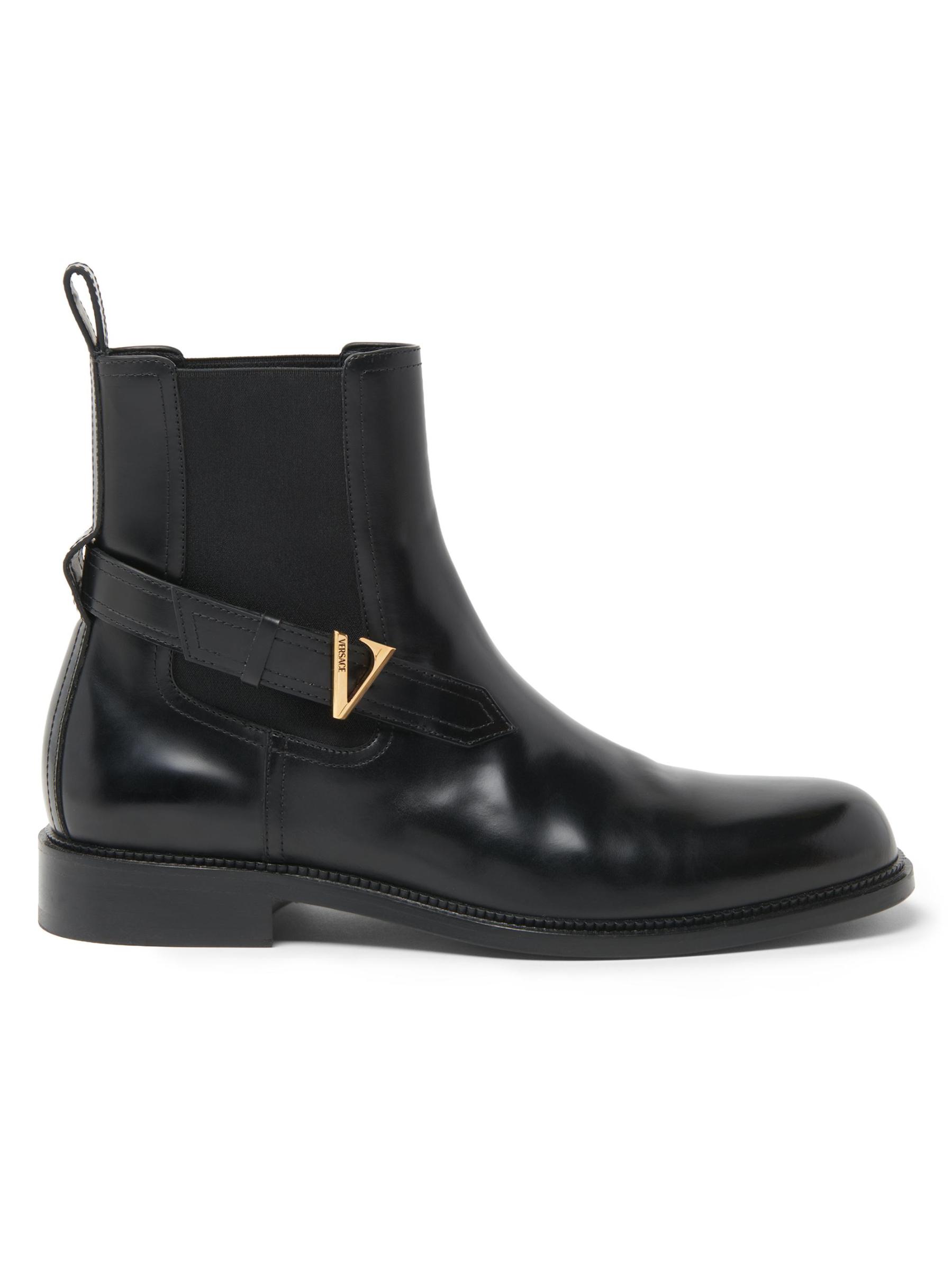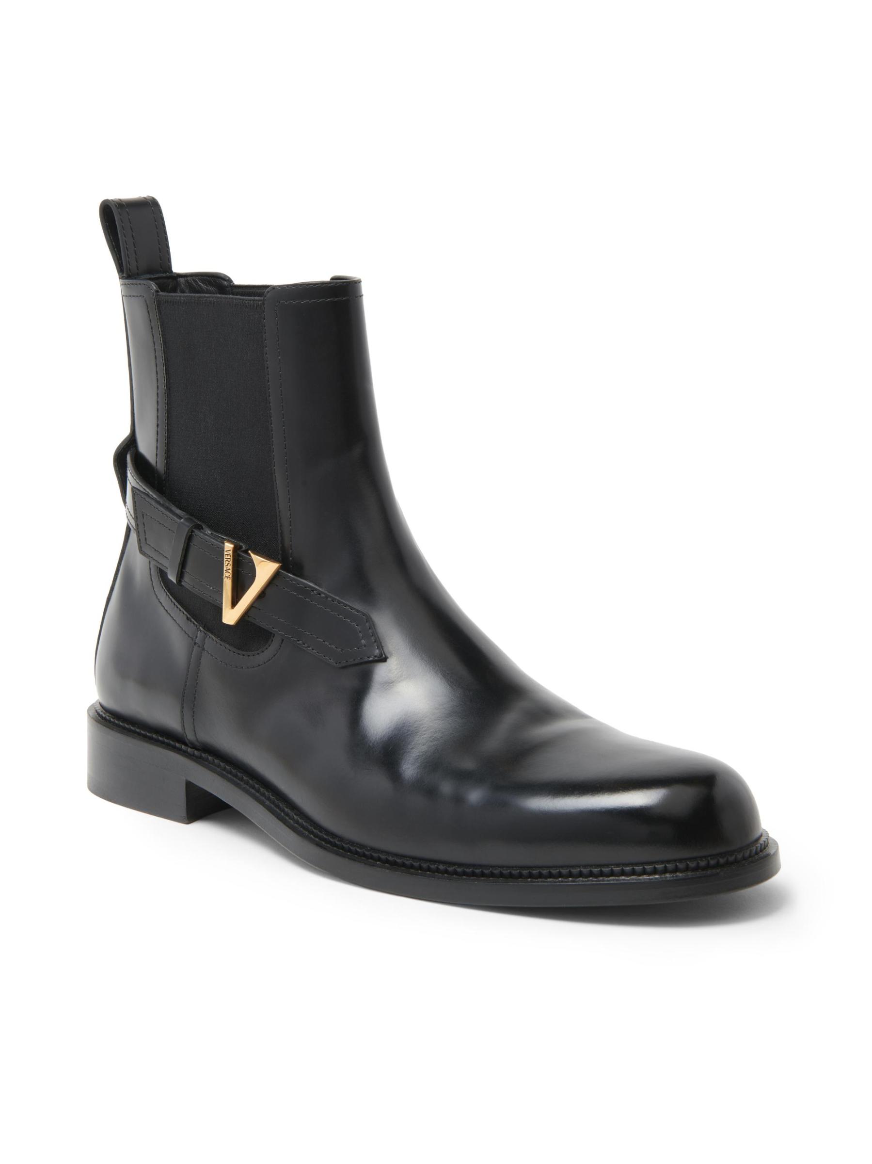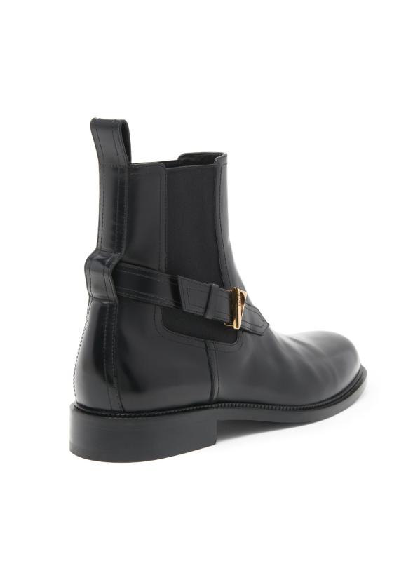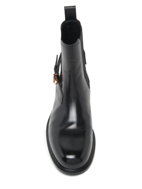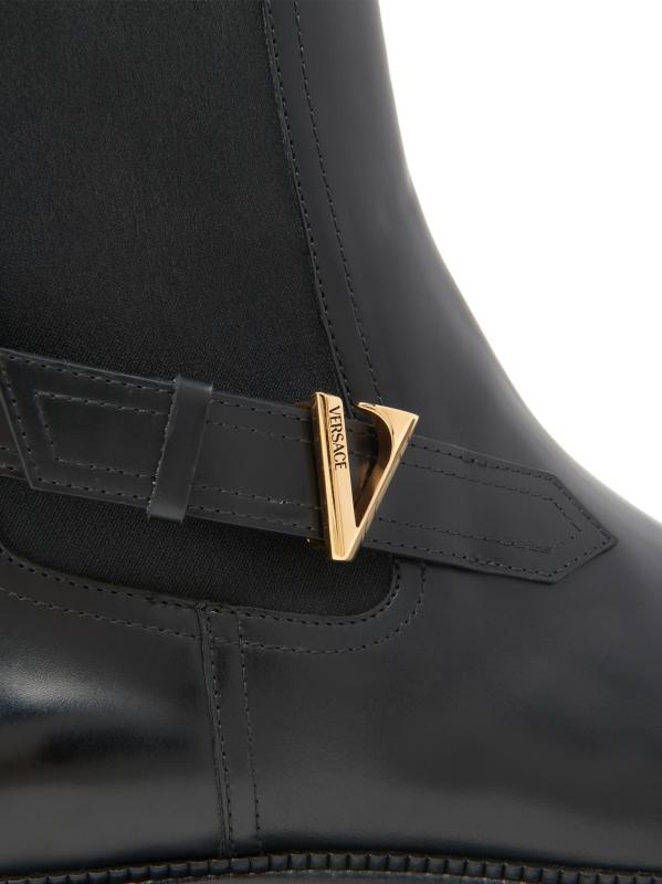 صُنعت جوارب فيرساتشي هذه من الجلد مع ألواح مطاطية عند الكاحل. يُضفي حزام الكاحل الملتف والمزيّن بإبزيم باللون الذهبي على شكل حرف «V» ملمسًا راقيًا لهذا الأسلوب.
