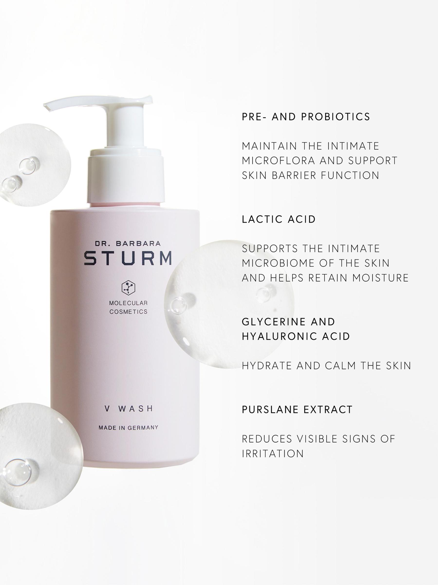 غسول V WASH المعتدل من Dr. Barbara Sturm ينظف المنطقة الحميمة بلطف، دون إزالة الزيوت الطبيعية أو الرطوبة من الجلد، ويستخدم تركيبة رغوية مخملية ورقيقة مناسبة للتنظيف اليومي، وكذلك للبشرة الحساسة. يحتوي على البروبيوتيك المسبق والبروبيوتيك الذي يساعد في الحفاظ على ميكروبيوم الجلد وقيمة pH الطبيعية المثلى لمنع البكتيريا غير الصحية والخميرة من التكاثر والتسبب في العدوى. يعمل البانثينول والجلسرين على تهدئة وترطيب البشرة ويوفر حمض الهيالورونيك ترطيبًا مهدئًا. يحتوي مستخلص الرجلة على تأثير مضاد للأكسدة، حيث يعمل على تهدئة البشرة وتقليل علامات التهيج المرئية. تم اختبار V WASH من قبل أطباء أمراض النساء.