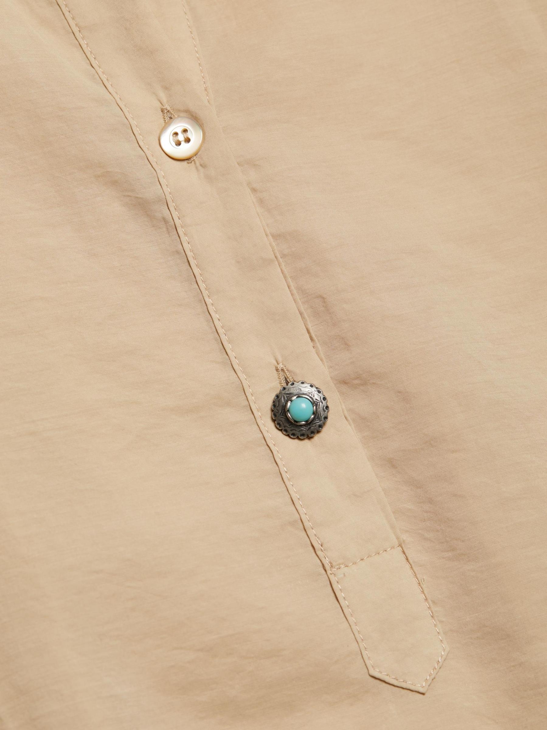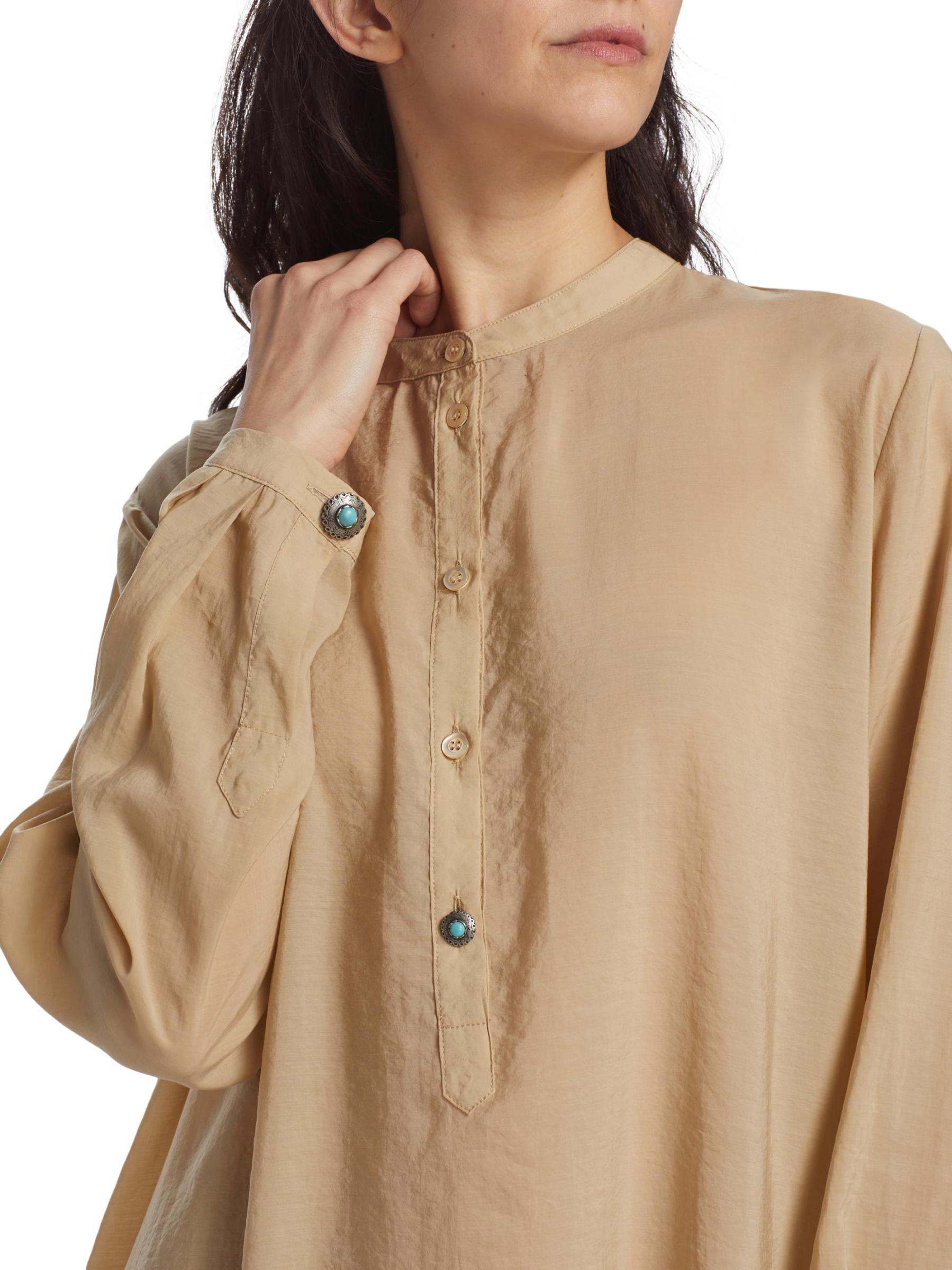 يأتي قفطان فاليري ذو الأكمام الطويلة من فورتيلا في صورة ظلية كبيرة الحجم ويتميز بياقة ماندرين مهيكلة وجوانب أنيقة منقسمة. أزرار للإغلاق مزيّنة بالفيروز تُضفي مزيدًا من الأناقة على الأسلوب الرائع.