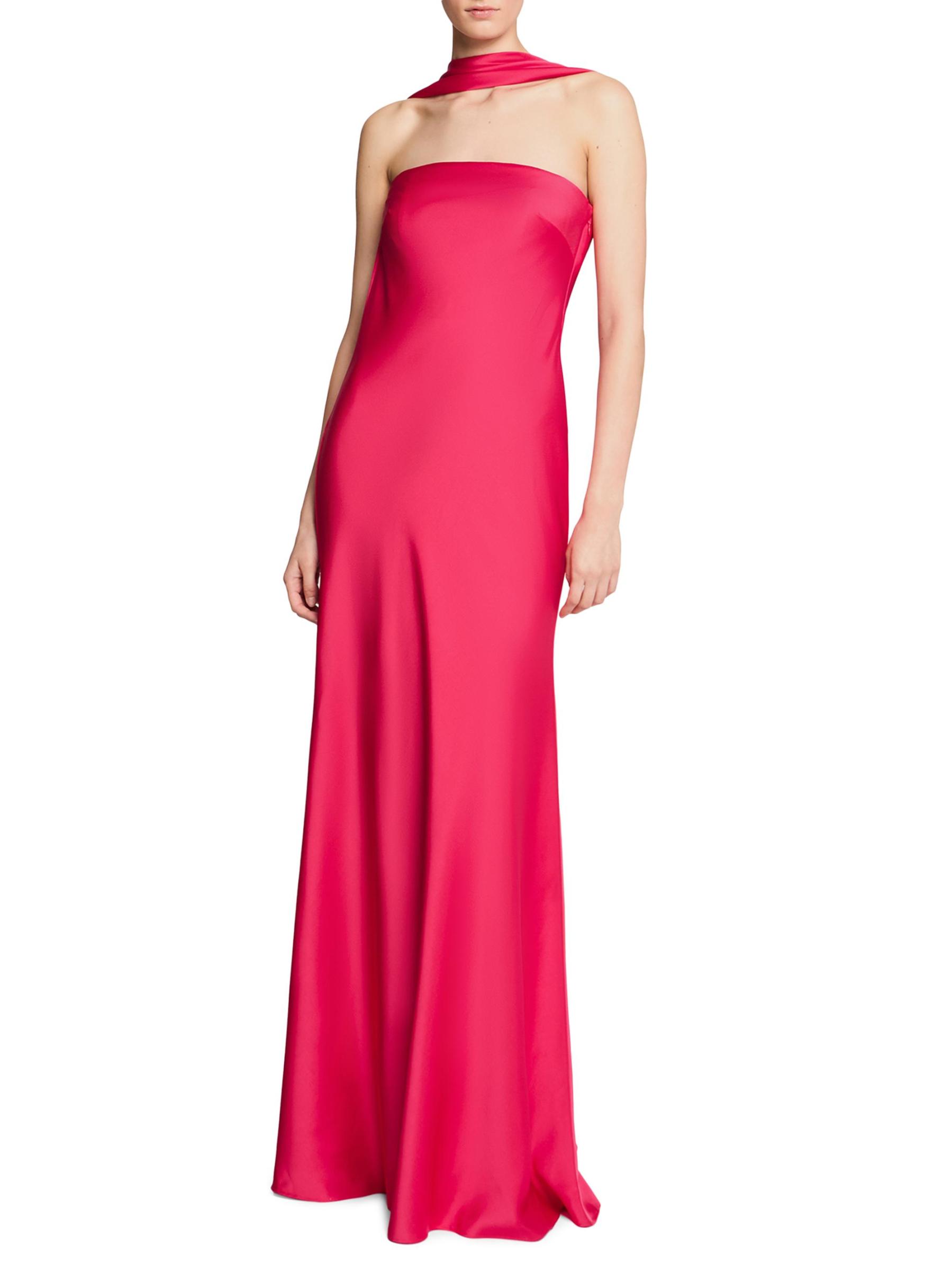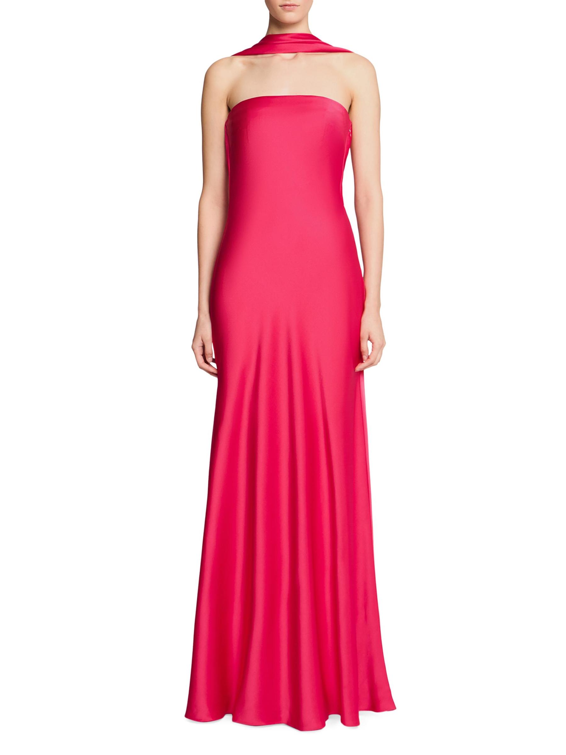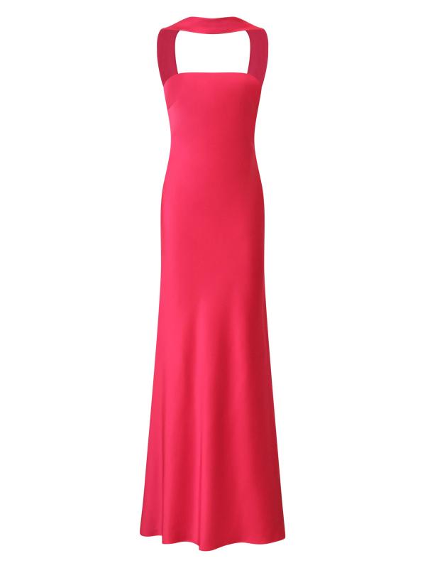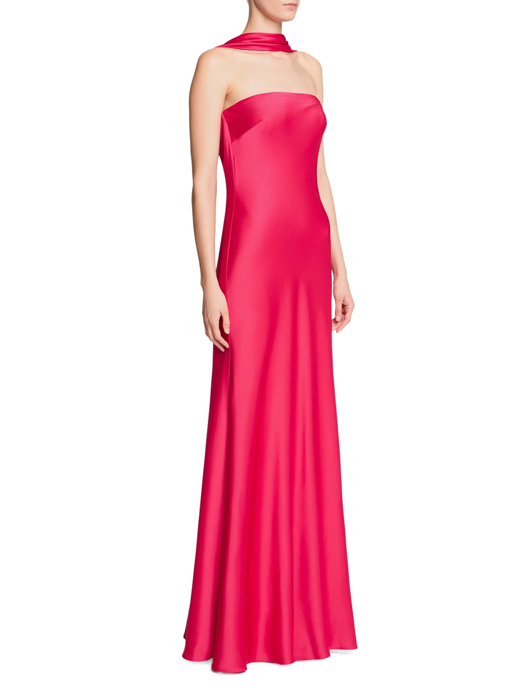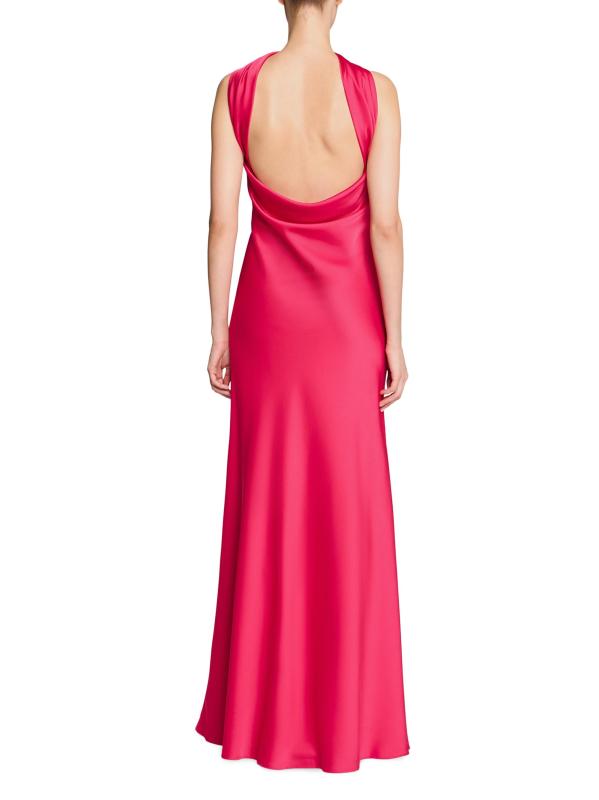 يتميز فستان Vali هذا من Halston، المصنوع من الساتان المدعوم بالكريب، بتقويرة على شكل رسن عكسي وظهر مفتوح.