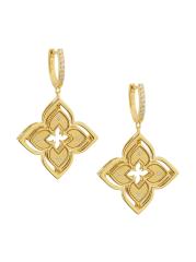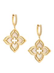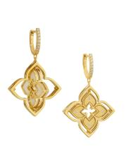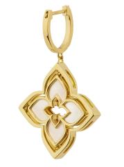 من مجموعة الأميرة الفينيسية. تتميّز أقراط روبرتو كوين، المصنوعة من الذهب الأصفر عيار 18 قيراطًا، برسمة زهرة دوارة تتحول من أربع مرصعات من عرق اللؤلؤ إلى ألماس مرصّع باللون الوردي، مما يتيح خيارين مختلفين للتصميم. يقوم المصمم الشهير بتوقيع كل قطعة بحجر ياقوت واحد يوضع في مكان مخفي.