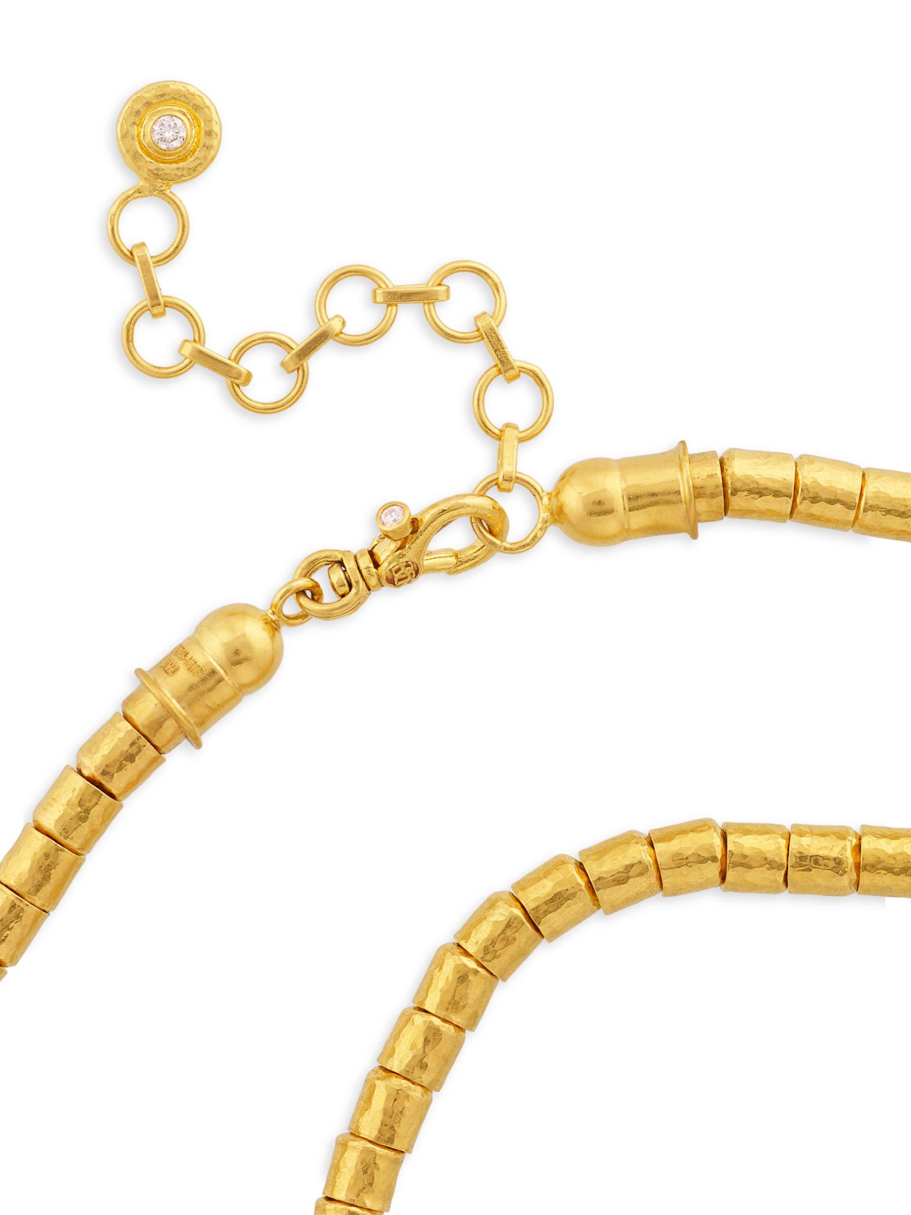 من مجموعة Vertigo. تم تزيين هذه القلادة البسيطة من Gurhan بماسة واحدة عند المشبك، وهي مزينة بخرز مطروق من الذهب الأصفر عيار 24 قيراطًا.الماس، 0.14 طن مكعب درجة لون الماس: G-H درجة وضوح الماس: SI2 حبات من الذهب الأصفر عيار 24 قيراطًا مشبك لوبستر من الذهب الأصفر عيار 22 قيراطًا مستوردة