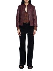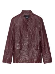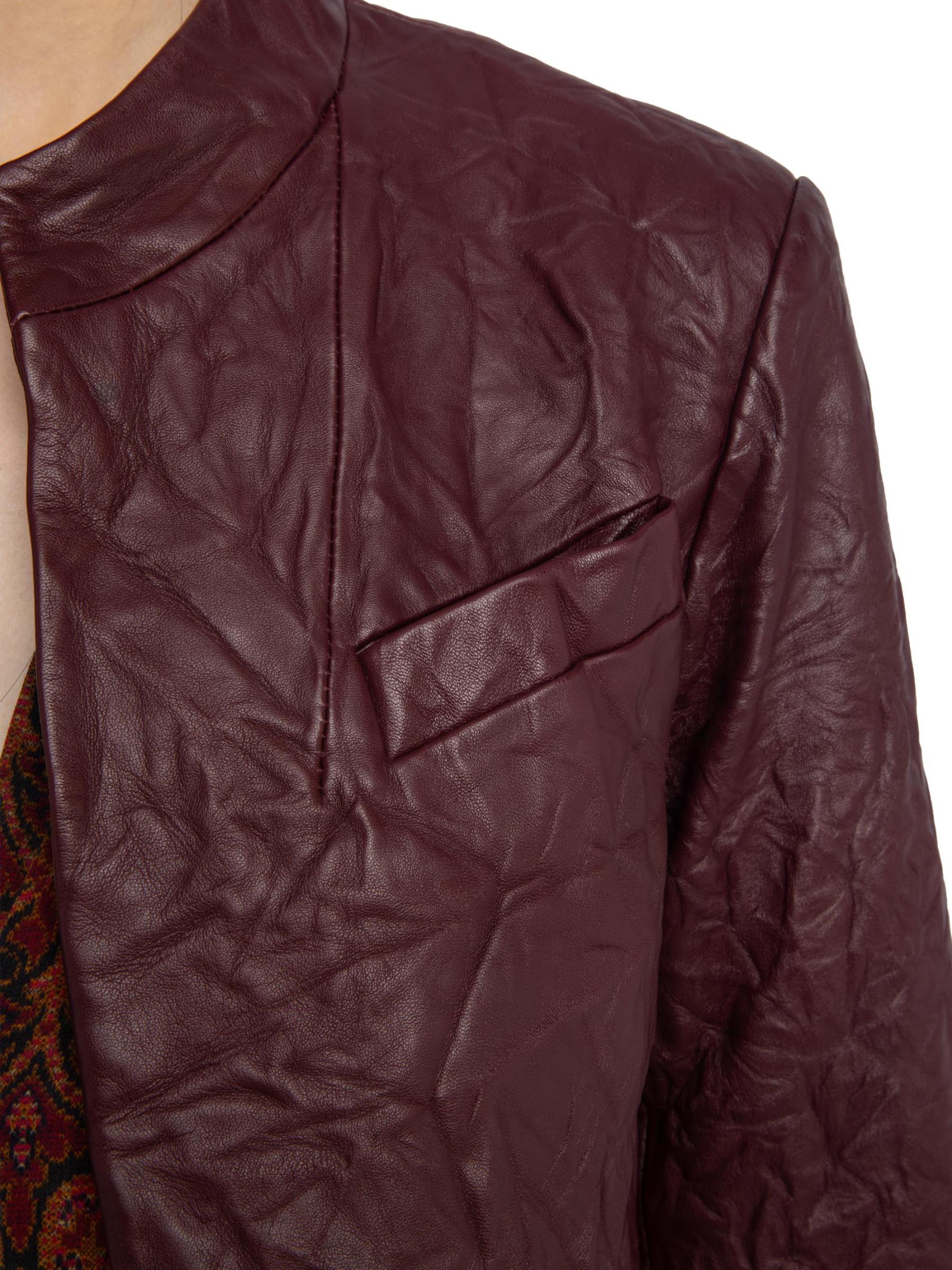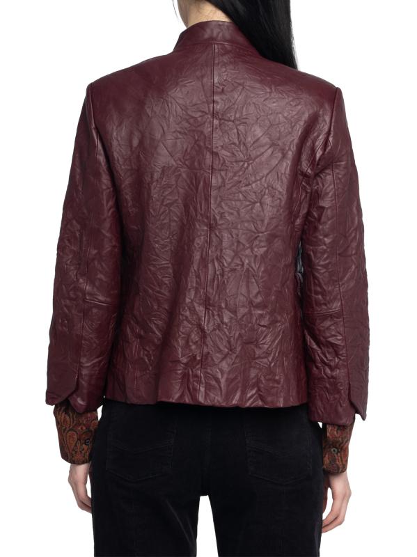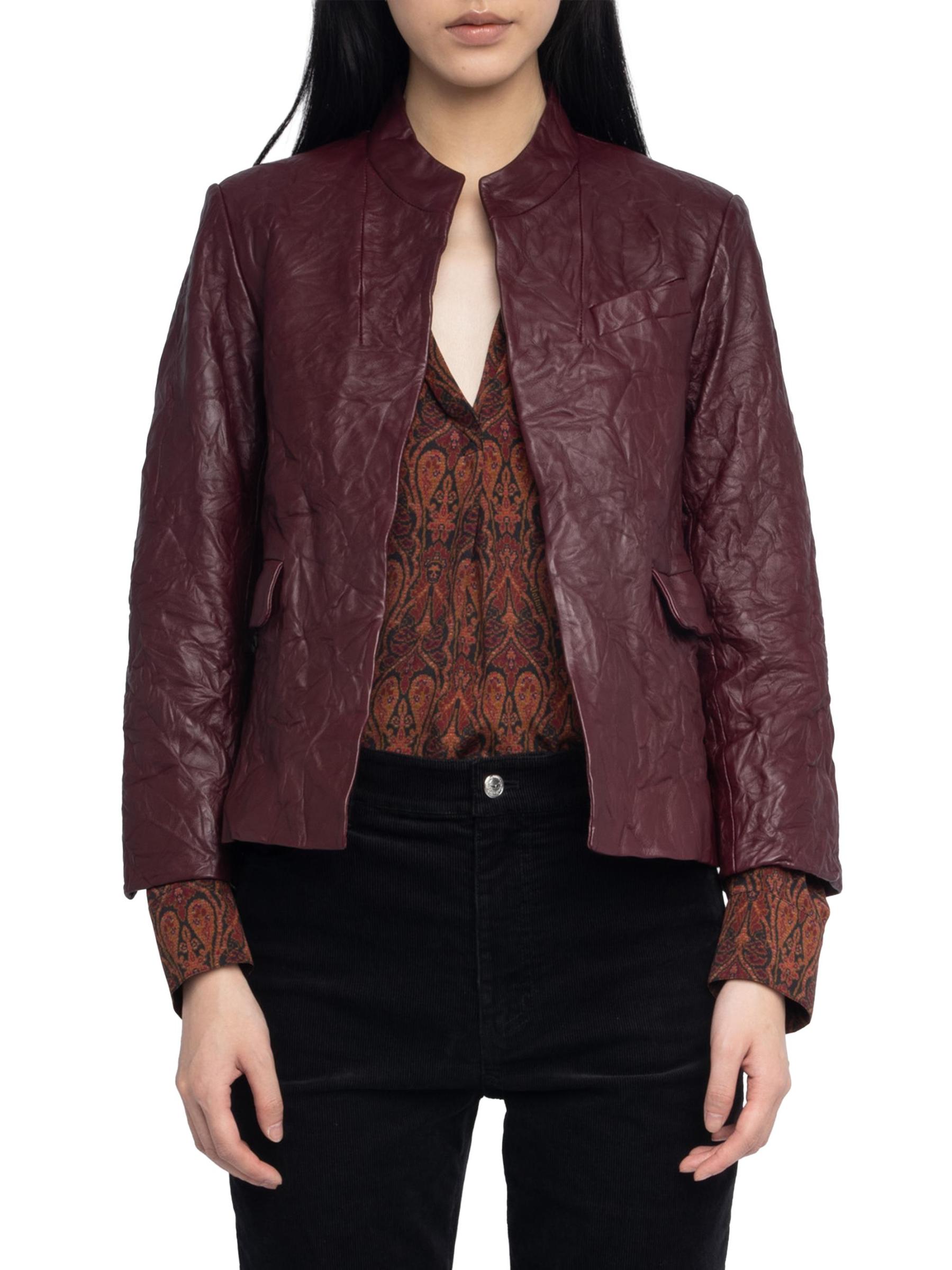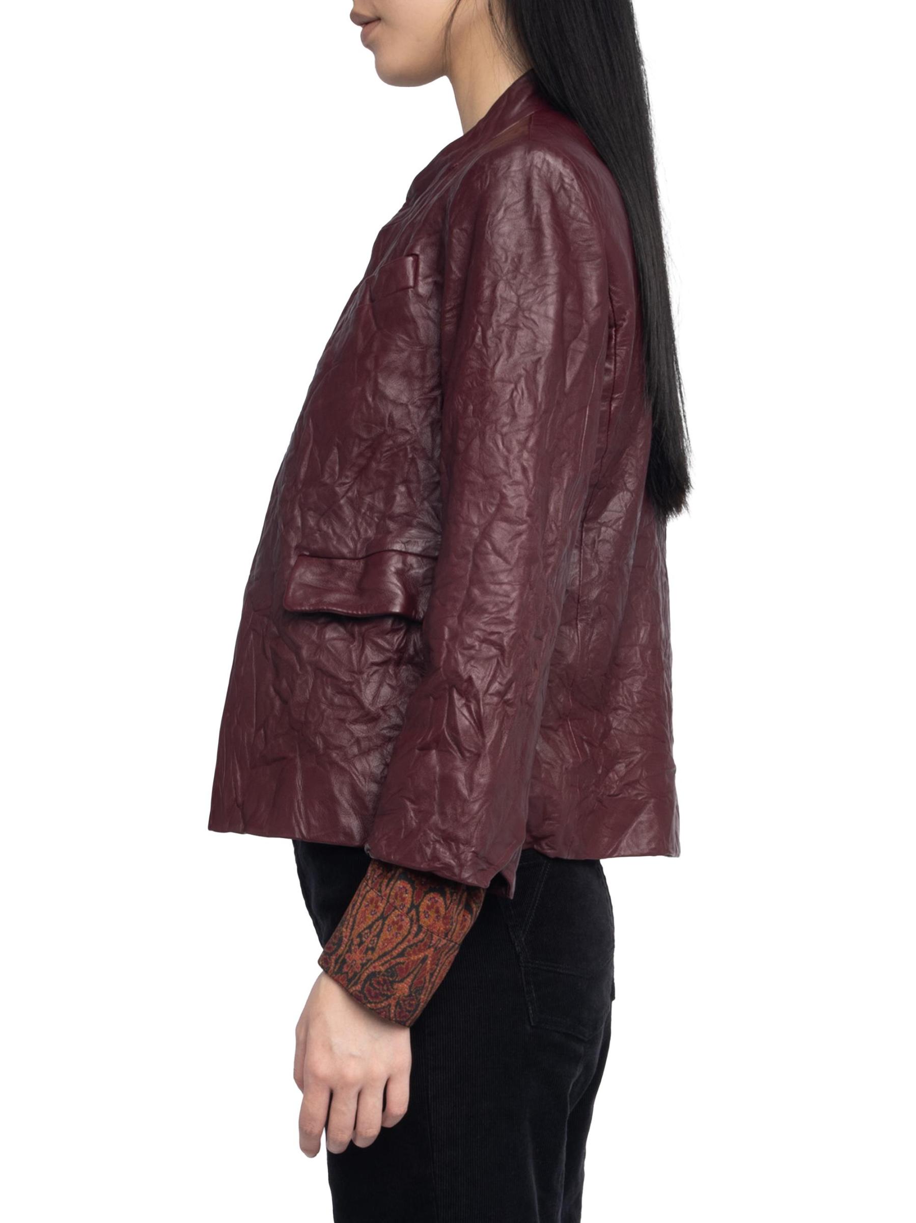 Voltaire المصنوعة من الجلد المجعد بأكمام ثلاثة أرباع وتصميم مفتوح من الأمام.ياقة ستاند أكمام بطول ثلاثة أرباع جيوب جانبية قابلة للطي واجهة مفتوحة مصنوع من جلد الخراف بنسبة 100% التنظيف الجاف من قبل أخصائي الجلد مستوردة